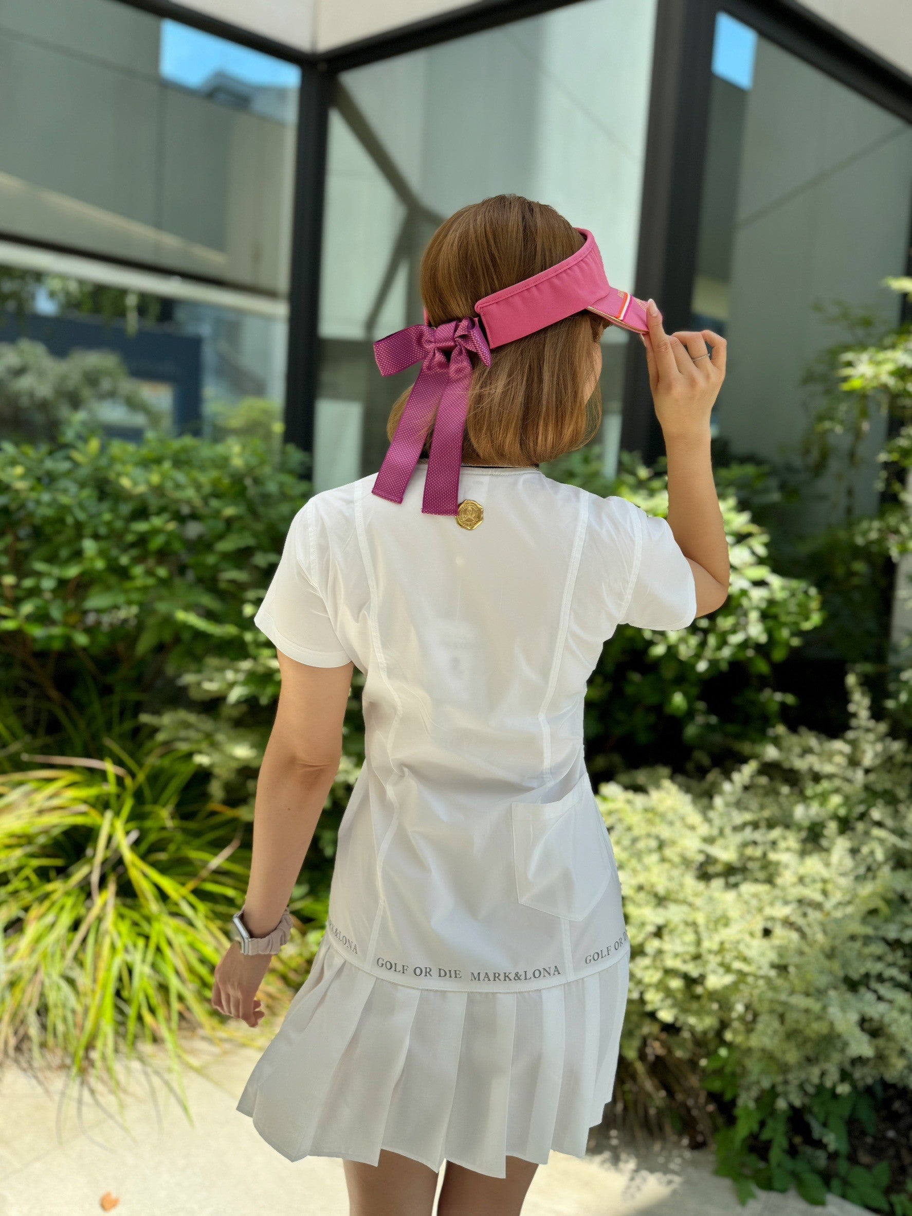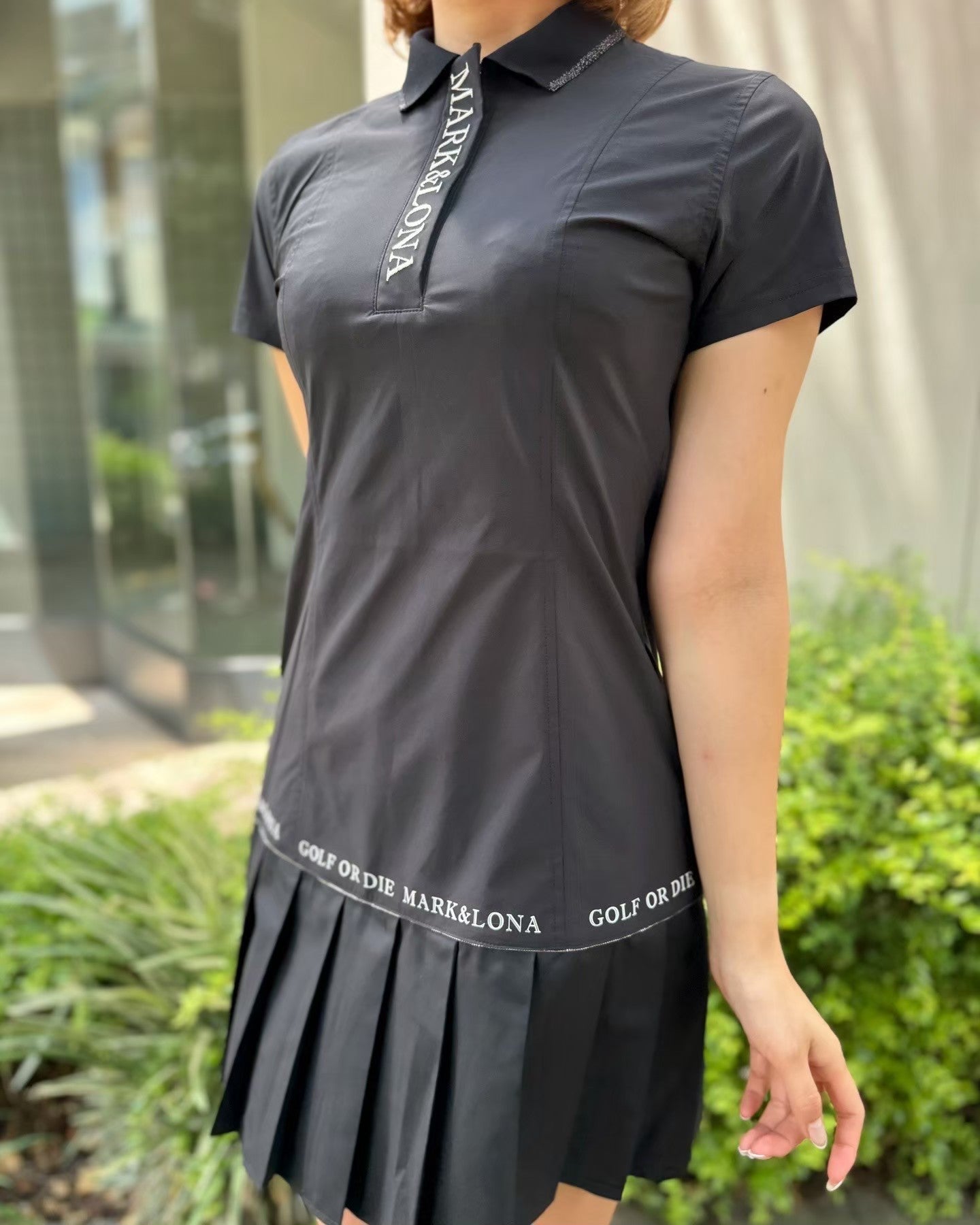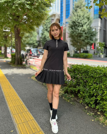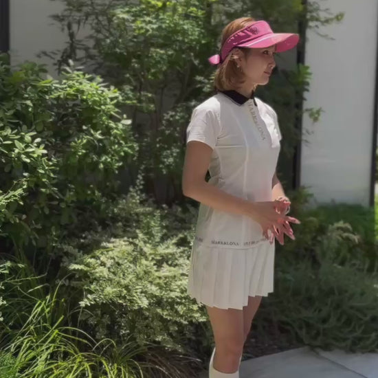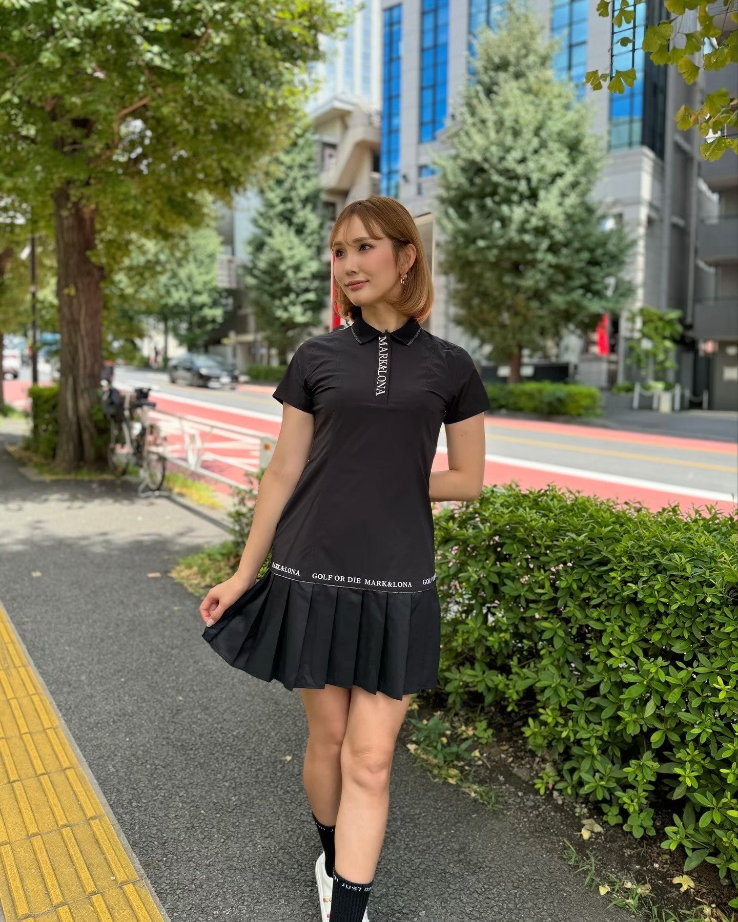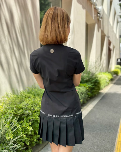 シルエットを綺麗に見せるパネルラインのワンピース。程よくゆとりがあるウエストシェイプのエレガントなプリンセスライン。裾をプリーツで切り替え、足捌きの良さへも配慮。プリーツ切り替え部分にはツヤ感の中にメタリックなパイピングコードを挟んだ繊細なテクニックがポイント。撥水性、UVカット、接触冷感、防シワ性を兼ね備えた機能素材の使用で快適にプレーをサポートします。
