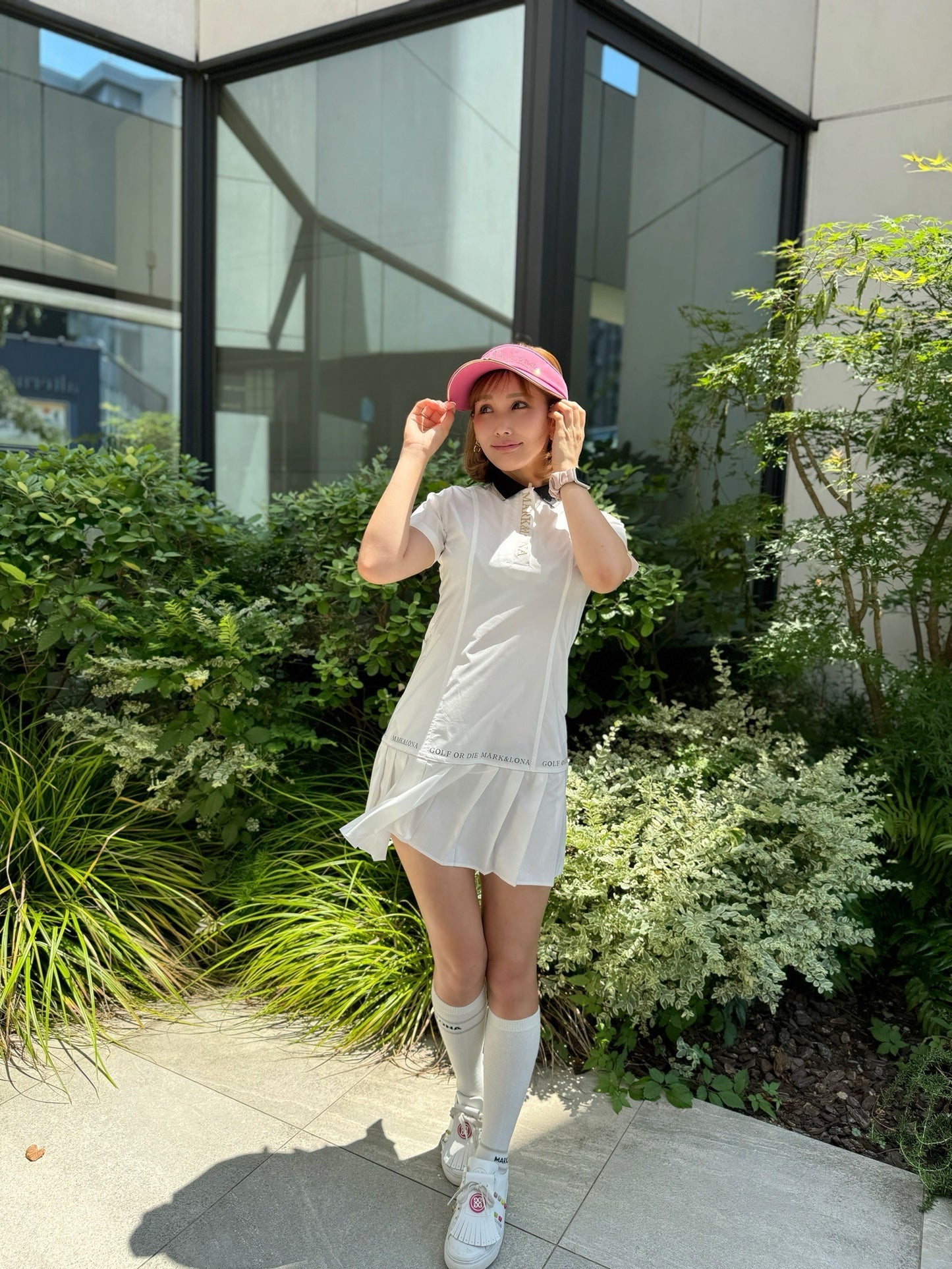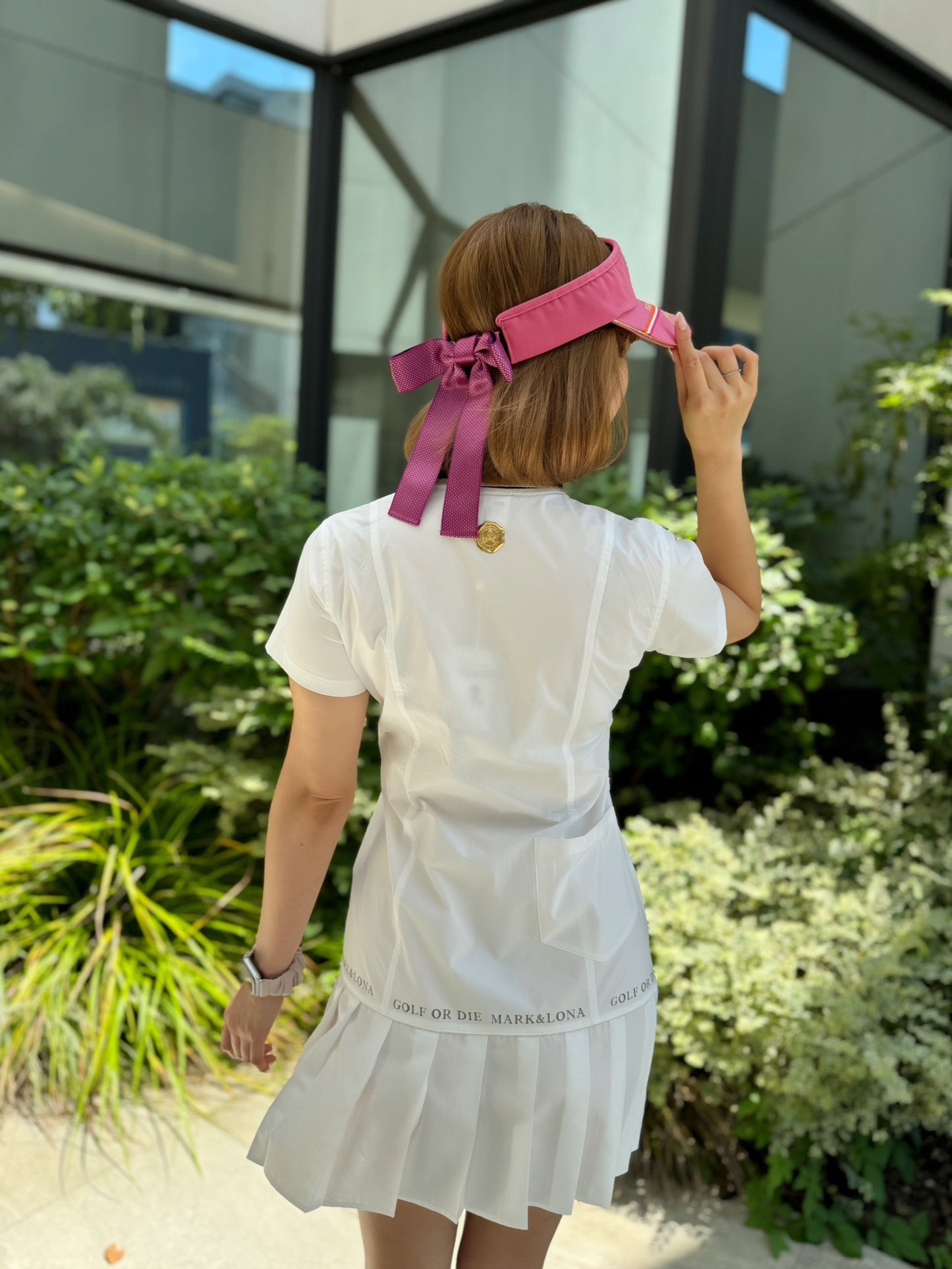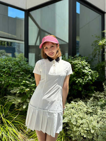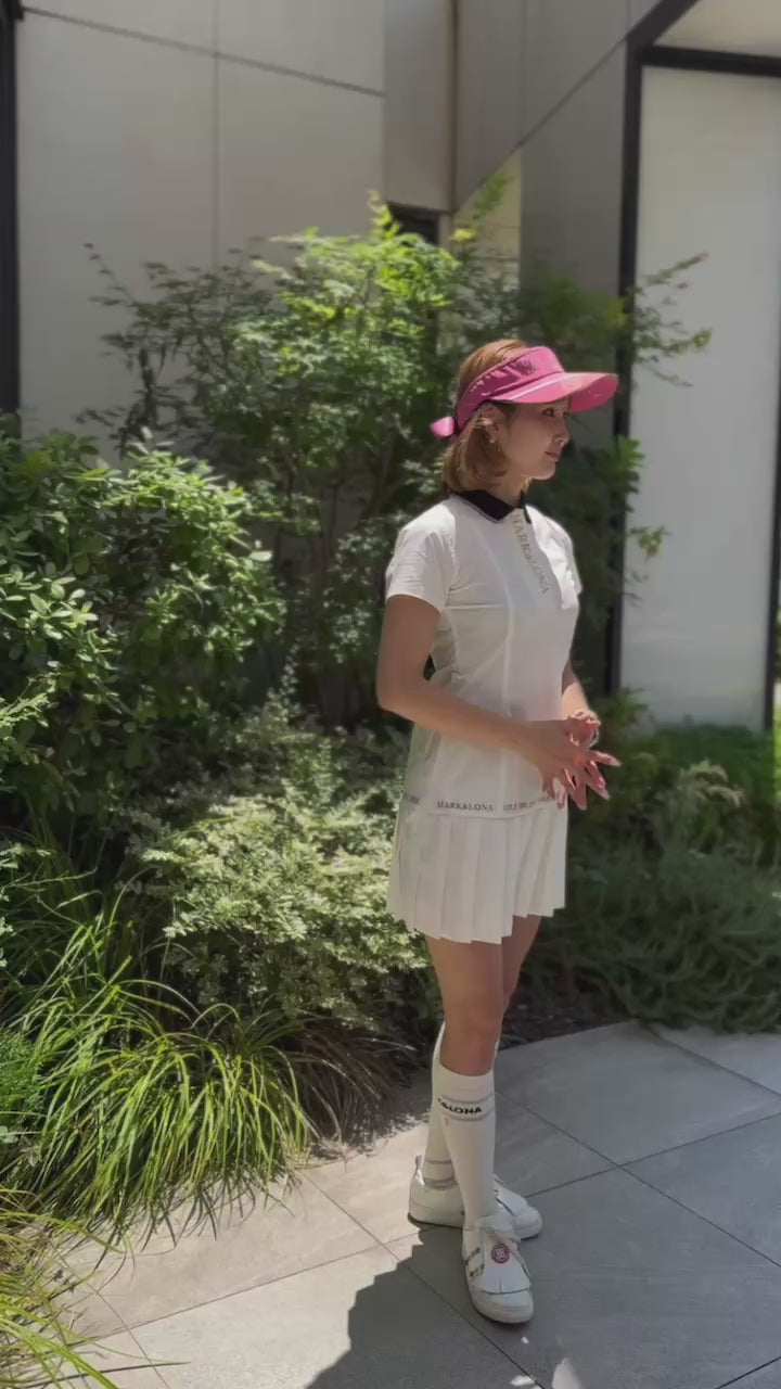 シルエットを綺麗に見せるパネルラインのワンピース。程よくゆとりがあるウエストシェイプのエレガントなプリンセスライン。裾をプリーツで切り替え、足捌きの良さへも配慮。プリーツ切り替え部分にはツヤ感の中にメタリックなパイピングコードを挟んだ繊細なテクニックがポイント。撥水性、UVカット、接触冷感、防シワ性を兼ね備えた機能素材の使用で快適にプレーをサポートします。