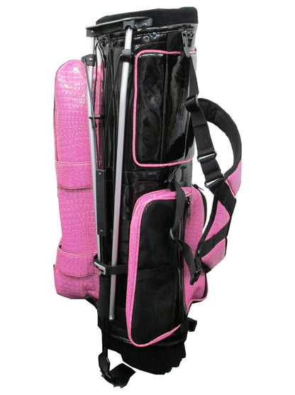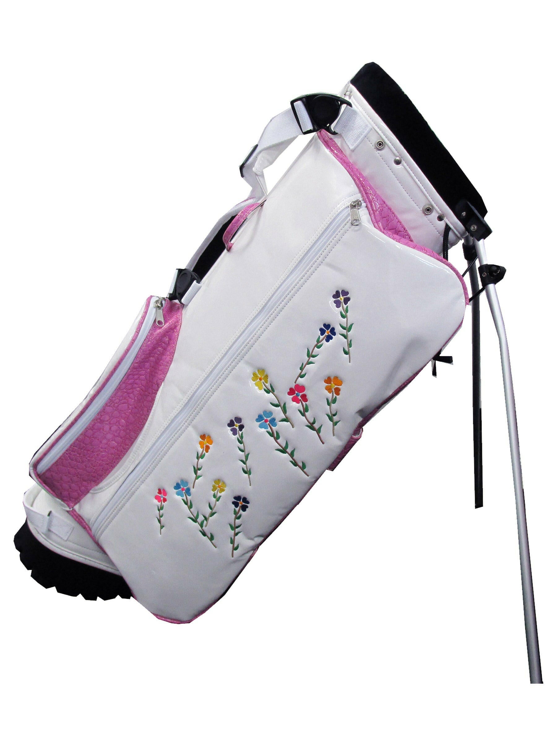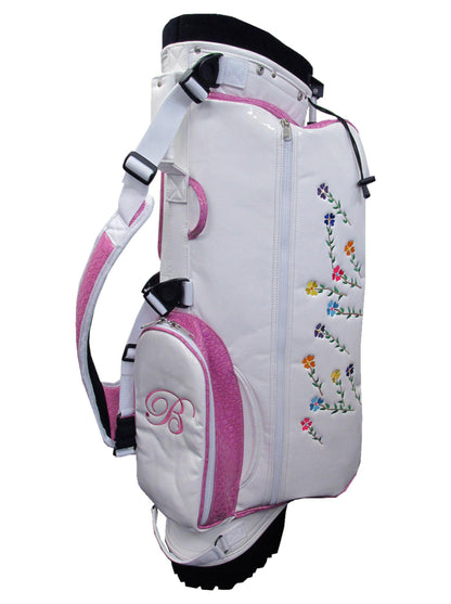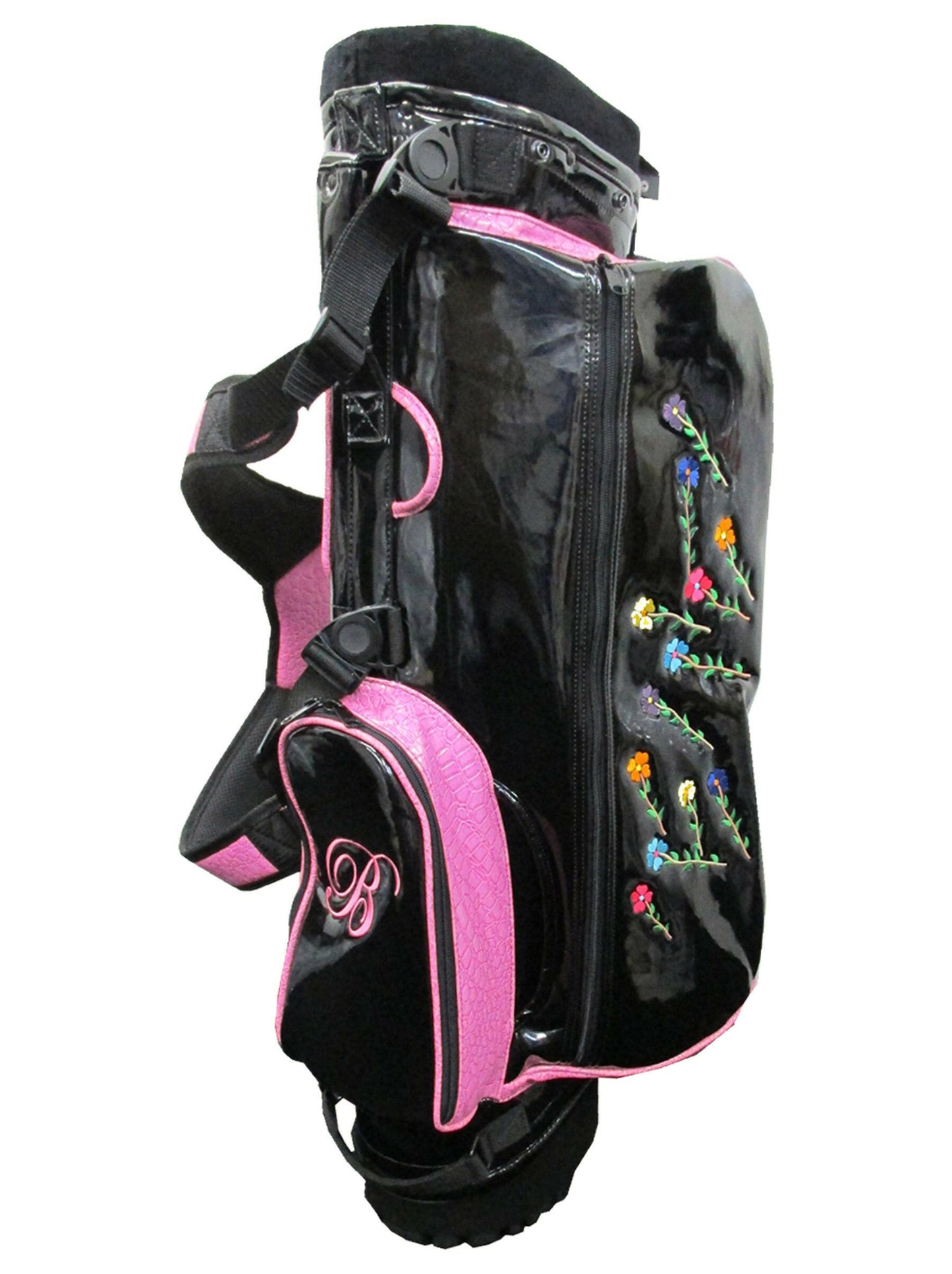 光沢のあるホワイトのエナメル素材にピンク型押しのアクセント、フラワーの刺繍が入ったキュートなスタンドバッグです。