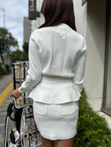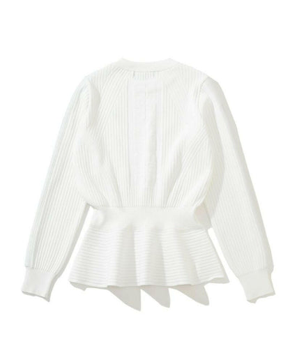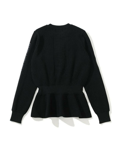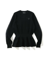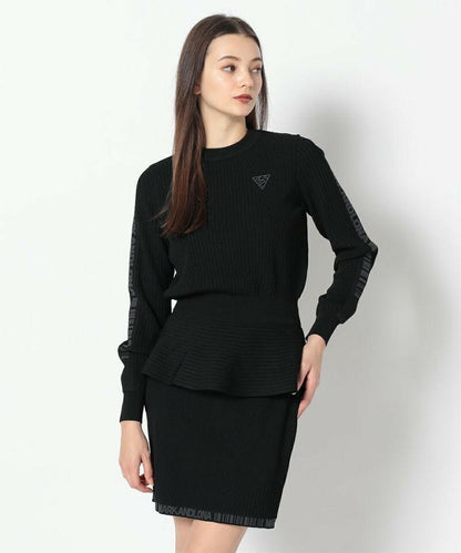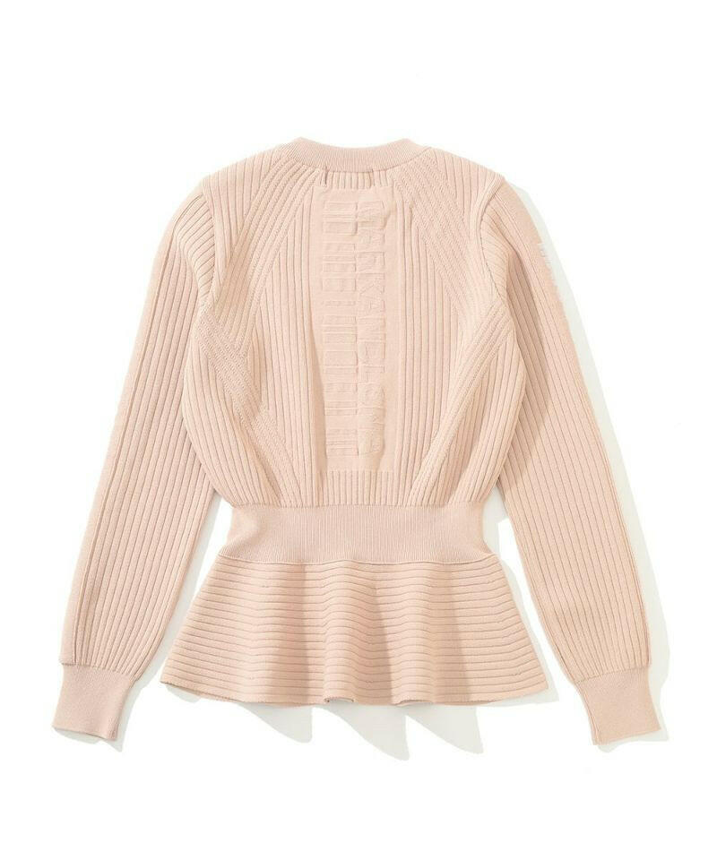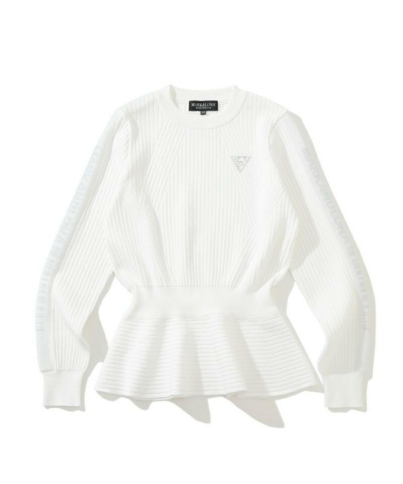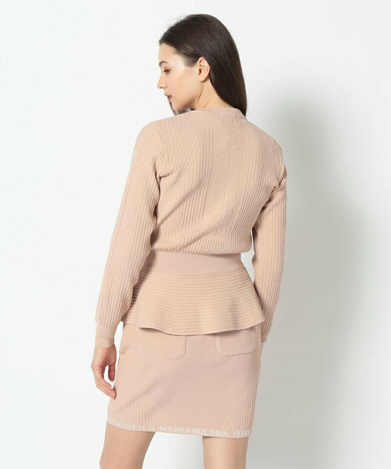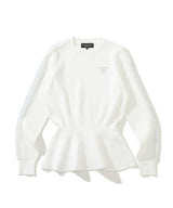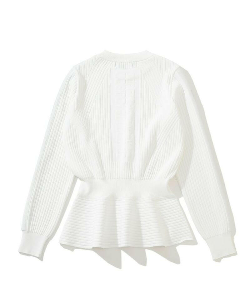 ボディラインに沿うように編み地の向きを計算、まわりと差がつくロゴジャカードペプラムニットプルオーバー。左胸に刺繍でCODEトライアングルロゴ、背中にジャカードでCODEロゴ、袖山部分にジャカードでCODEロゴをそれぞれ表現しました。ハイストレッチの素材を活かした、身体に緩やかにフィットするソフトフィットシルエット。インナーを着用していただく想定で設計されています。セットアップデザインのスカート(MCW-3C-AE54)とのコーディネートがおすすめです。