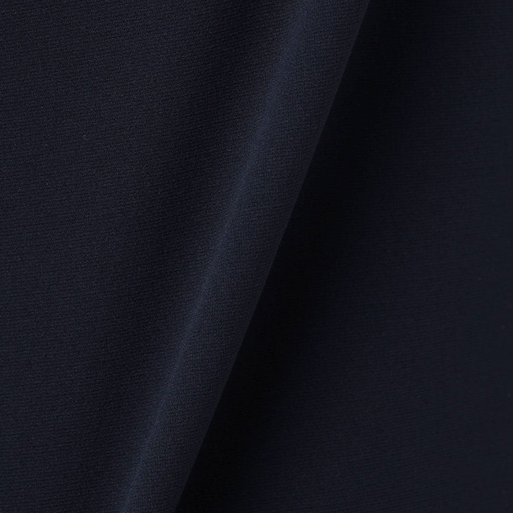 高密度に編み上げた編地の中に高弾性の糸を配置して全体を締めあげることで、たらつきにくく織物のようなハリ・コシと、ニット素材ならではの伸縮性を兼ね備えています。