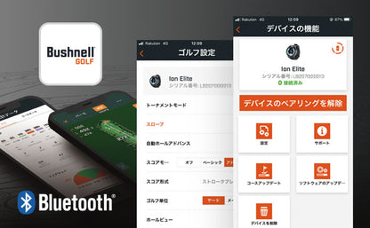 無料「Bushnell Golf アプリ」活用、各種設定・コースデータ更新も容易。