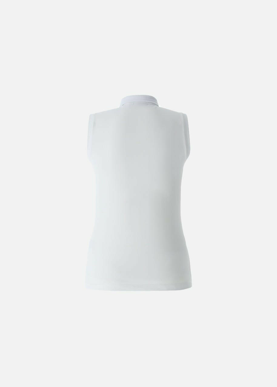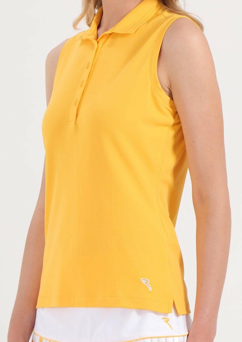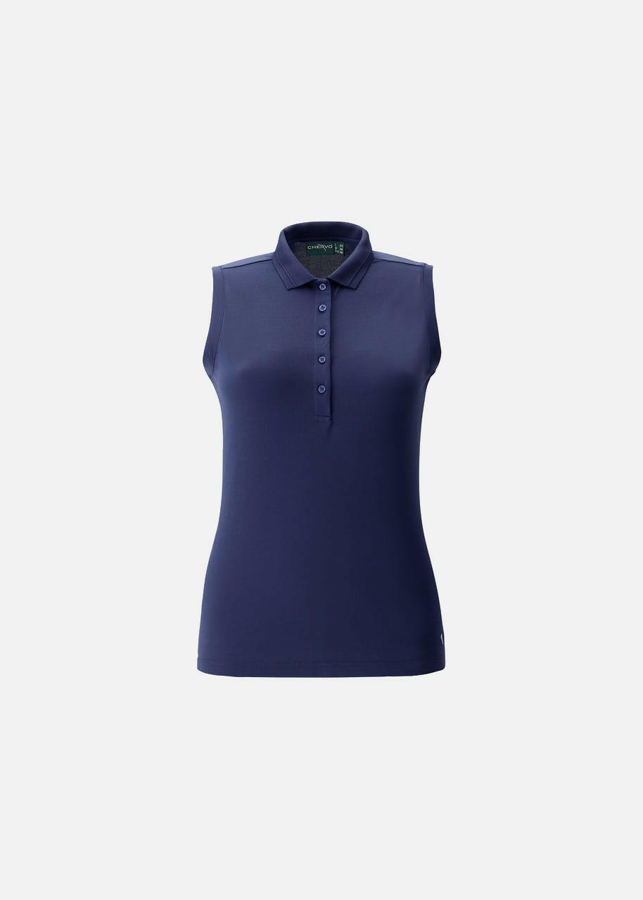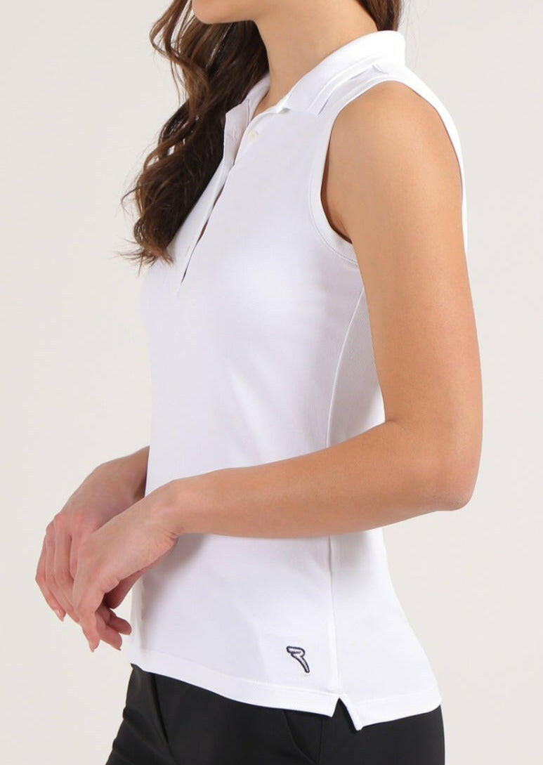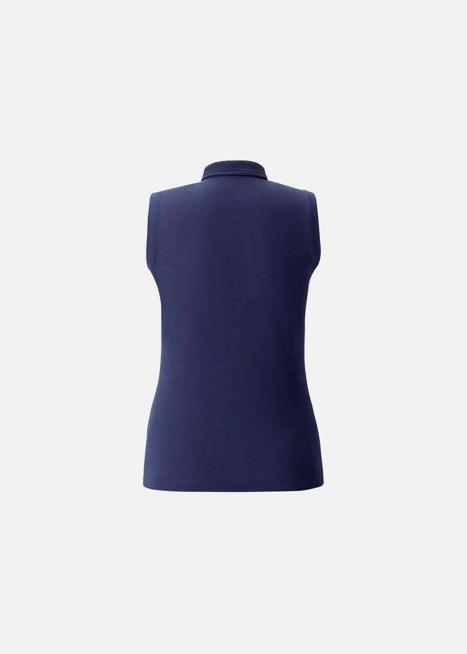 女性のためのソフトなタッチのノースリーブポロシャツです。新しい100%ナイロンピケ素材には、ドライマティックとサンブロック加工が施されており、軽量性、通気性、乾燥性に優れています。爽やかなUVカット素材で、太陽の光から肌を守ります。ネックラインには、ツートンカラーの刺繍と同系色のボタンがあしらわれており、グリーン上でも普段着としても最適な印象を与えます。