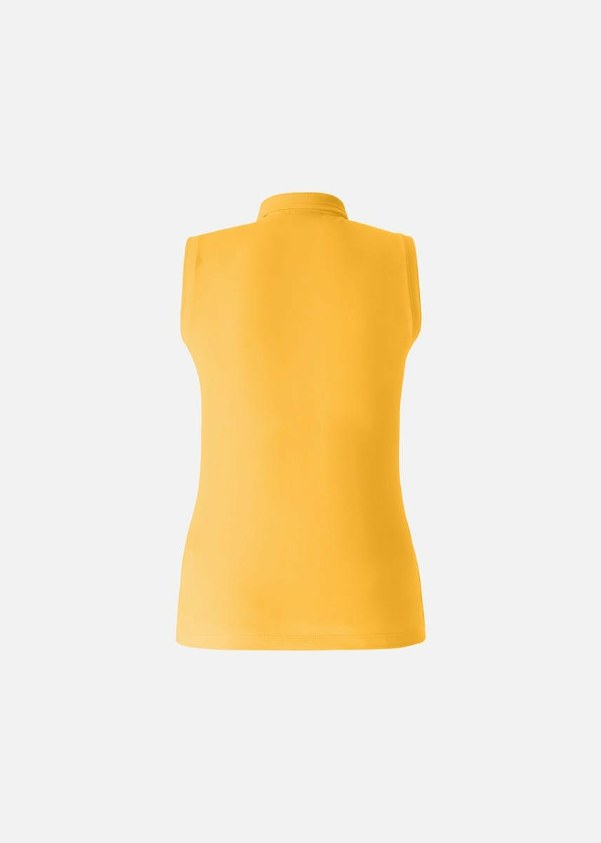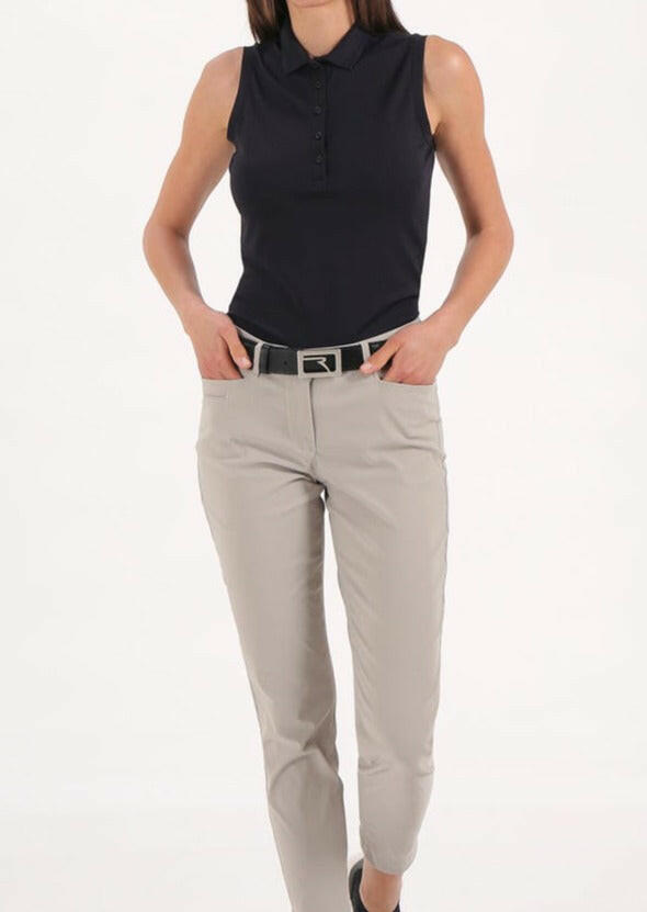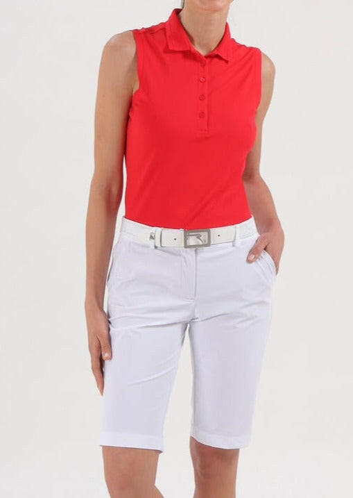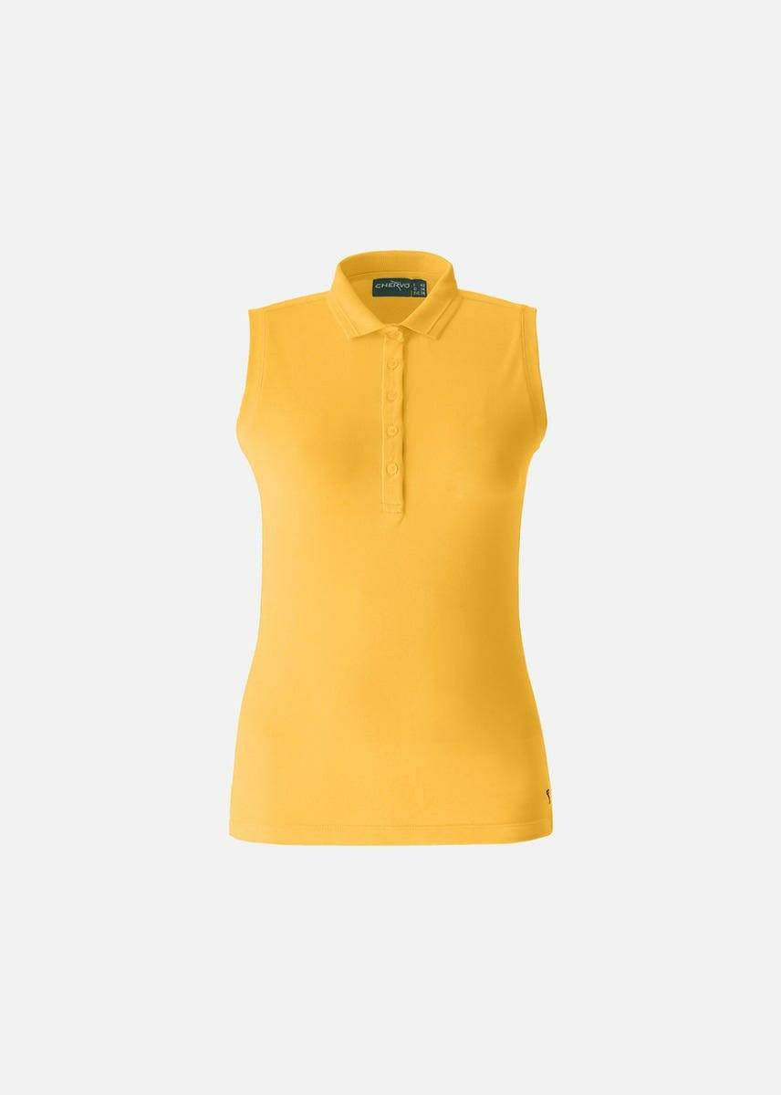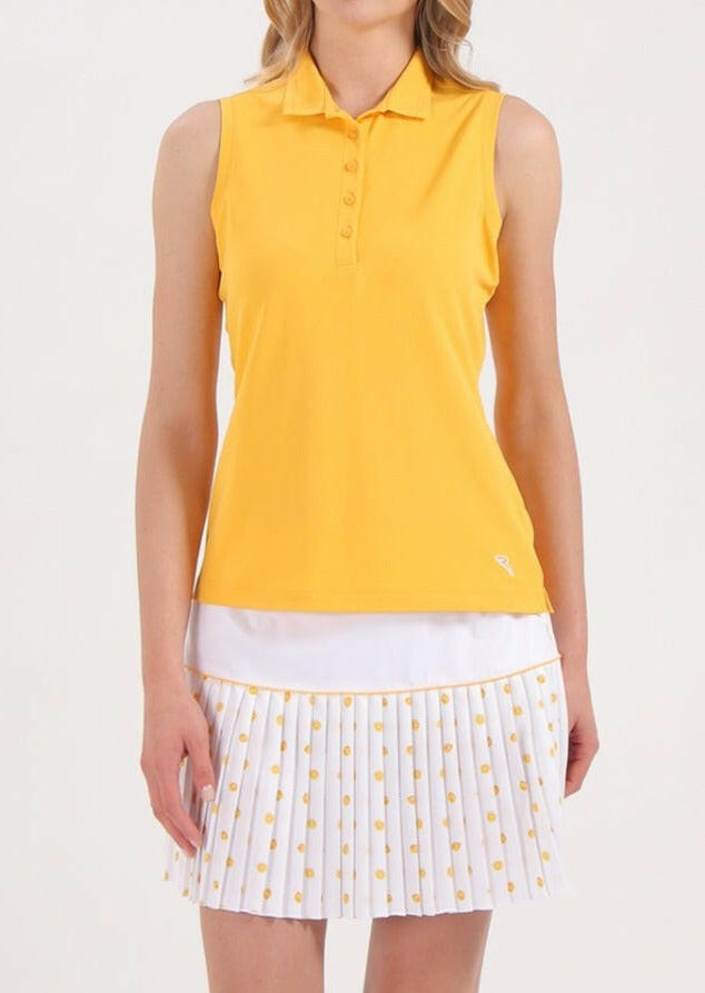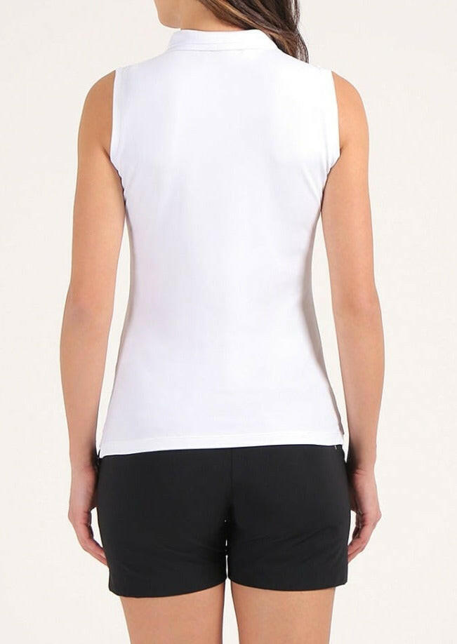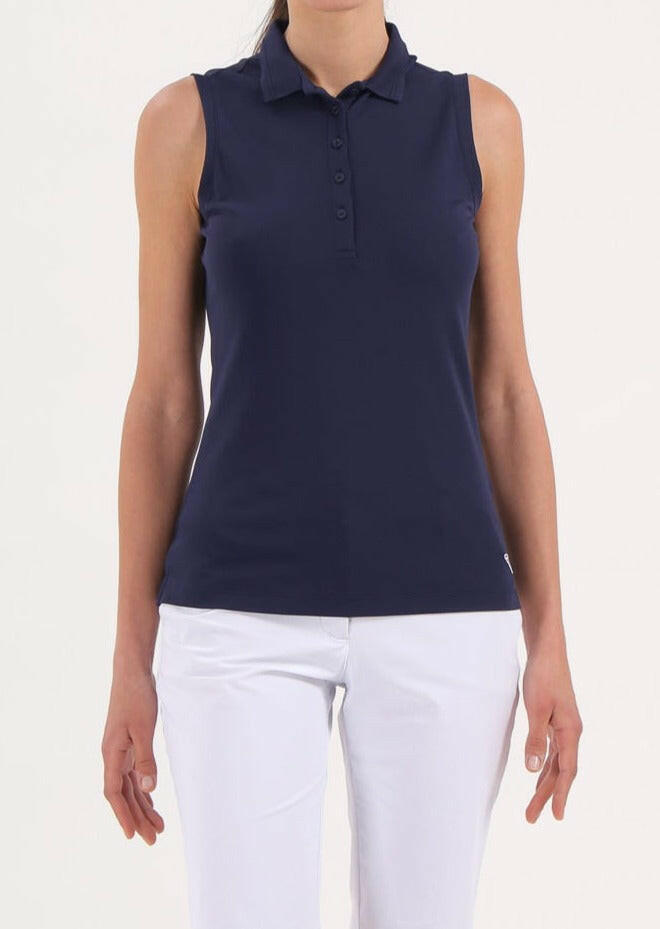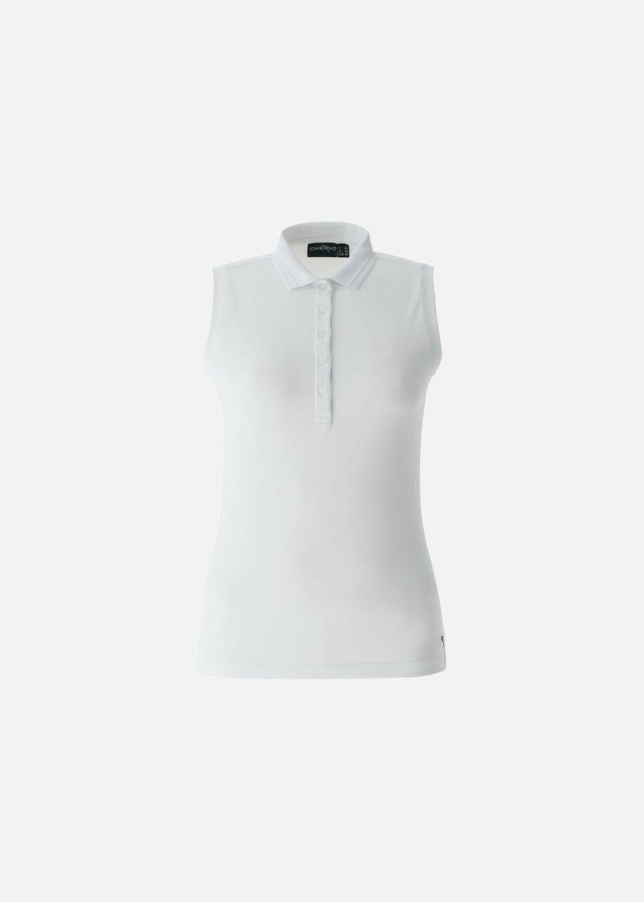 女性のためのソフトなタッチのノースリーブポロシャツです。新しい100%ナイロンピケ素材には、ドライマティックとサンブロック加工が施されており、軽量性、通気性、乾燥性に優れています。爽やかなUVカット素材で、太陽の光から肌を守ります。ネックラインには、ツートンカラーの刺繍と同系色のボタンがあしらわれており、グリーン上でも普段着としても最適な印象を与えます。
