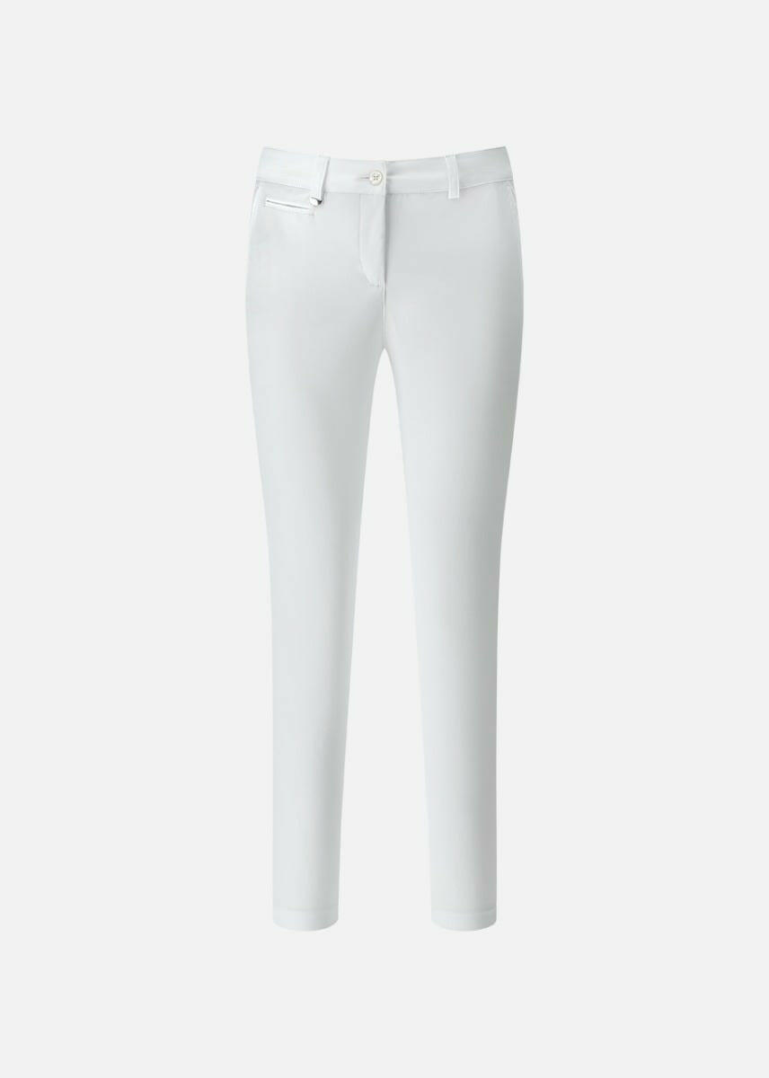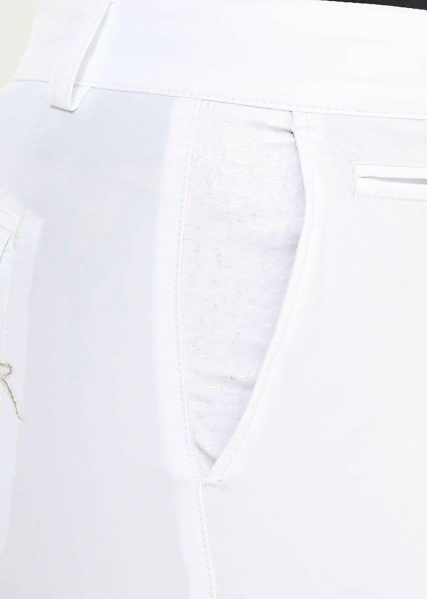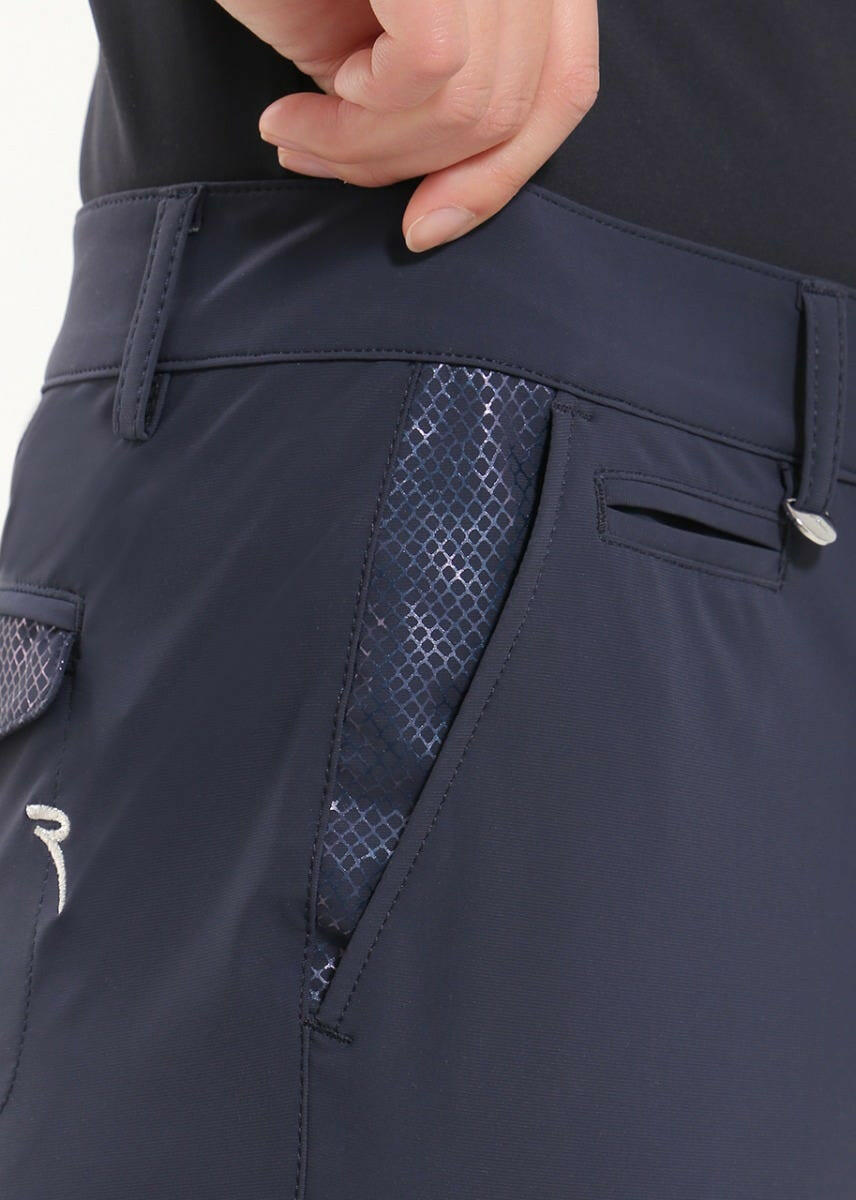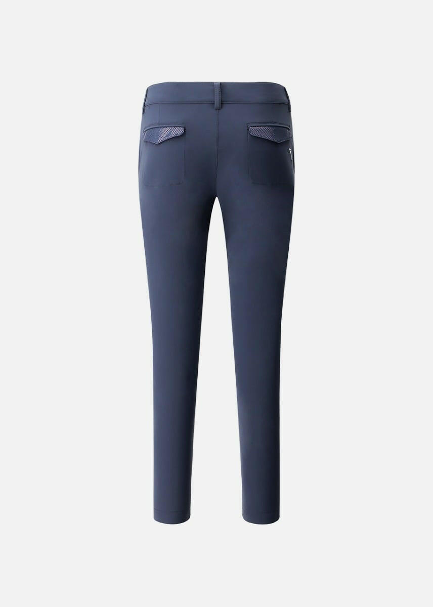 スタイルにもこだわりがあり、サイドと後ポケットの上部には光沢のあるアップリケが施されています。さらに、ベルトループにはシルバープレートが装備され、ウエスト下には5つ目のポケットが配置されています。スリムフィットで、シンプルでありながらも洗練されたデザインが特徴です。