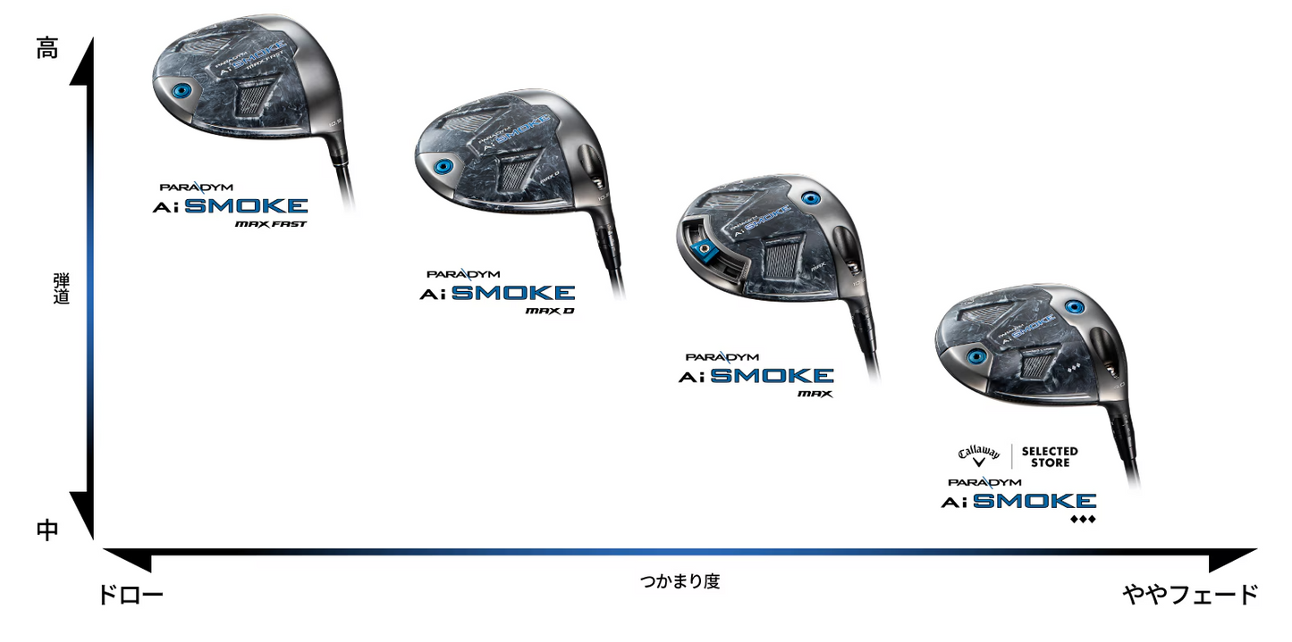 2024年、キャロウェイのAI設計は新たなフェーズへと突入しました。これまではロボットテストの数値をスーパーコンピューターに入力して解析に利用していましたが、今回より、世界中から集めた25万ものスイングデータをインプット。リアルなスイング軌道、インパクトロフトなどを活用したことにより、驚きの機能が生み出されることとなりました。誕生したAiスマートフェースは、どのような打ち方であっても、スピンや打ち出し角などを即座に最適なものへと補正。これまで以上の飛距離と曲がりの少ない弾道を、プレーヤーへともたらします。新シリーズは、「PARADYM Ai-SMOKE」と名づけられ、ドライバーには4種類をラインアップ。スタンダードモデルの「PARADYM Ai SMOKE MAXドライバー」は、より効果を発揮する打点範囲をやや大きめに設定して開発されており、さまざまなレベル、スイングスピードのゴルファーに幅広く対応できる性能となっています。