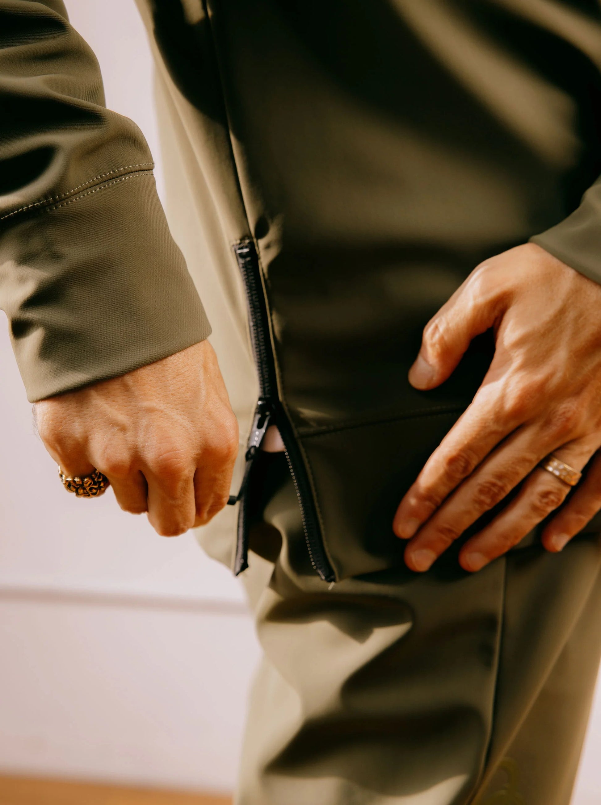 表面はナイロンストレッチの撥水ハイゲージトリコット、裏面に抜群の肌触りを持つポリエステルフリースボンディングをした高級感のあるハイブリッド素材使用のハーフジッププルオーバー。