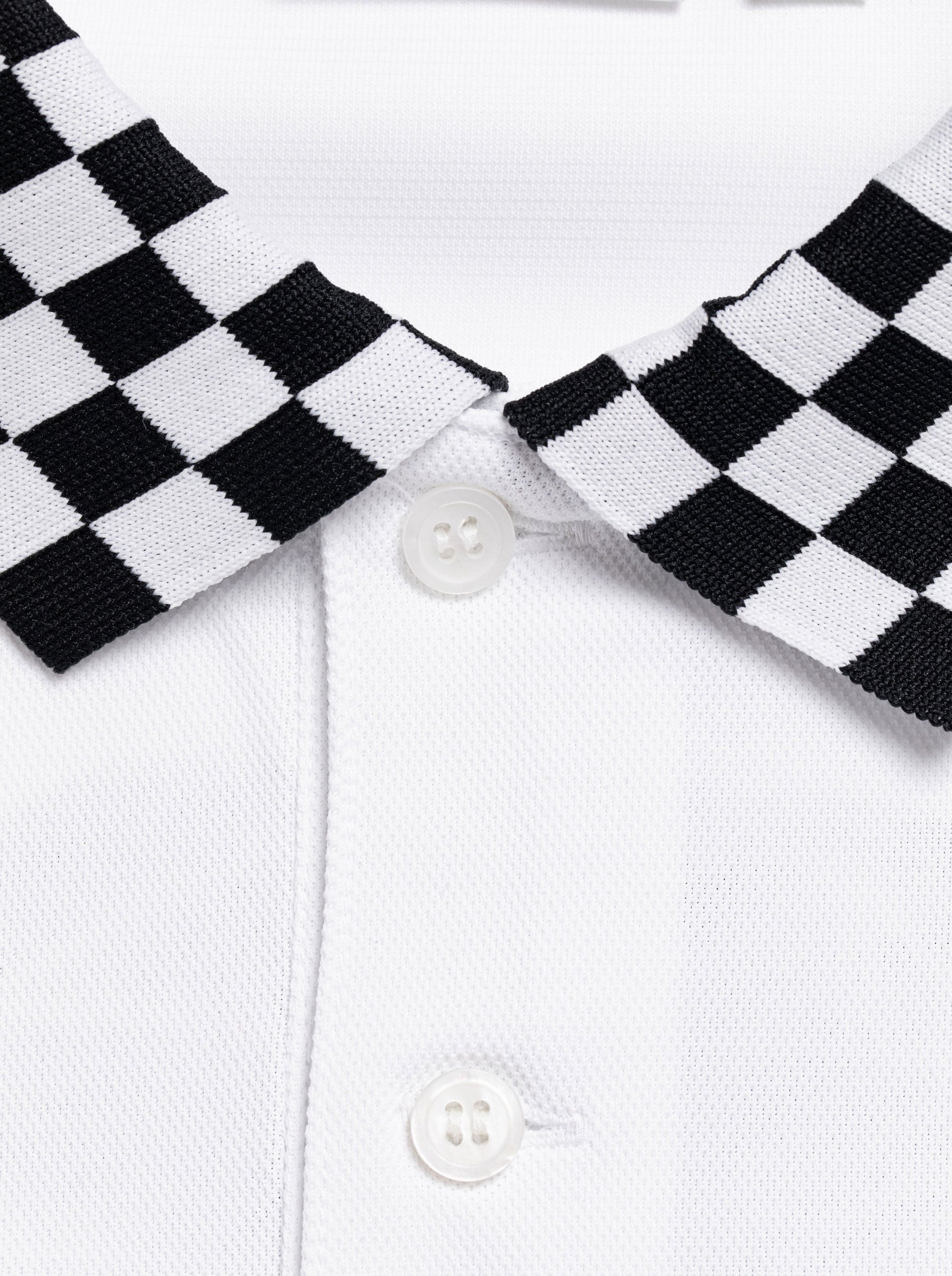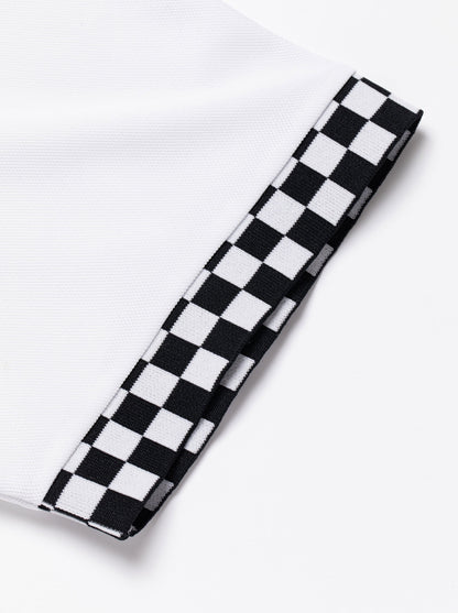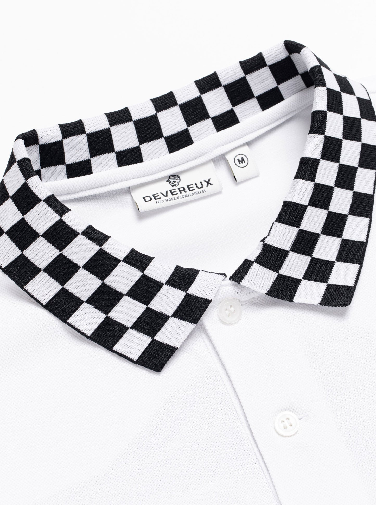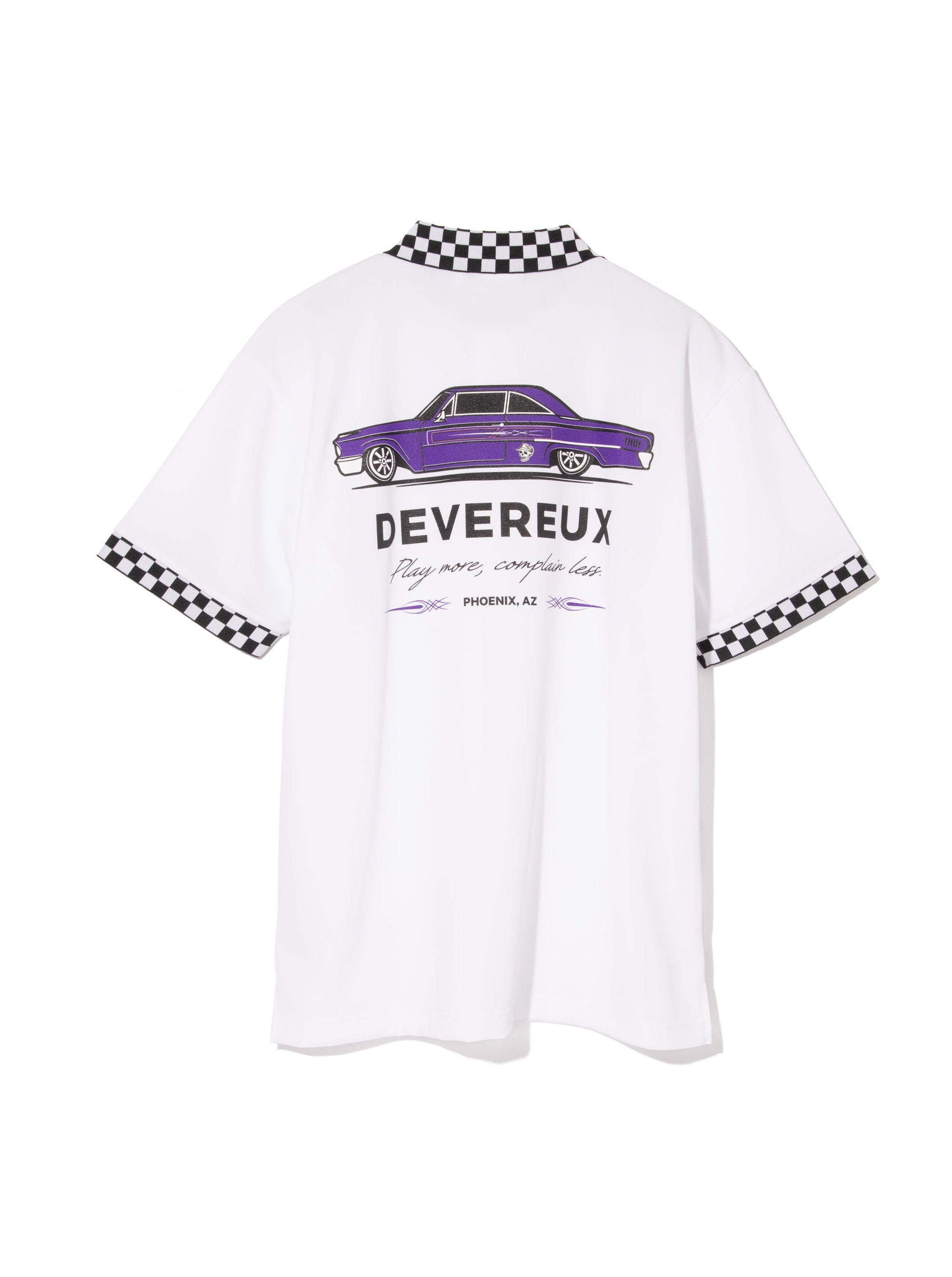 ストレッチ性・吸湿素感性はもちろん、UVカット機能に非常に優れたポリエステル100%素材を使用したポロシャツ。最大の特徴はチェッカーリブを衿と袖口に用い、バックグラフィックにアメリカの歴史を感じさせるクラシックカーのアートをプリントするという、絶妙なバランスがDEVEREUXらしい逸品!