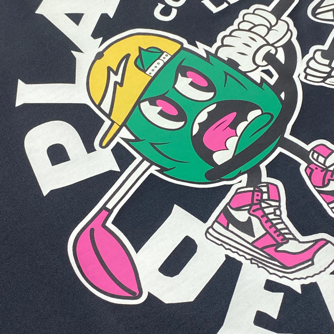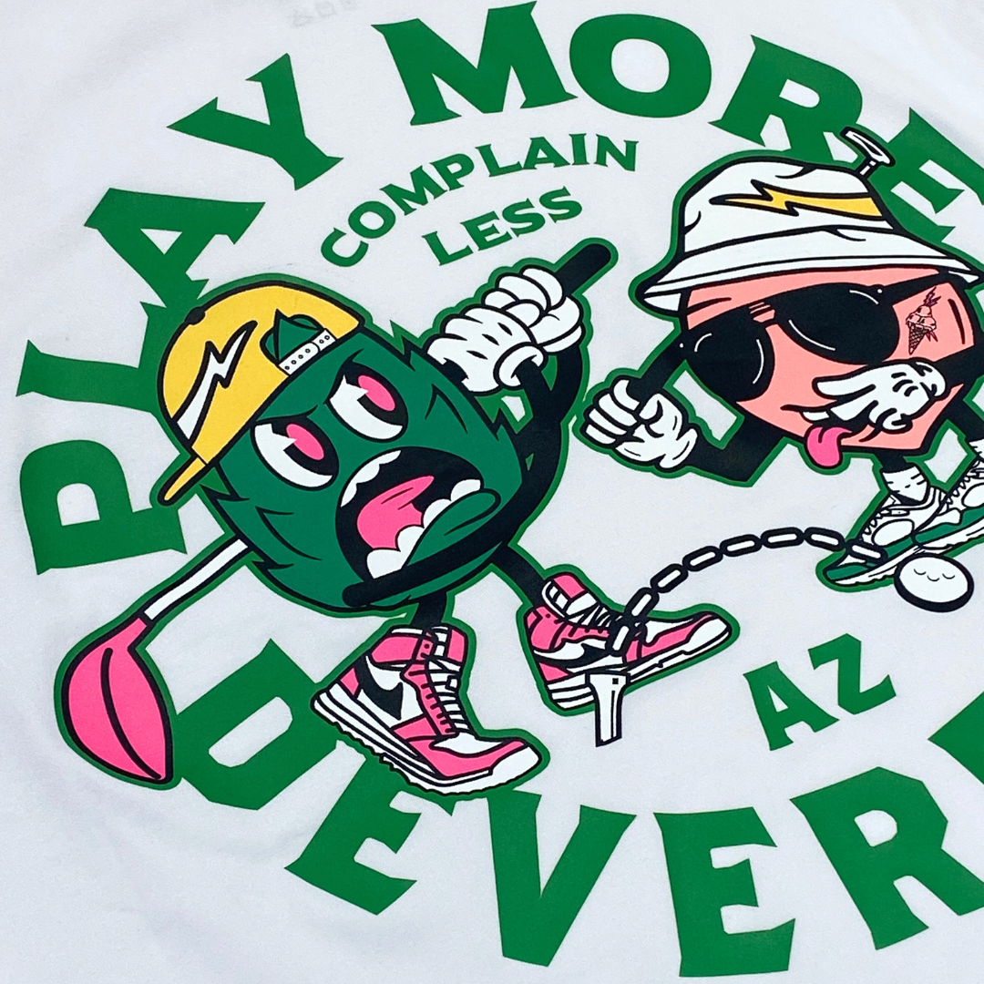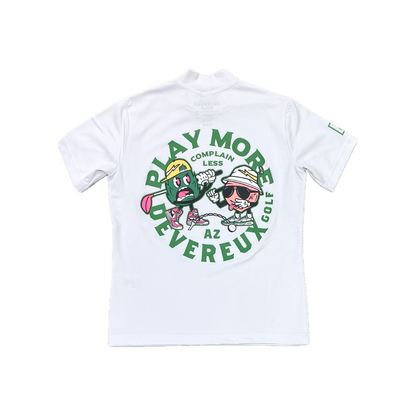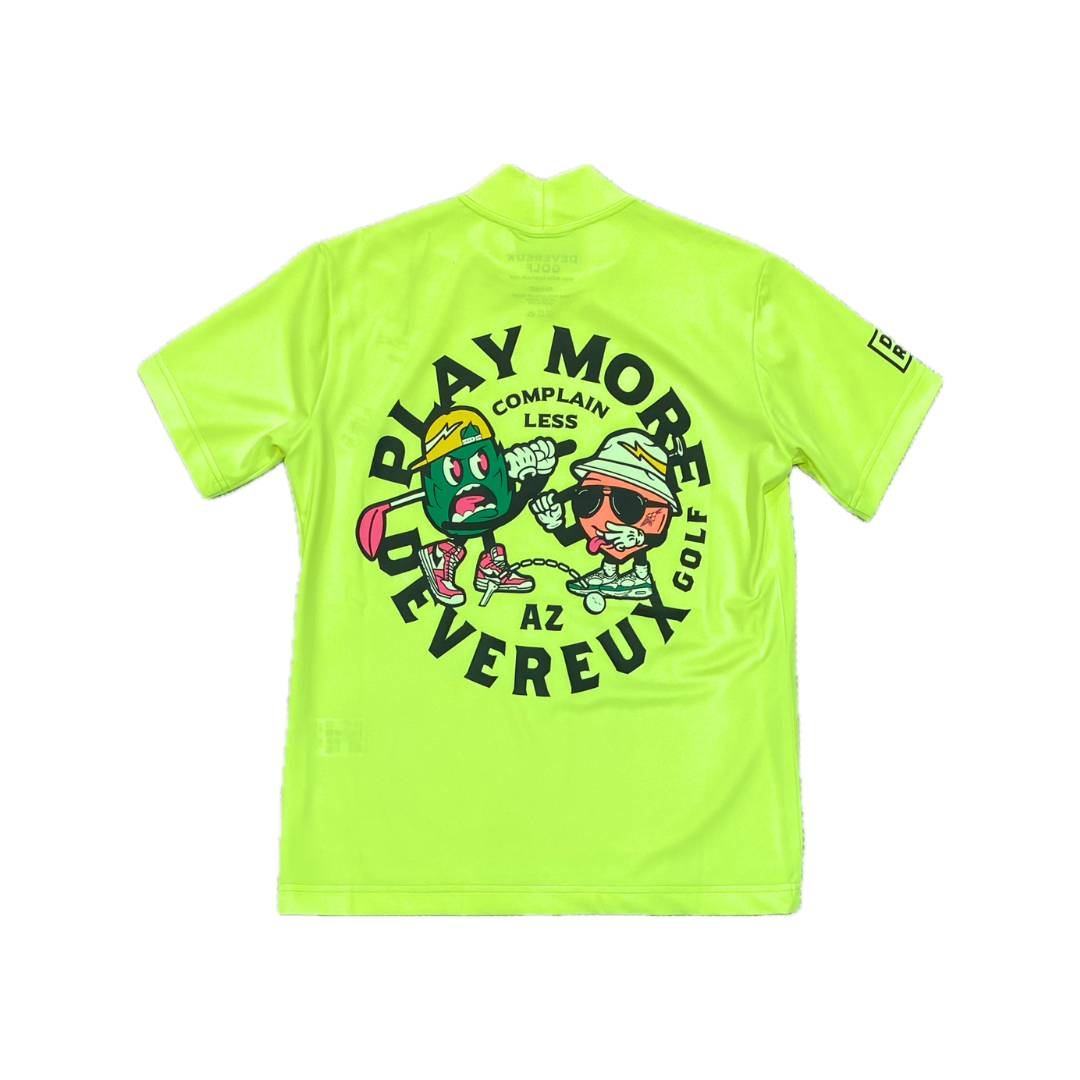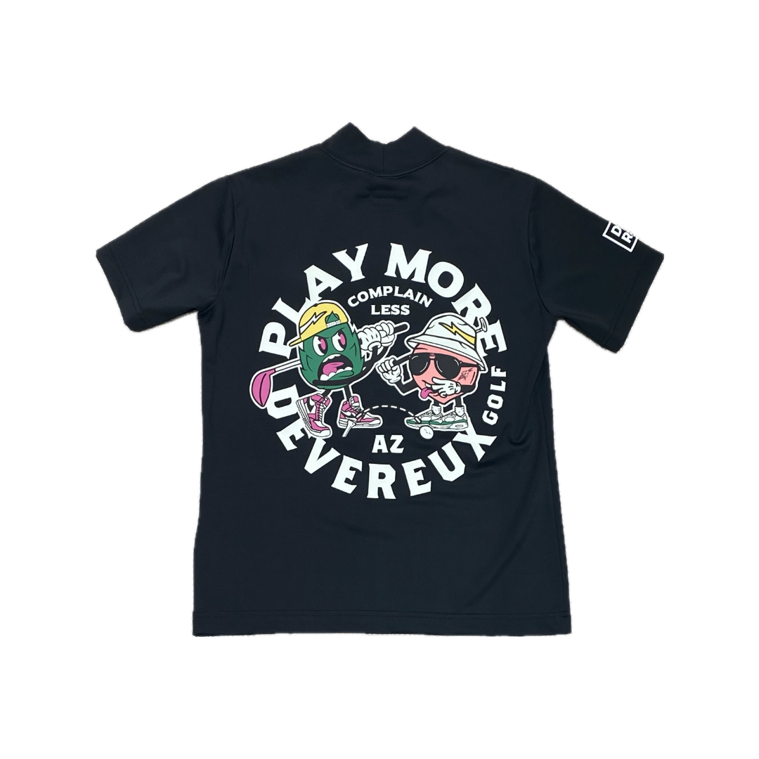 キャッチーなグラフィックが目を引く、DEVERAUX GOLFのバックプリントポロシャツ。「PLAY MORE COMPLAIN LESS」のメッセージと、ポップなキャラクターがプレーをもっと楽しくしてくれる一枚!ストリート感のあるデザインで、ゴルフはもちろん普段使いにも◎