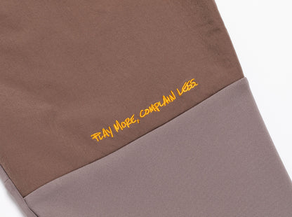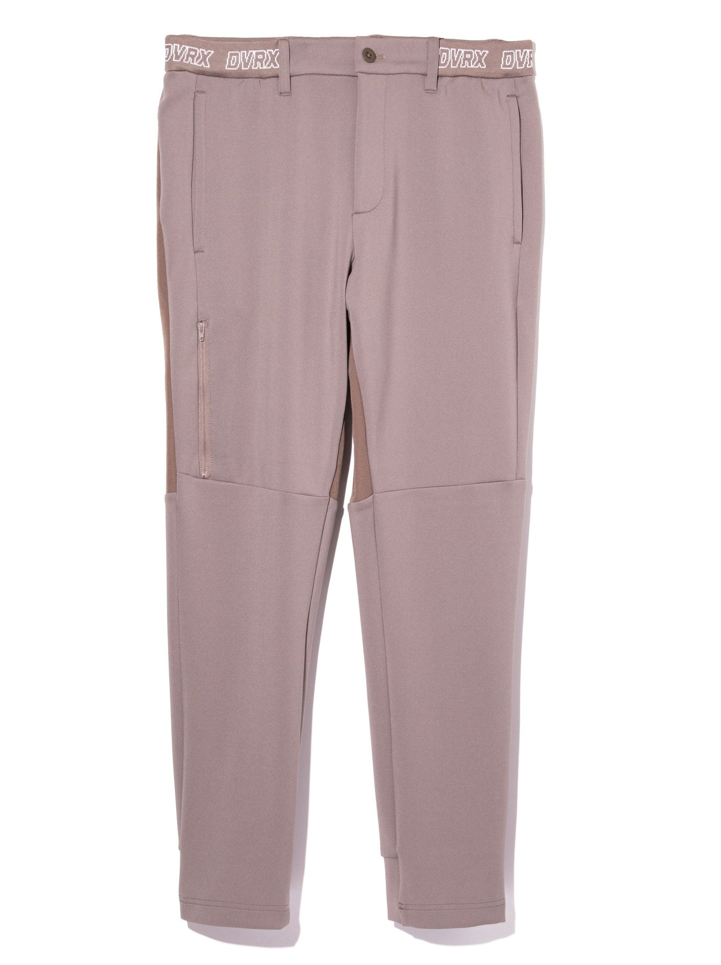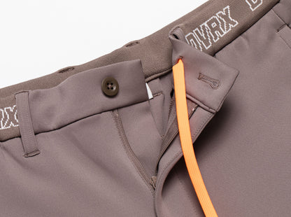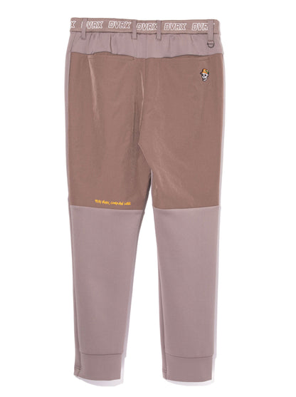 ボディーにポリエステルストレッチダンボール素材、別布でナイロンストレッチ素材を使用した、ロングパンツ。