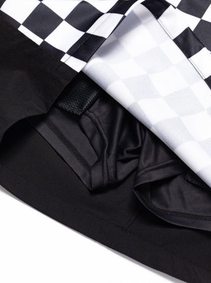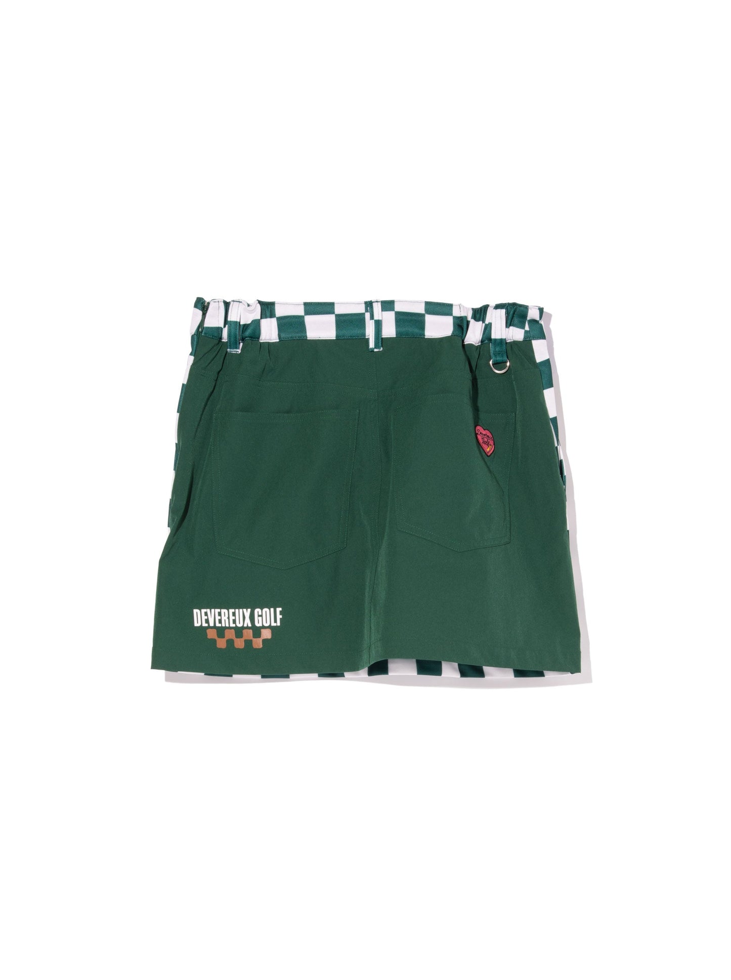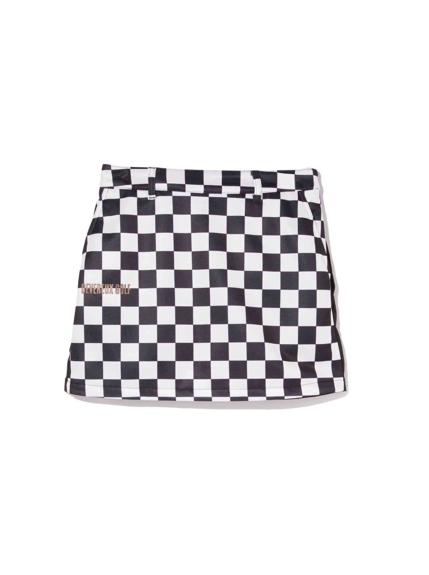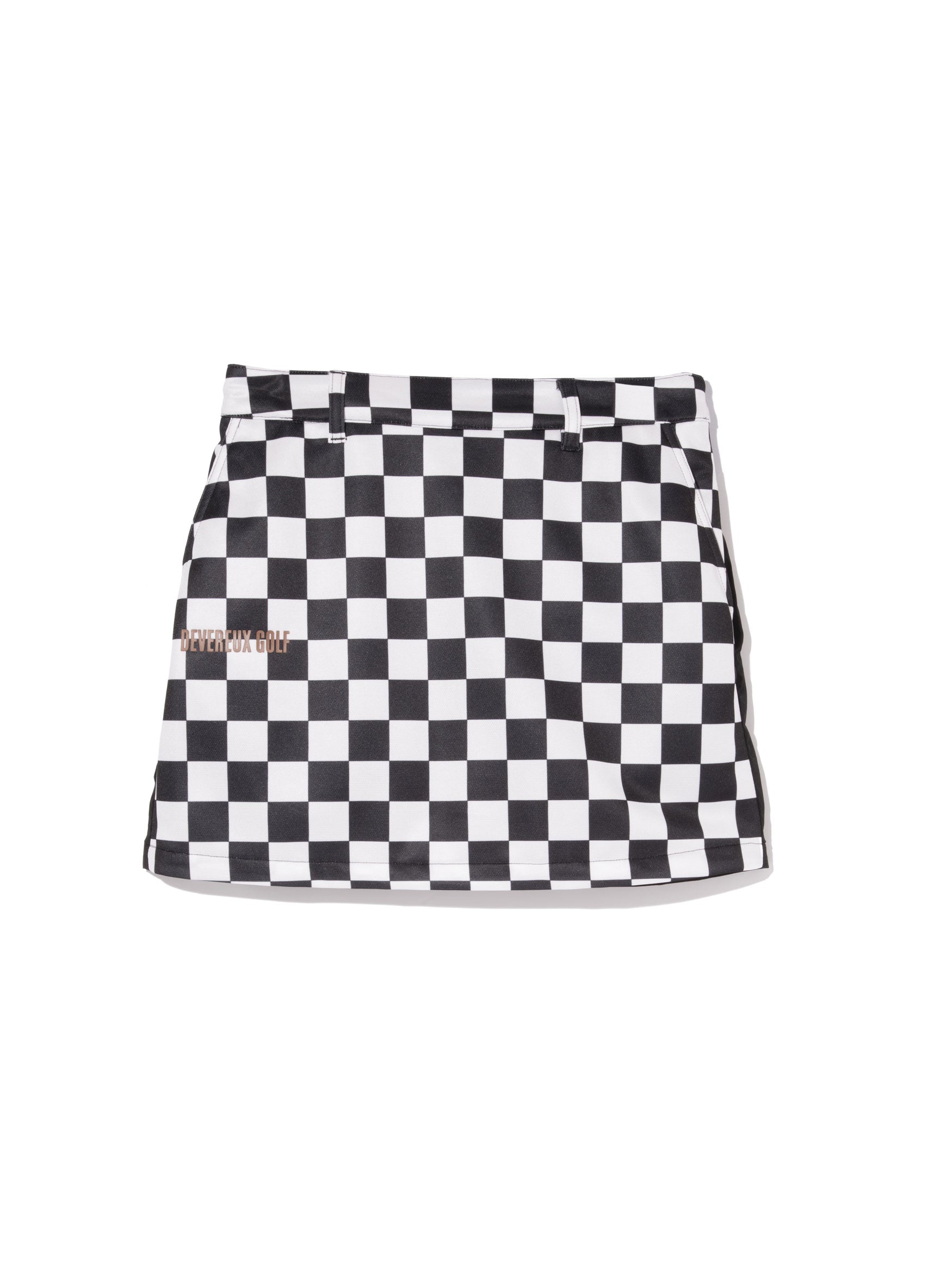 前身に光沢感のあるポリエステル100%素材にチェッカープリントし、後身にナイロンPU素材を使用したスカート。すっきりしたシルエットが女性らしさを際立たせます。