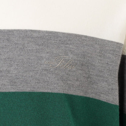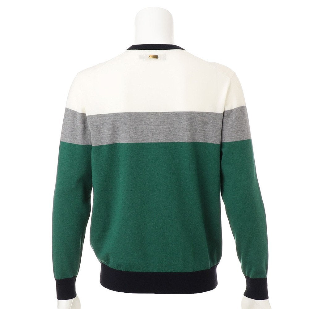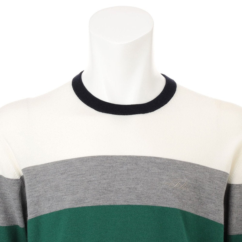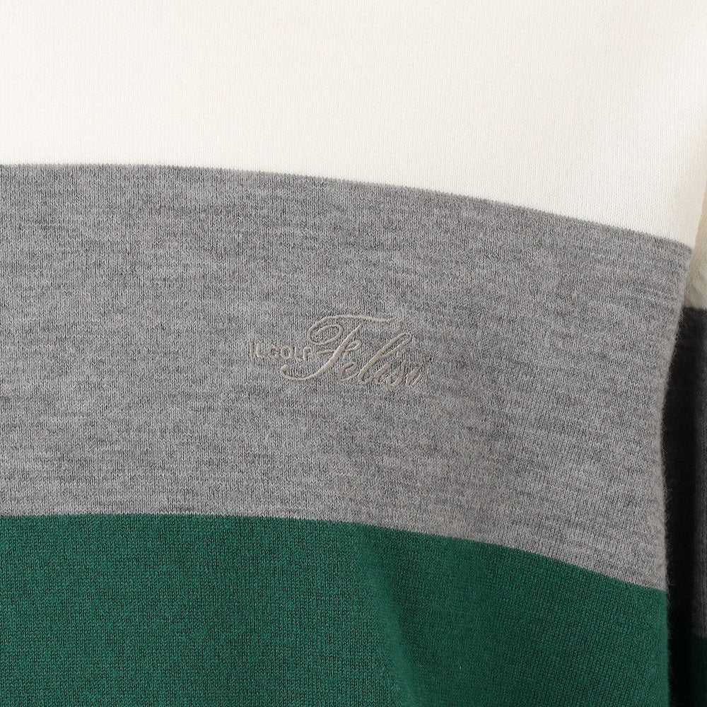 豊かな発色でコーディネートを彩るクルーネックセーター。トリコローレを彷彿させるカラーリングを採用した、Felisi Golf(フェリージ ゴルフ)らしいデザインです。ハイゲージならではの上品な落ち感を愉しめつつ、メリノウールによる吸湿速乾性、抗菌作用、保温性など天然素材由来の機能性を兼備。背面にはFelisi IL GOLF(フェリージ イル ゴルフ)のメタルプレートをあしらい、シンプルなデザインに華やかさを取り入れました。