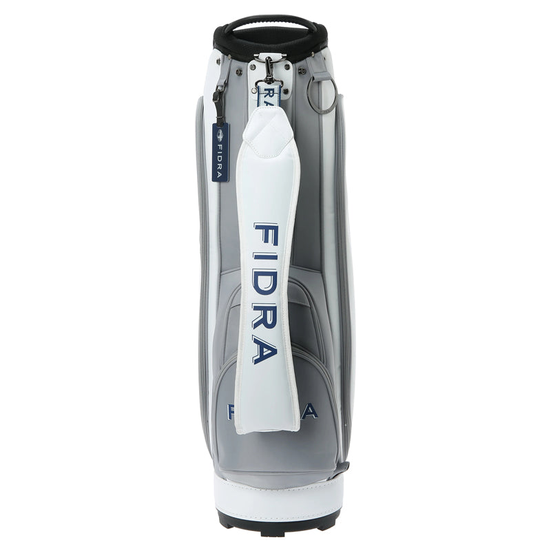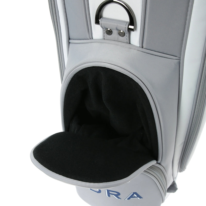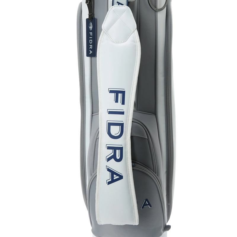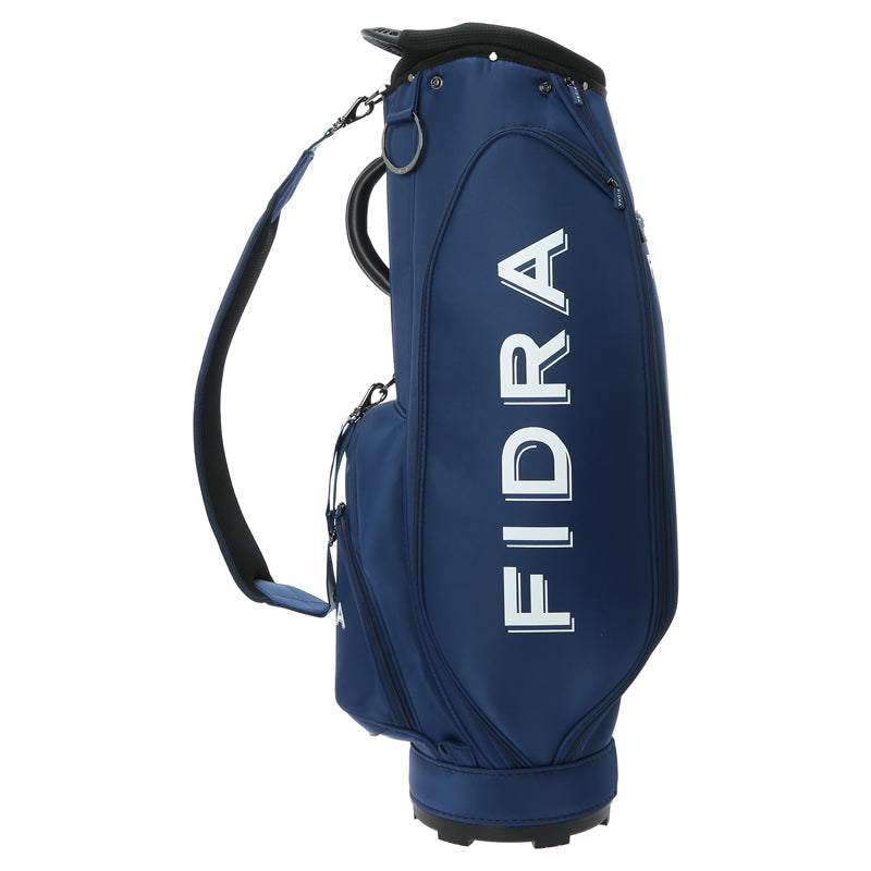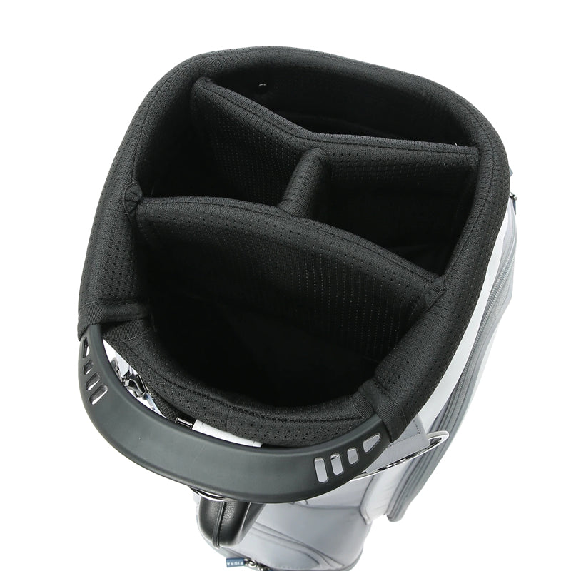 ブランドロゴが施された8.5型キャディバッグ。ユニセックスにお使いいただけるモノトーンのシンプルなデザイン。大容量タイプで使いやすく、両サイドやフロントにと充実のポケットを複数配置した機能性も魅力。取り外し可能なショルダーストラップ付きで持ち運びも楽々。いろいろな場面でストレスなく素早く対応出来ます。