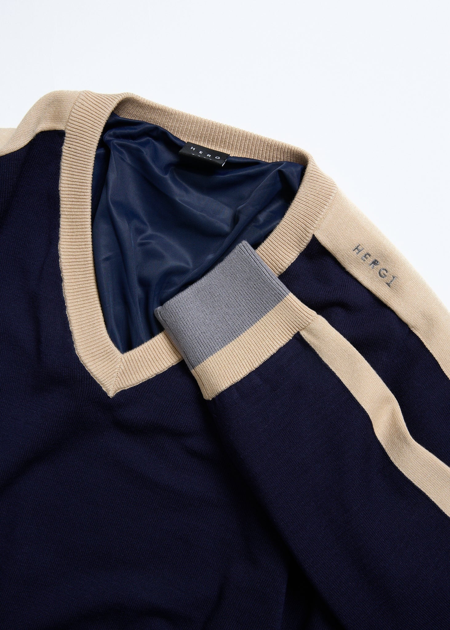 裏地付きの薄手ニットをベースに、エルグワンらしいシックな配色を施したVネックニット。