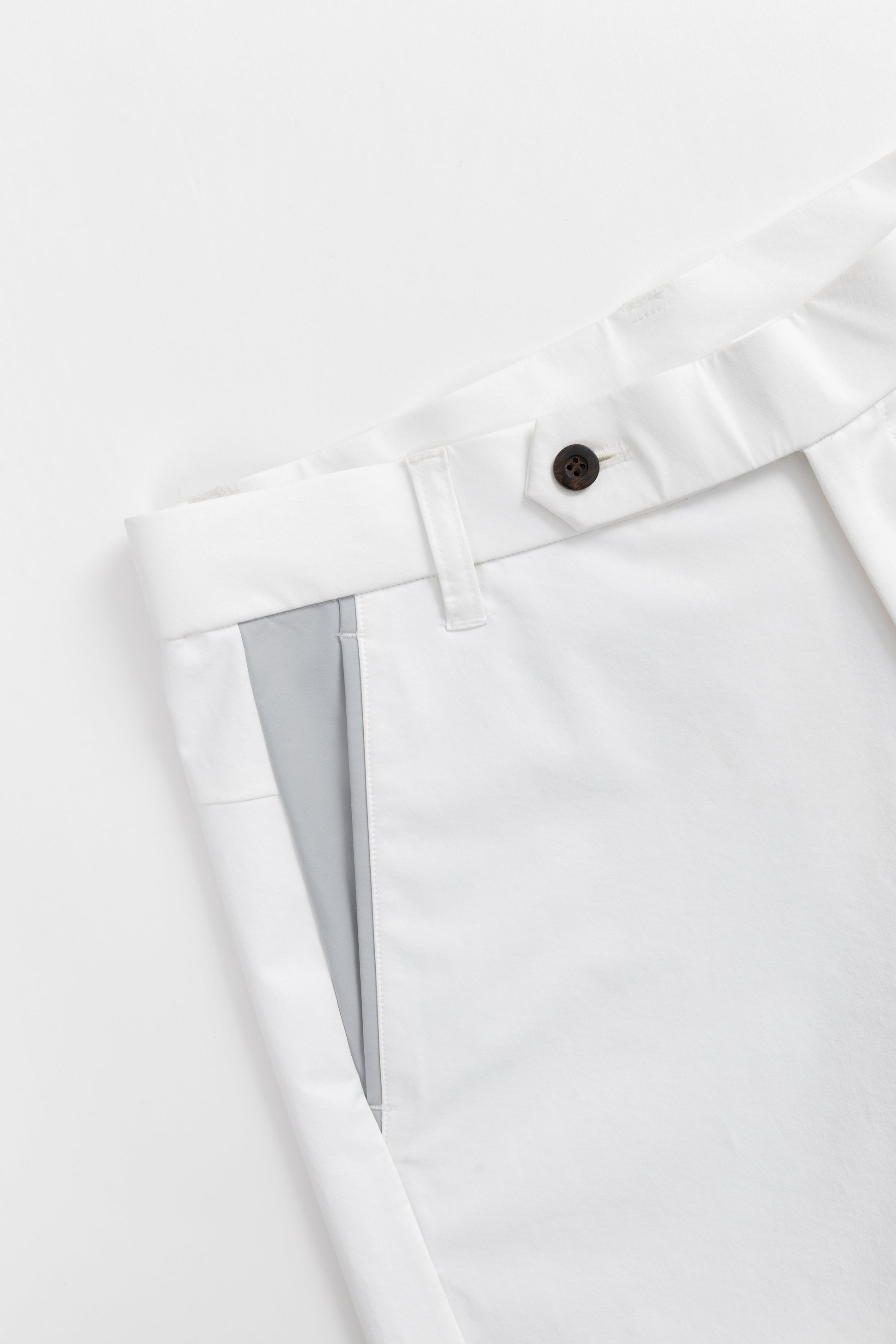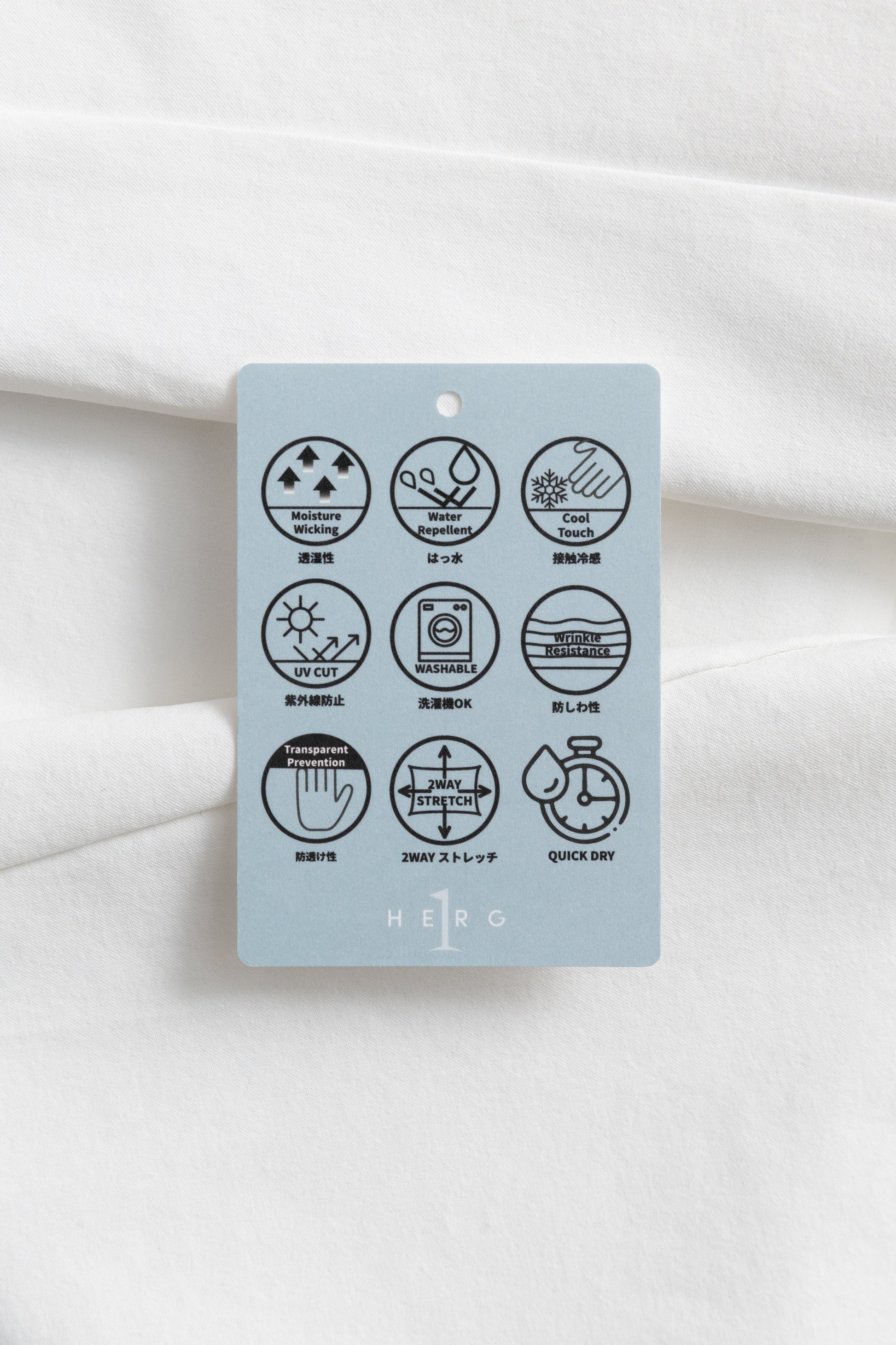 <接触冷感>2wayストレッチ、防シワ、撥水、透湿、ウォッシャブル、しなやかな素材がありつつハリもある。これら全ての機能を兼ね備えた、まさに理想の多機能素材を使用!さらに、透けない白を実現した素材を採用しているため、どんなシーンでも安心して着用できます。