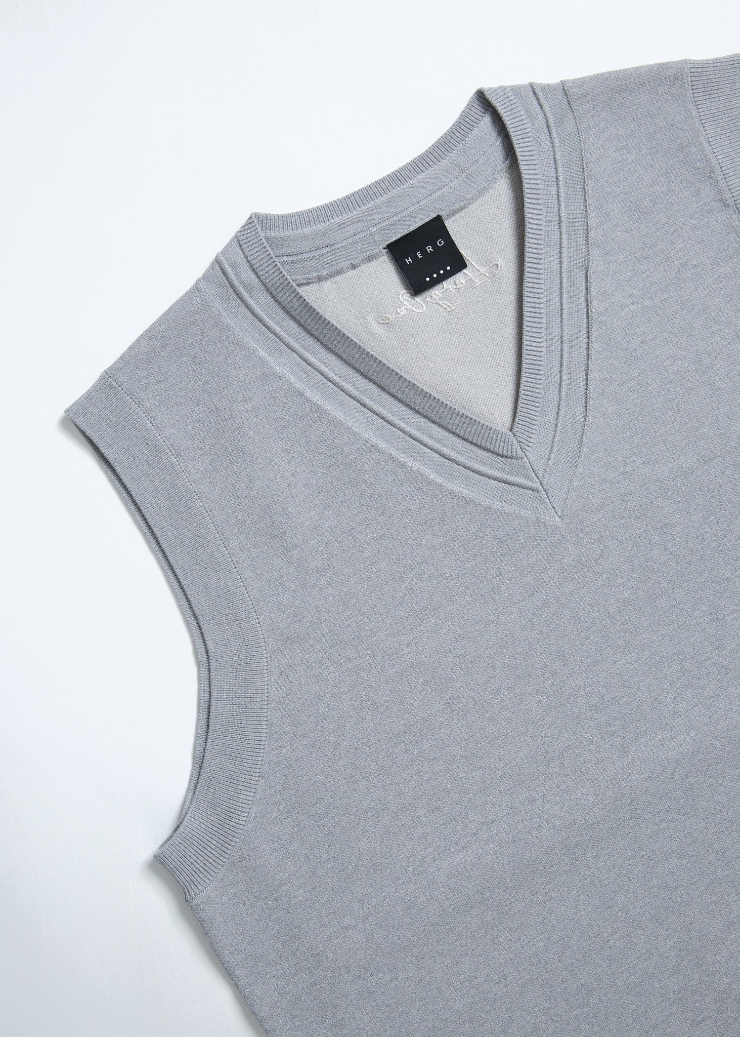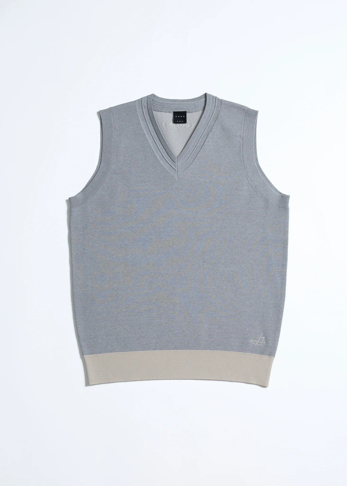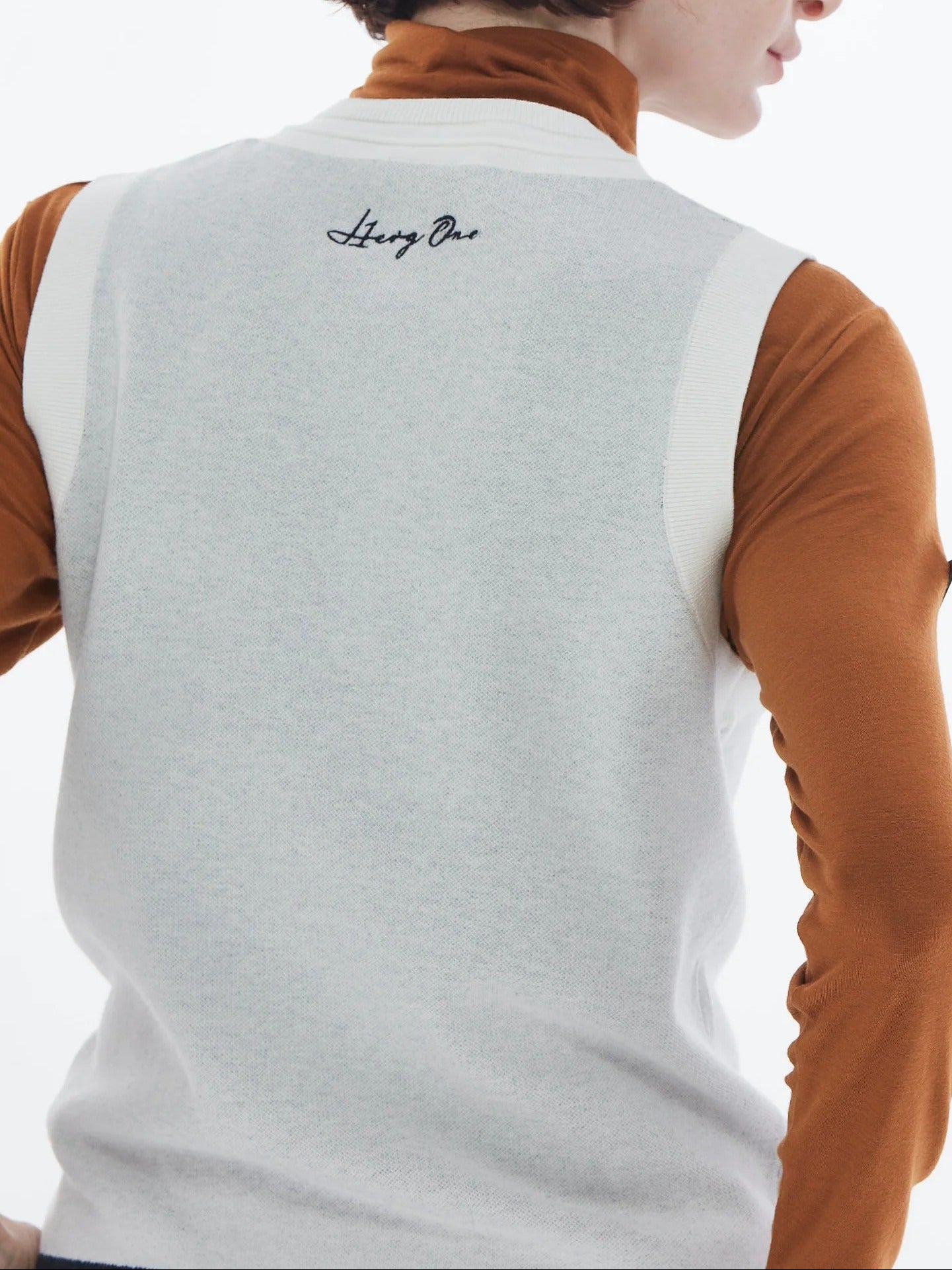 新作のジャカードニットベストは、裏糸がほんのり表に浮かび上がり、色が複雑に混ざり合うことで生まれる奥行きのある表情が魅力。