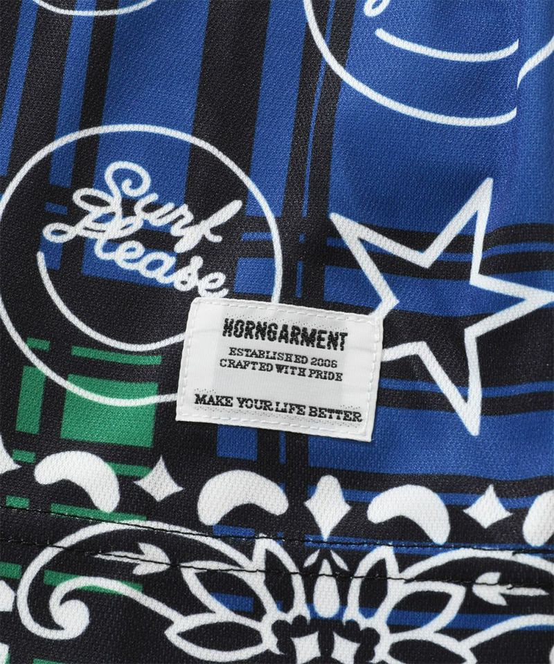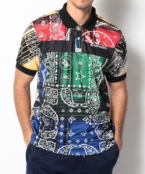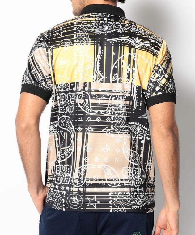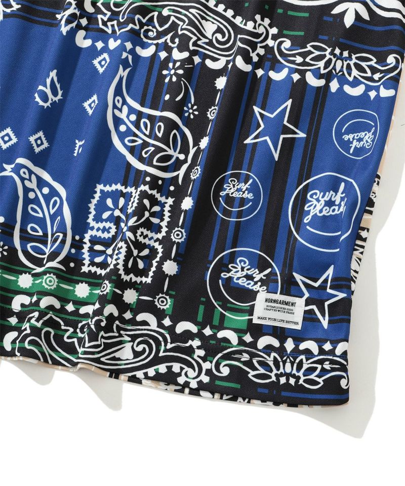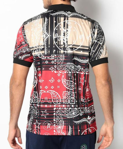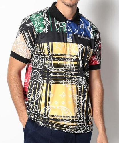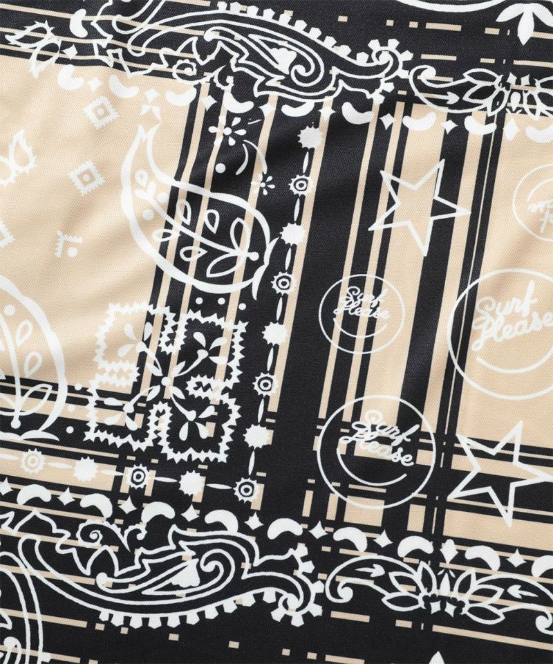 バンダナ柄クレイジーパターンのドライ半袖ポロ。SURF PLEASEマークの入ったバンダナ柄にタータンチェックをMIXしたグラフィックを使用し、各パネルで向きやサイズを変えたクレイジーパターンでデザインした、存在感抜群の1着です。