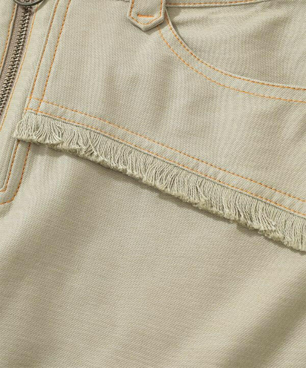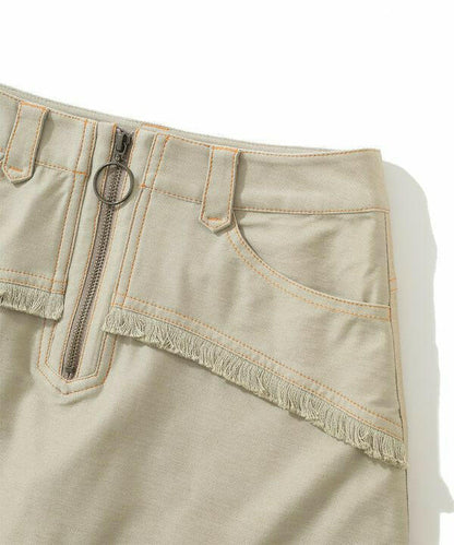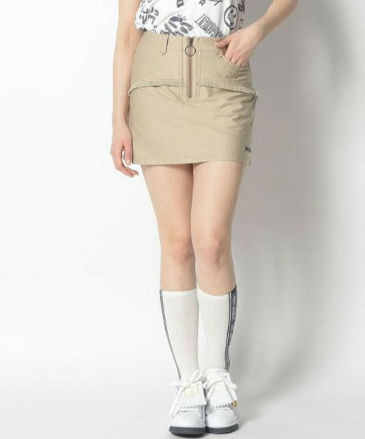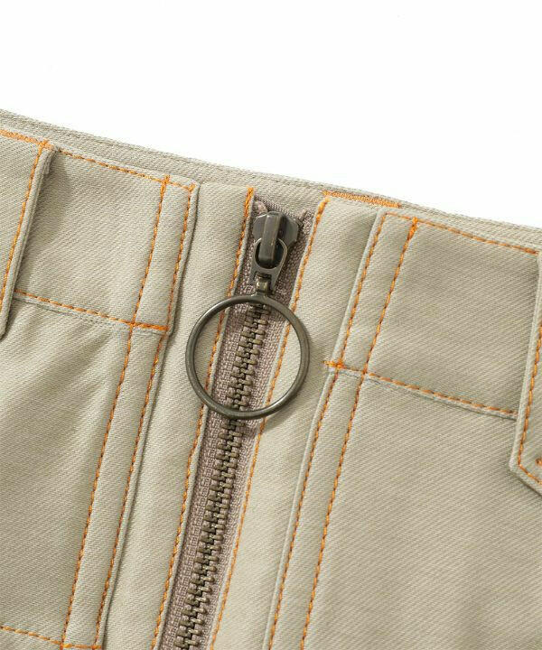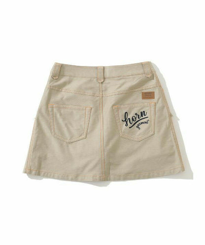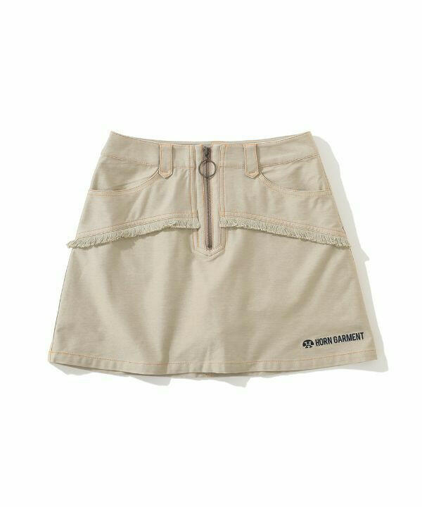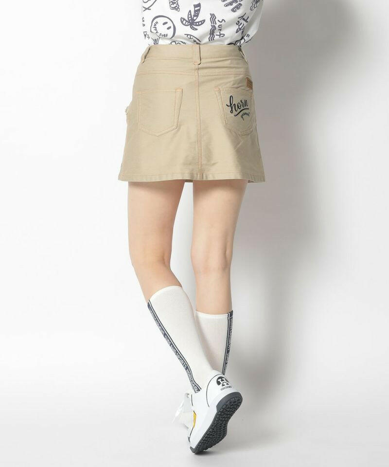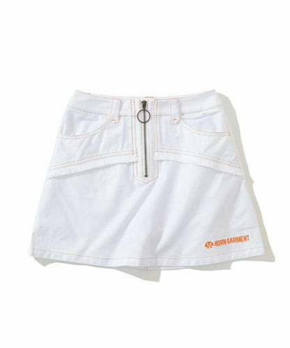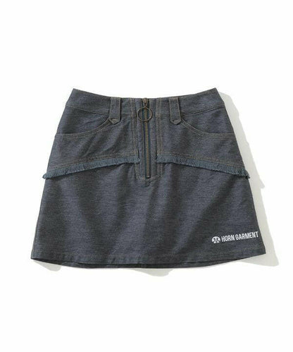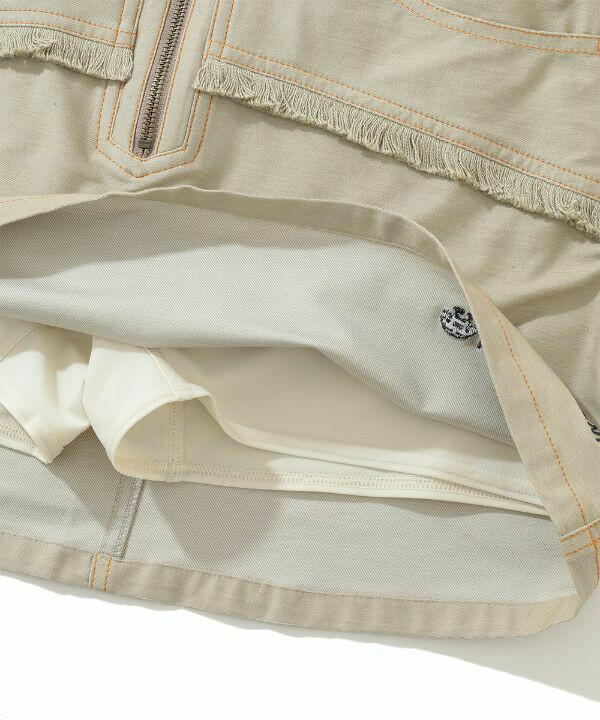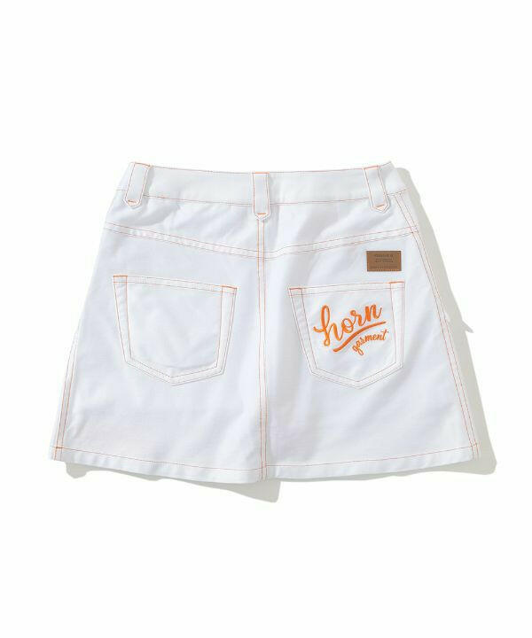 デニムライクなストレッチ素材のZIPスカート。フロントにロゴ刺繍、右後ろポケットに手書き風ロゴ刺繍を施しています。印象的なステッチワークがデザインのポイントになり、洒落た雰囲気で穿きこなせます。