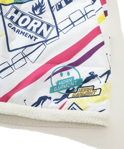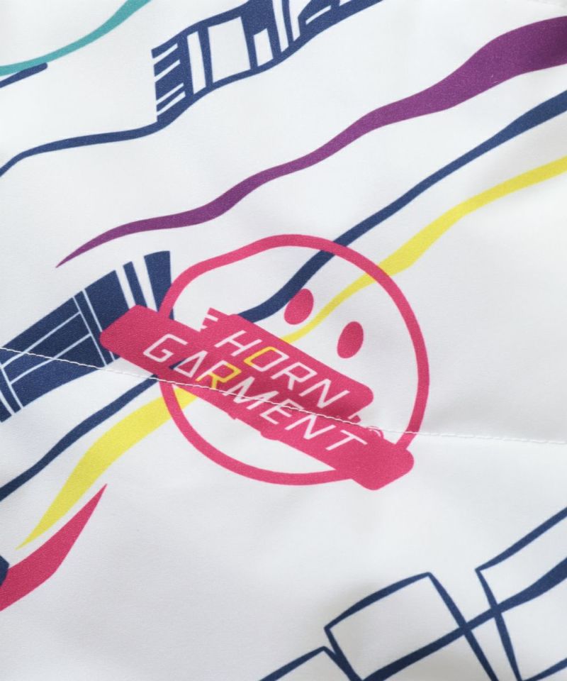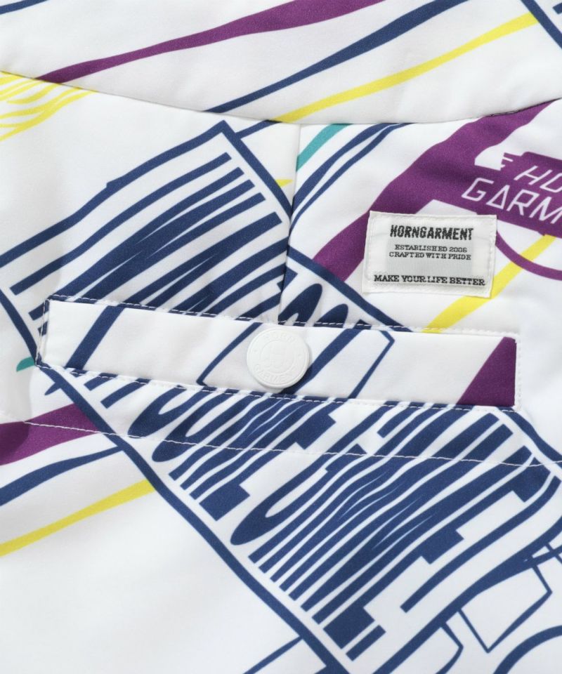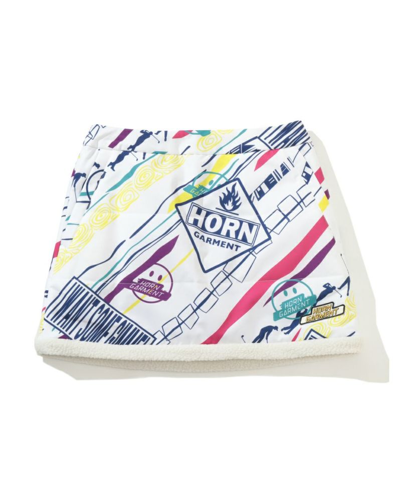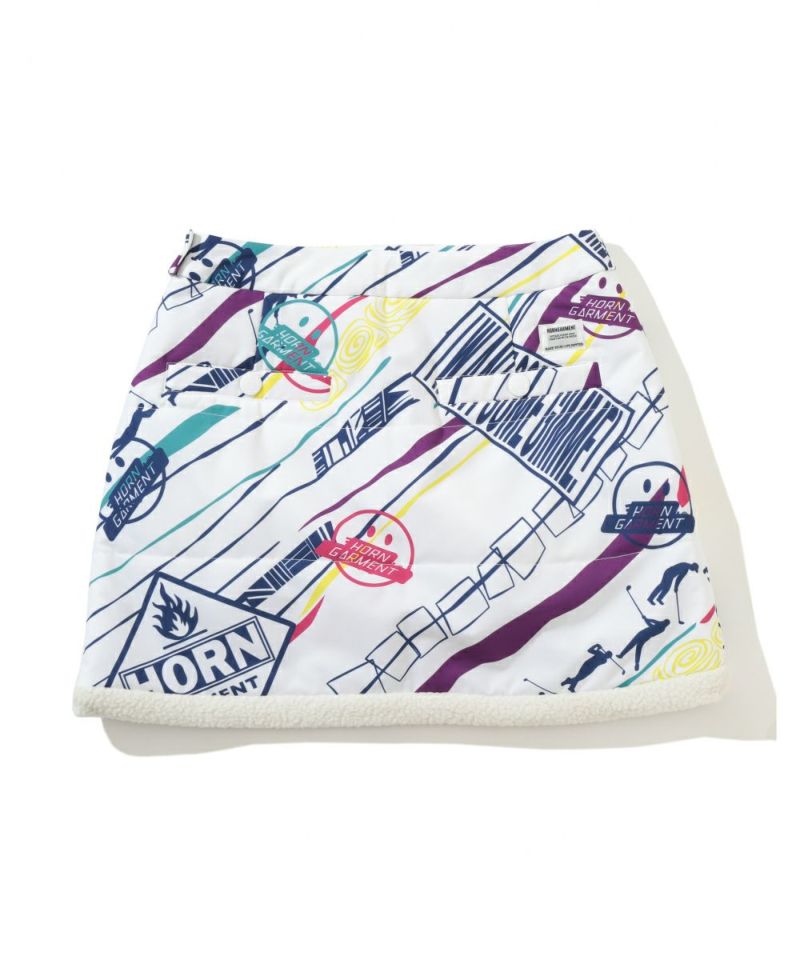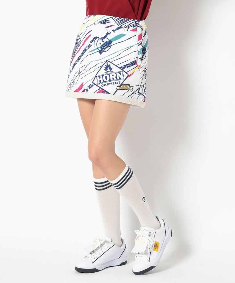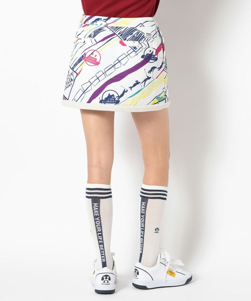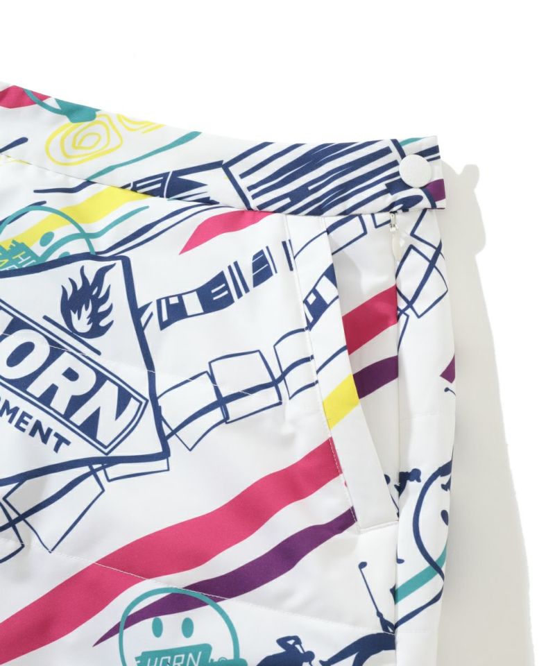 こちらは、90年代のスノーボードカルチャーからインスパイアされた、ノスタルジックなグラフィック・パッド入りスカートです。ゴルファーのデザインと90年代風のアートがミックスされた独特のグラフィックが特徴的で、ストレッチ性に優れた「Primeflex」タフタ素材にプリントされています。