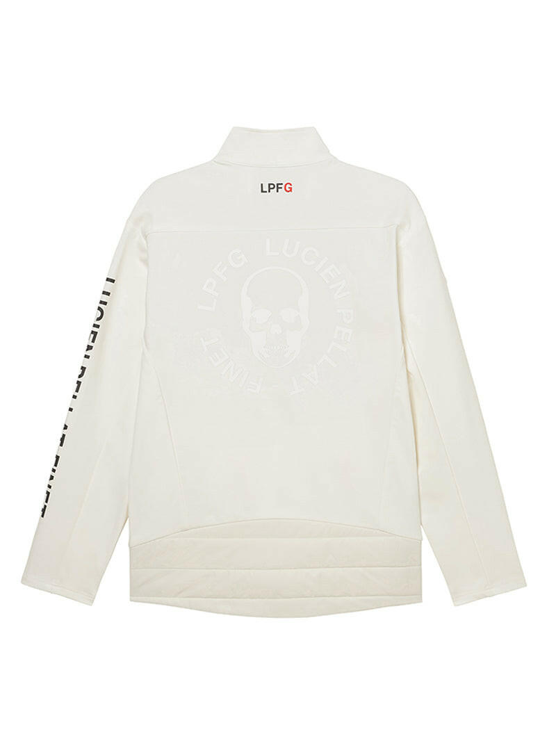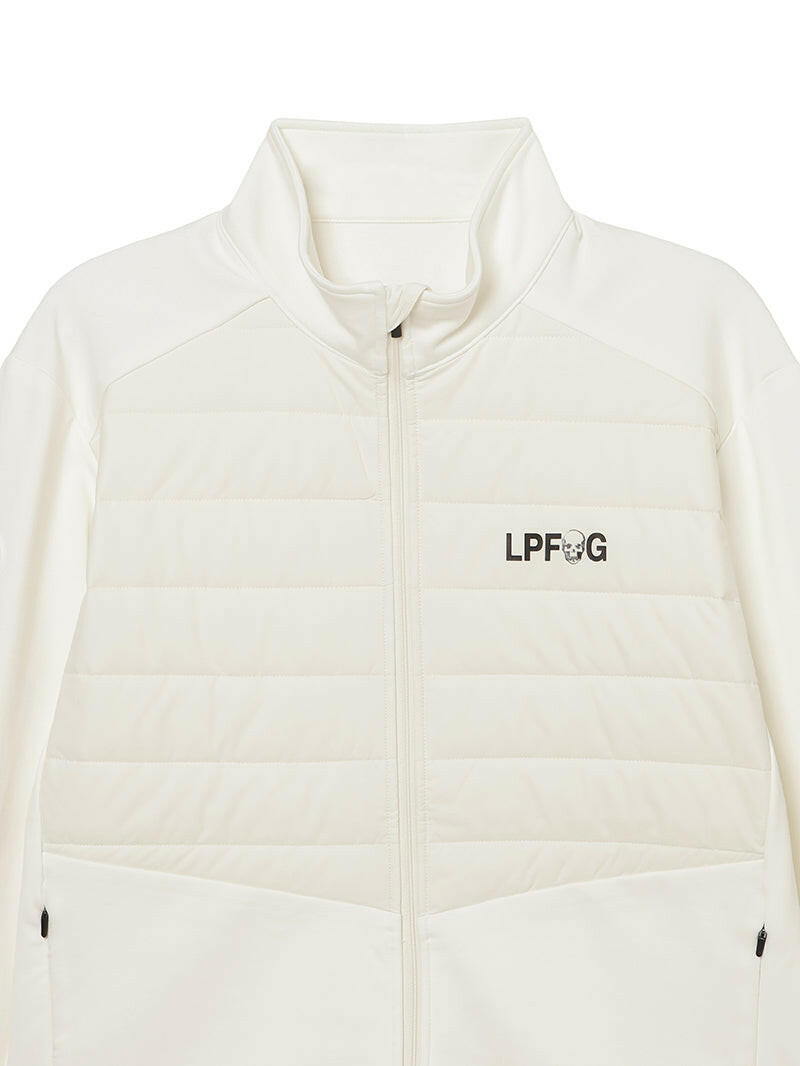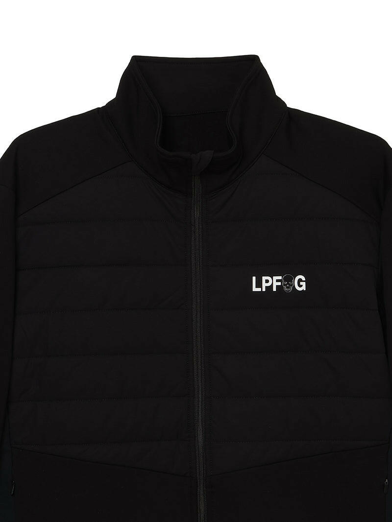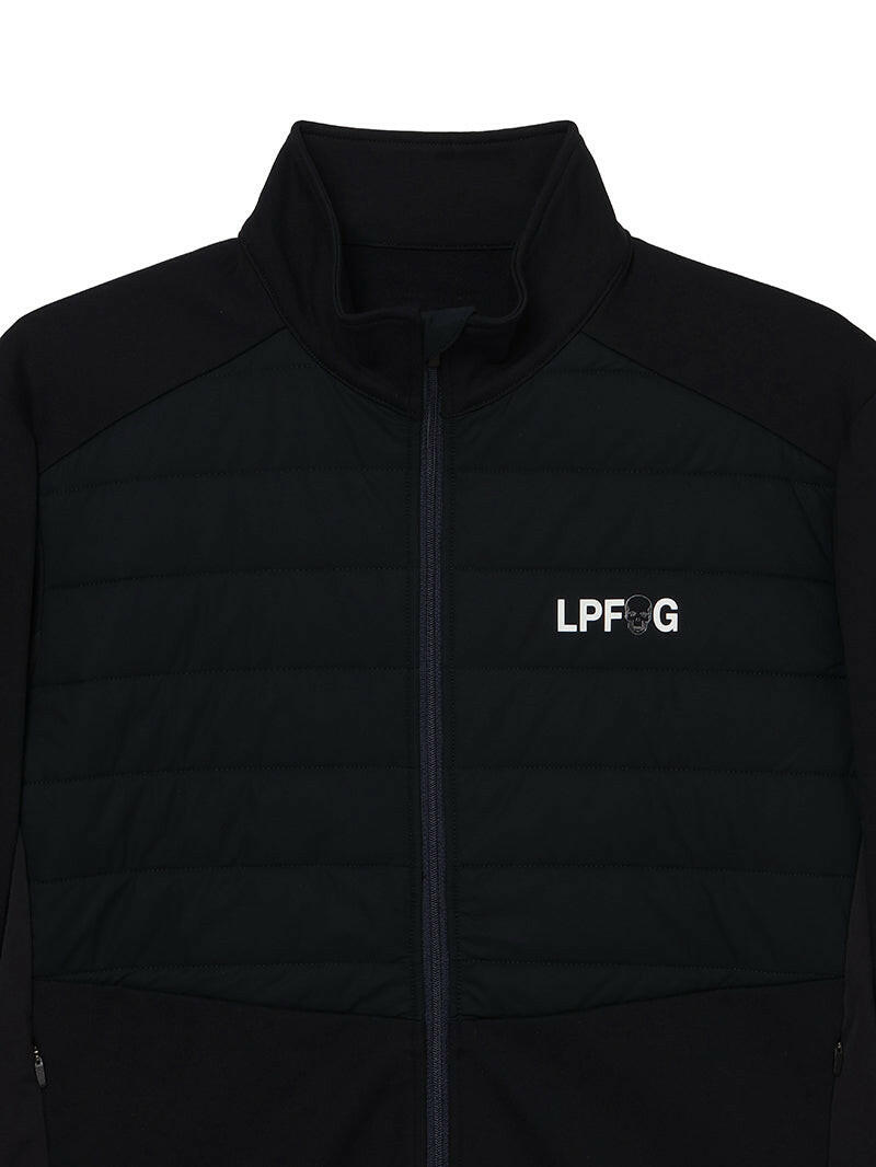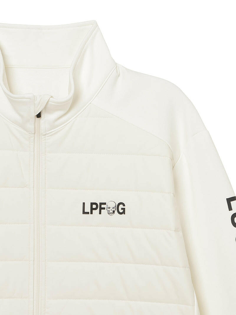LPFGのメンズキルティングジャケット。マットな色合いと軽くてソフトな風合いが特徴の素材。LPFGロゴ、サークルロゴxスカル等、LPFGのアイコンとなるモチーフがワッペンやプリントで随所に表現されている。レーヨンナイロン混紡糸を使用し、ハイゲージで編まれた、程よい光沢感を備えた非常にキックバック性に優れたストレッチ、ハリ感を備えたストレッチポンチ素材となります。また裏側のしなやかなレーヨンを特殊微起毛加工を施し、非常に心地よい肌触りを表現し、糸の性質の吸湿発熱性による暖かさをより一層感じられる素材となります。抗ピル性も備えています。