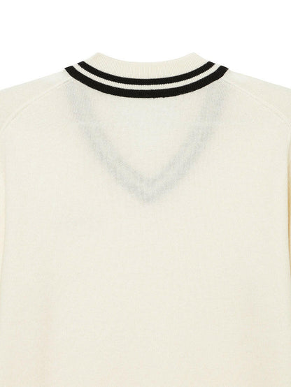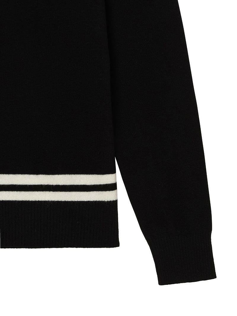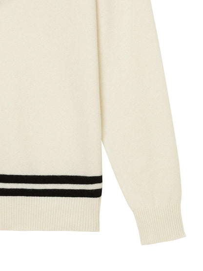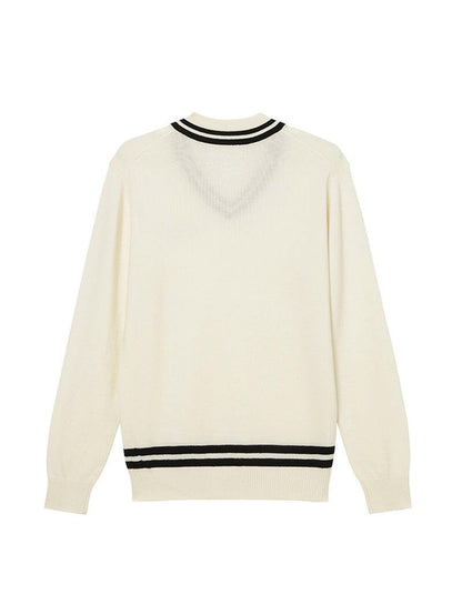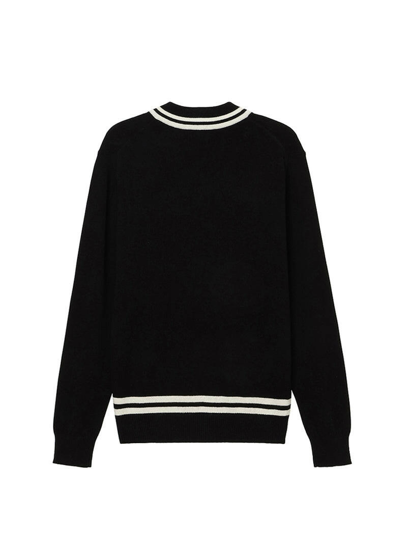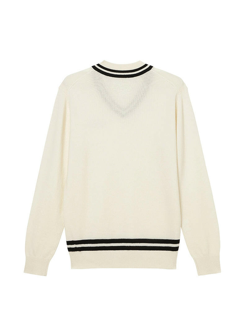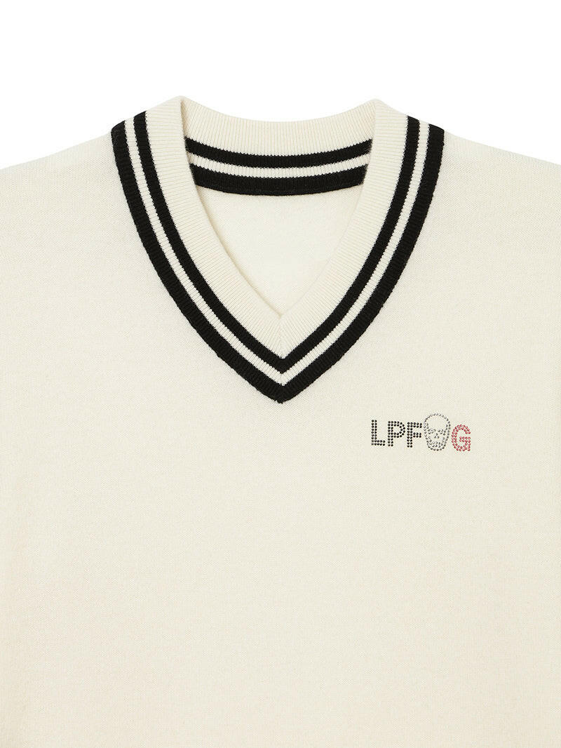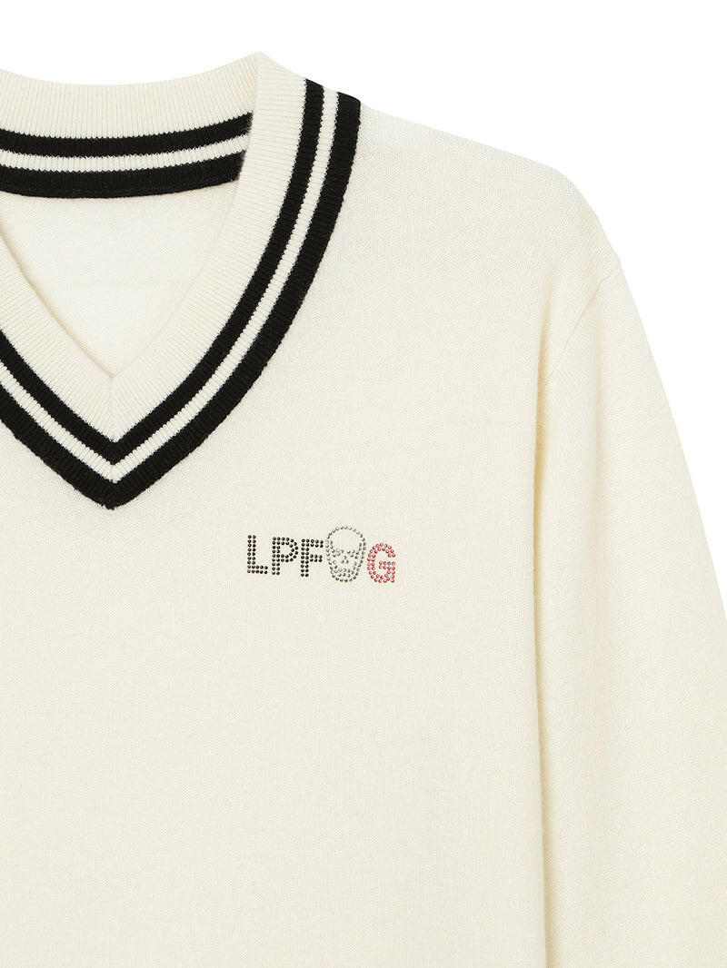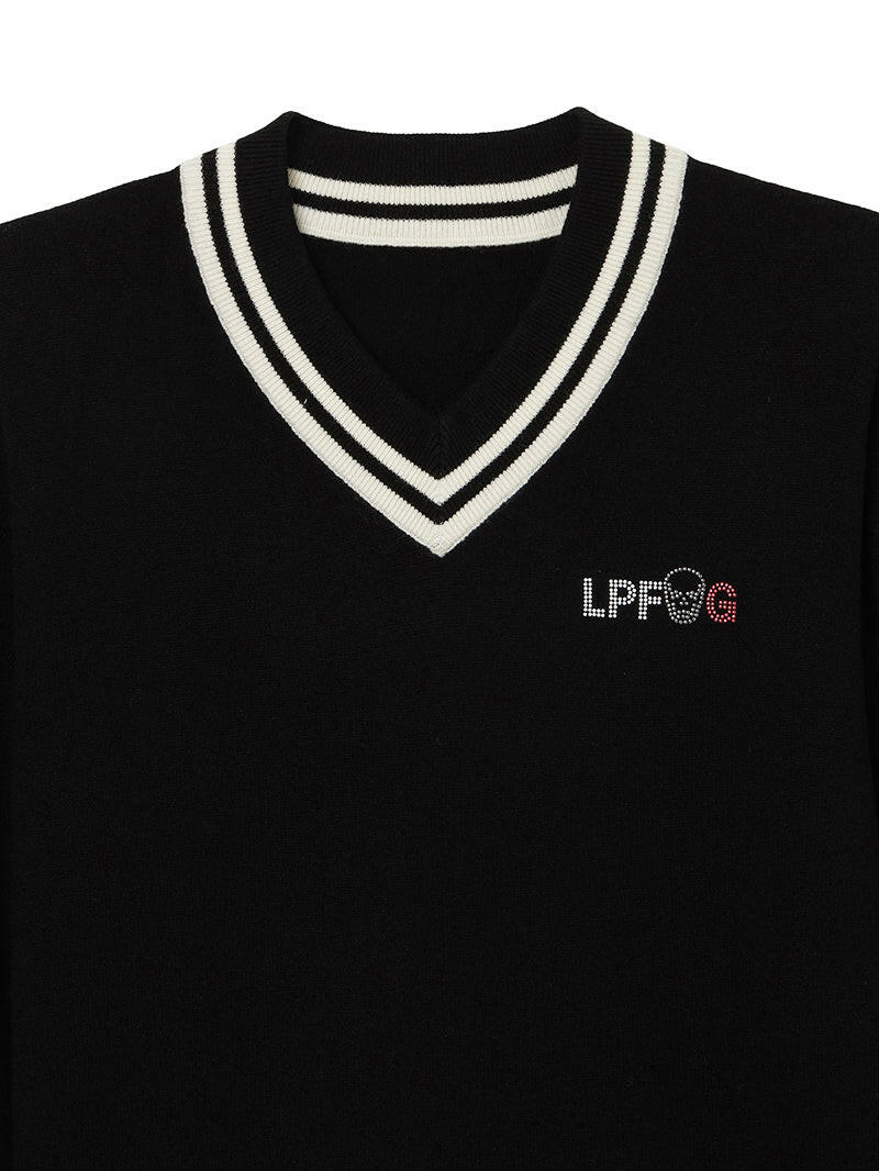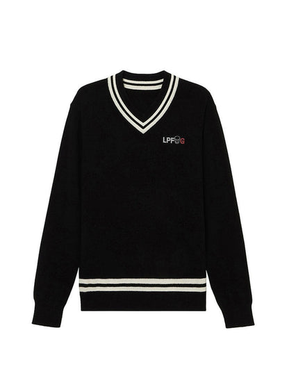 LPFGのメンズVネックセーター。上質なウールとカシミヤをブレンドしたもの。程よい肉厚感で保温性も抜群。ネック部分と、裾部分のバイカラーでの配色がポイント。