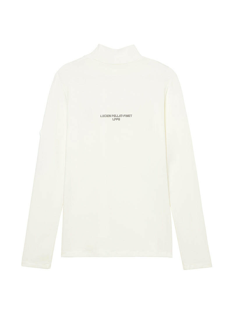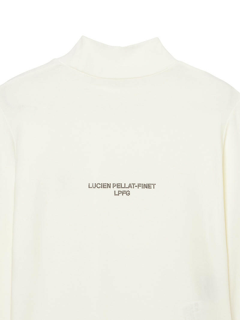 LPFGのウィメンズモックネックプルオーバー。左胸にスカル、左袖にLUCIEN PELLAT-FINET LPFGロゴ、バックにはLUCIEN PELLAT-FINETロゴをデザイン。中肉素材では表現しづらいストレッチ感と膨らみ感を追求し、UVカット、接触冷感効果を備え、かつ非常に軽量でありながらシワになりにくい特徴を備えたダンボールニット素材となります。