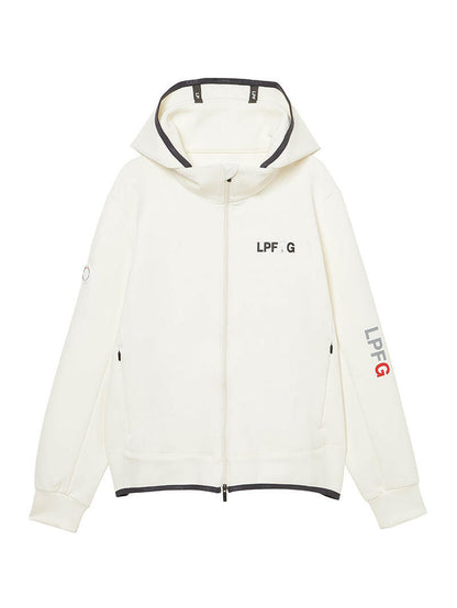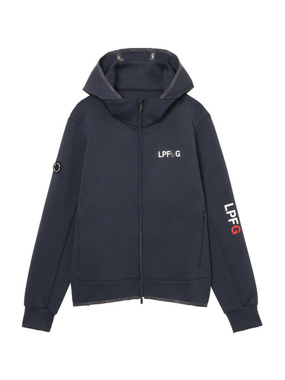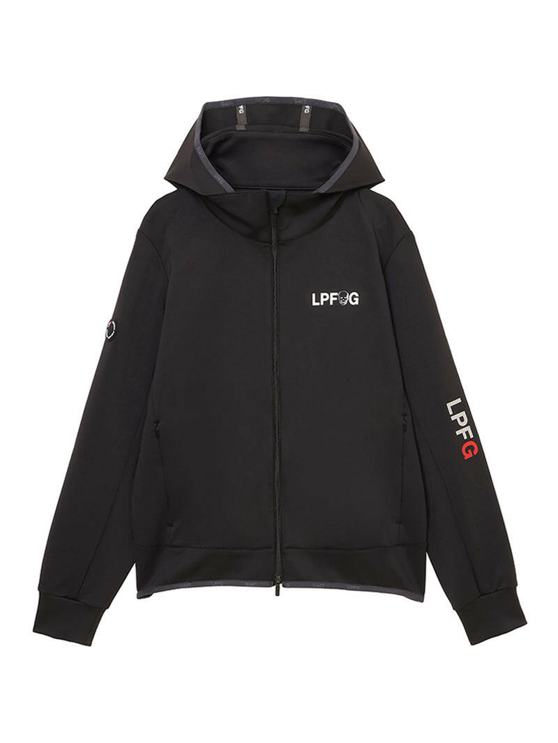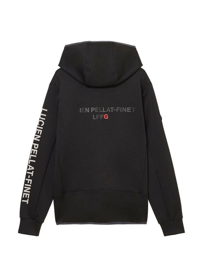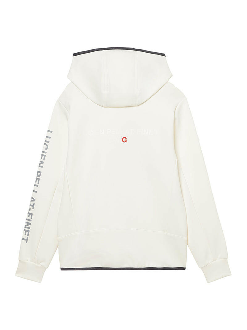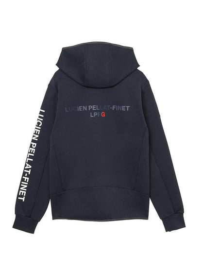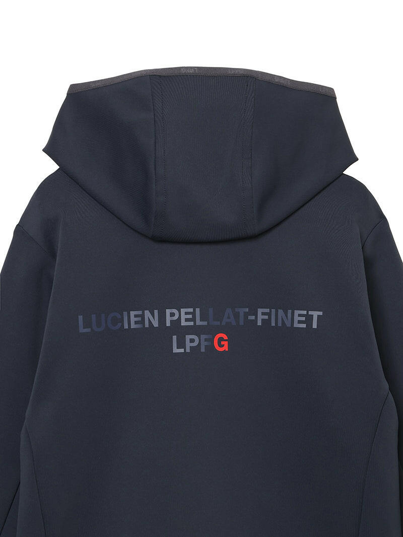 LPFGのウィメンズフードパーカー。左胸にLPFGロゴ、左袖とバックにもLUCIEN PELLAT-FINETロゴを配置。性質の違った高分子を貼り合わせた原料をベースとした糸を使用し, ストレッチ性 、UVカット、耐久性、撥水性、接触冷感 を備えています。
