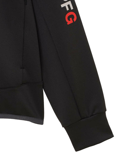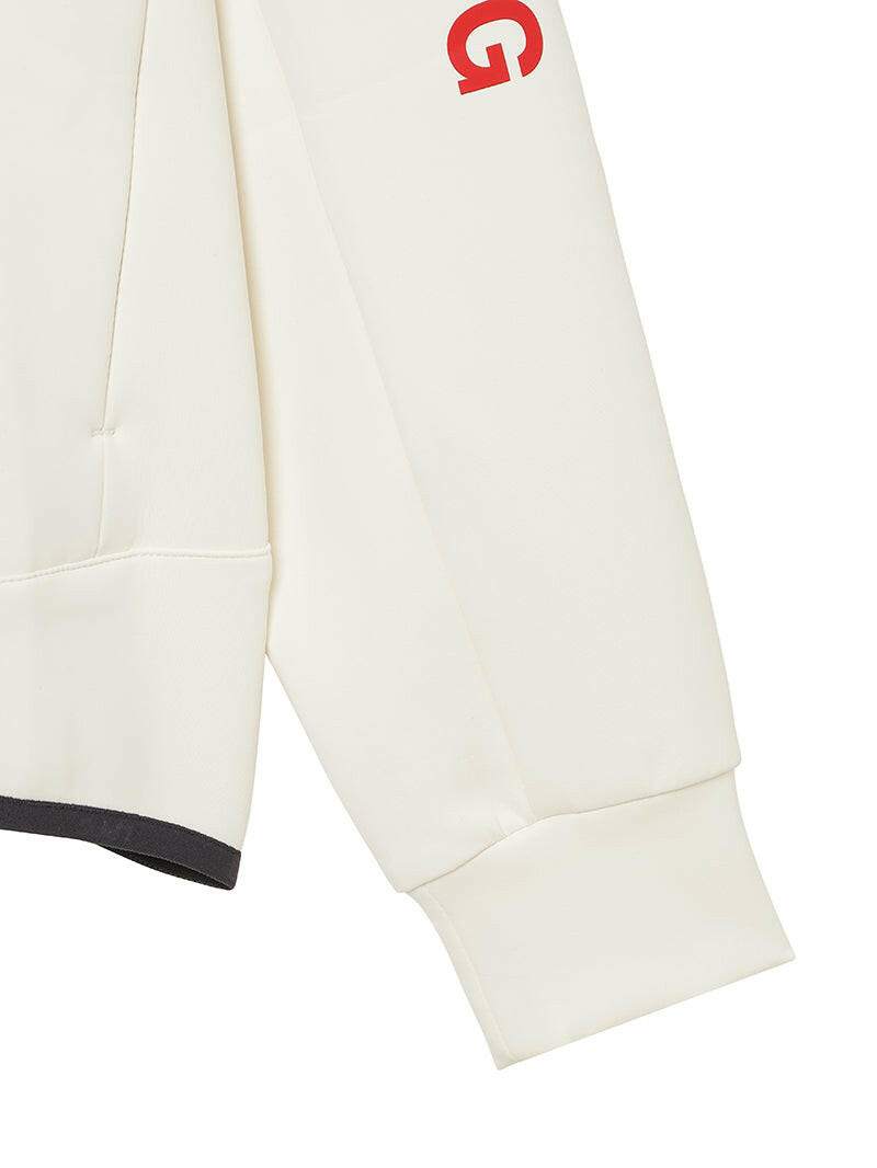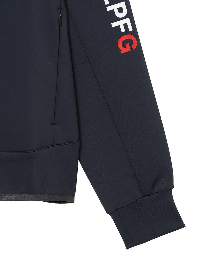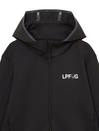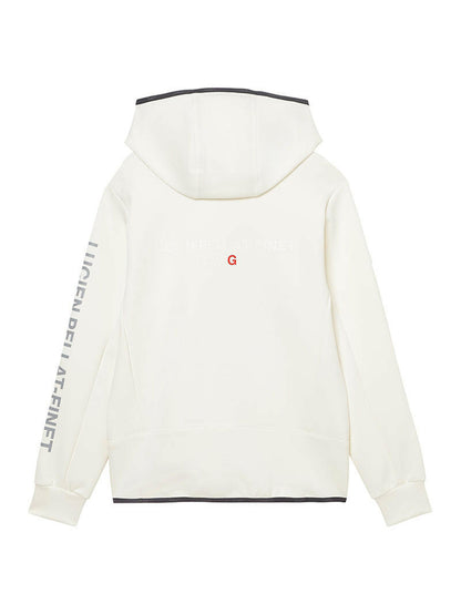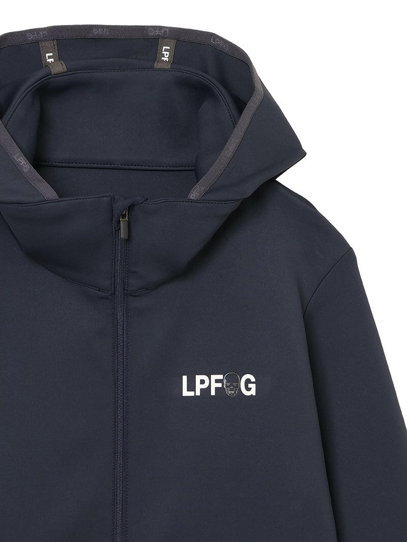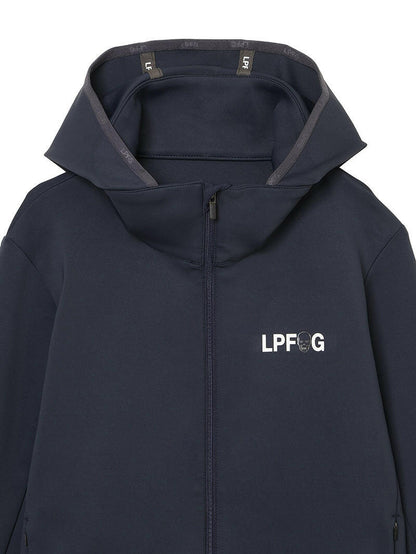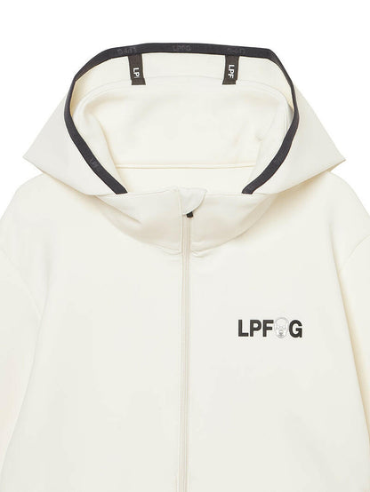 LPFGのウィメンズフードパーカー。左胸にLPFGロゴ、左袖とバックにもLUCIEN PELLAT-FINETロゴを配置。性質の違った高分子を貼り合わせた原料をベースとした糸を使用し, ストレッチ性 、UVカット、耐久性、撥水性、接触冷感 を備えています。