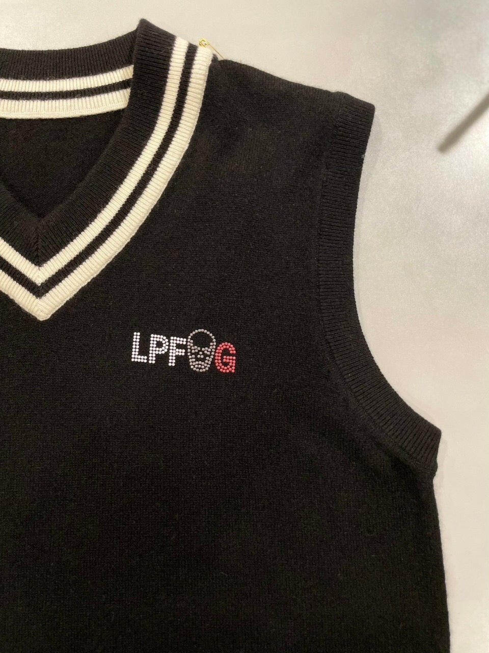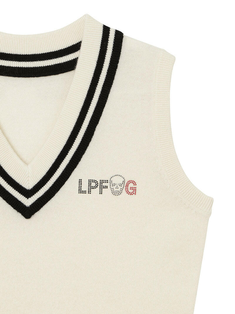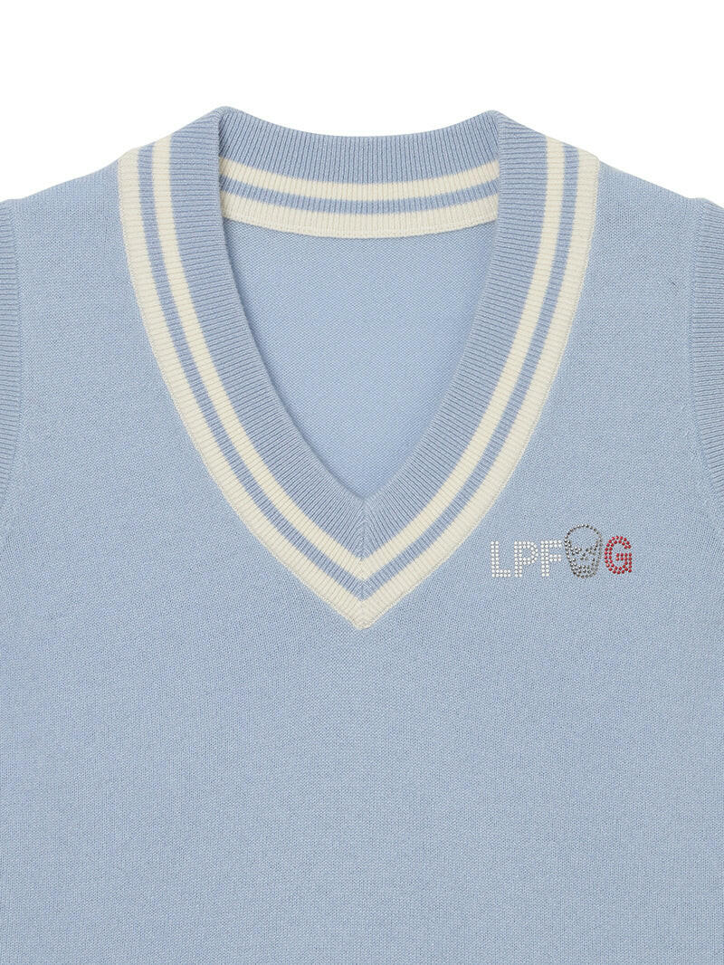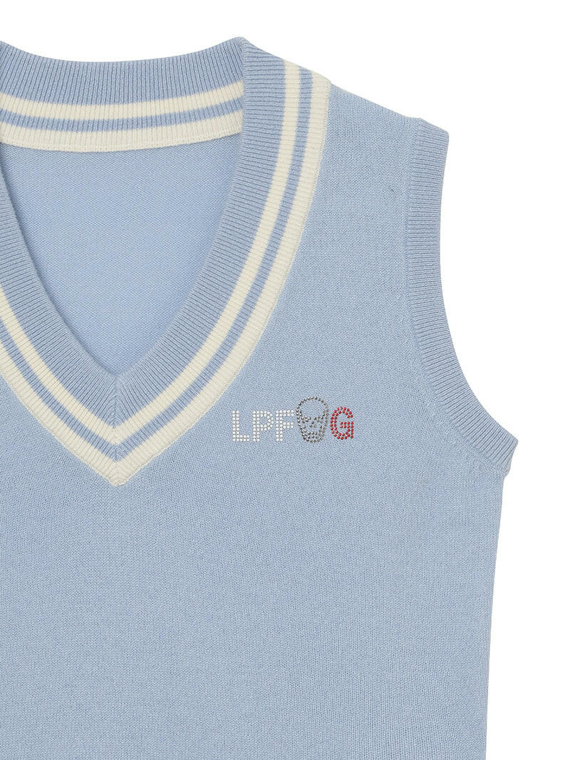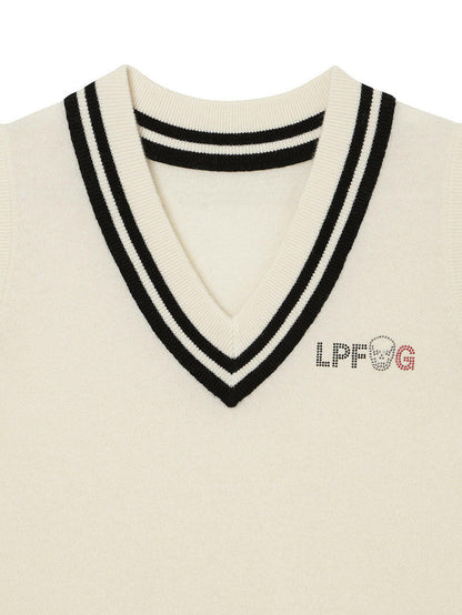 LPFGのウィメンズVネックベスト。上質なウールとカシミヤをブレンドしたもの。程よい肉厚感で保温性も抜群。ネック部分と、裾部分のバイカラーでの配色がポイント。