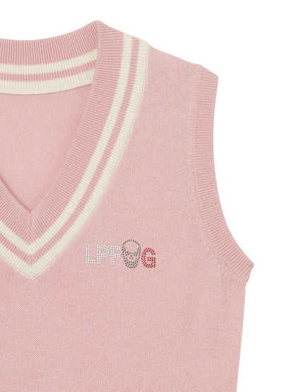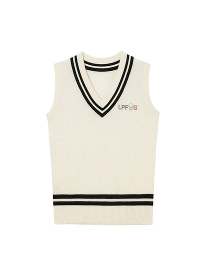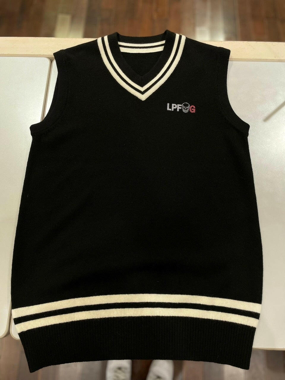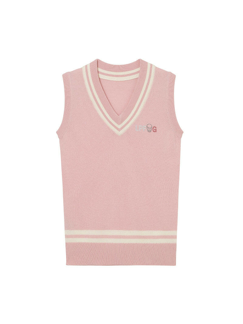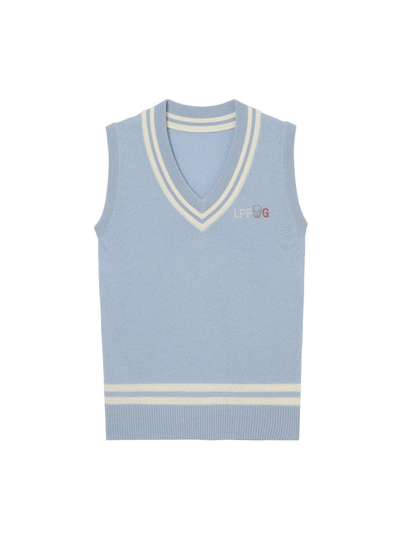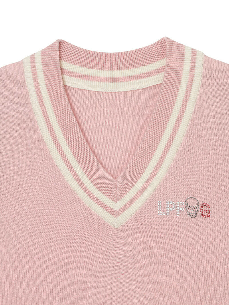LPFGのウィメンズVネックベスト。上質なウールとカシミヤをブレンドしたもの。程よい肉厚感で保温性も抜群。ネック部分と、裾部分のバイカラーでの配色がポイント。