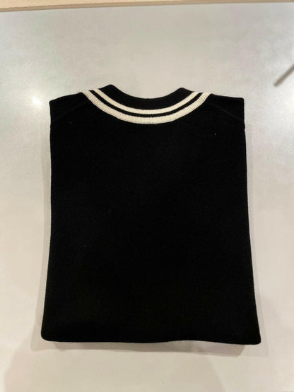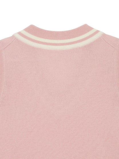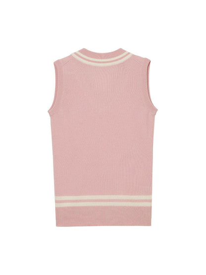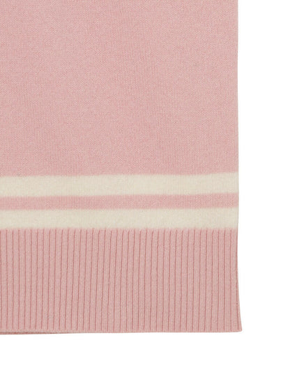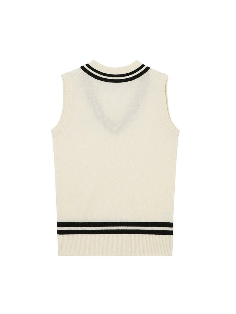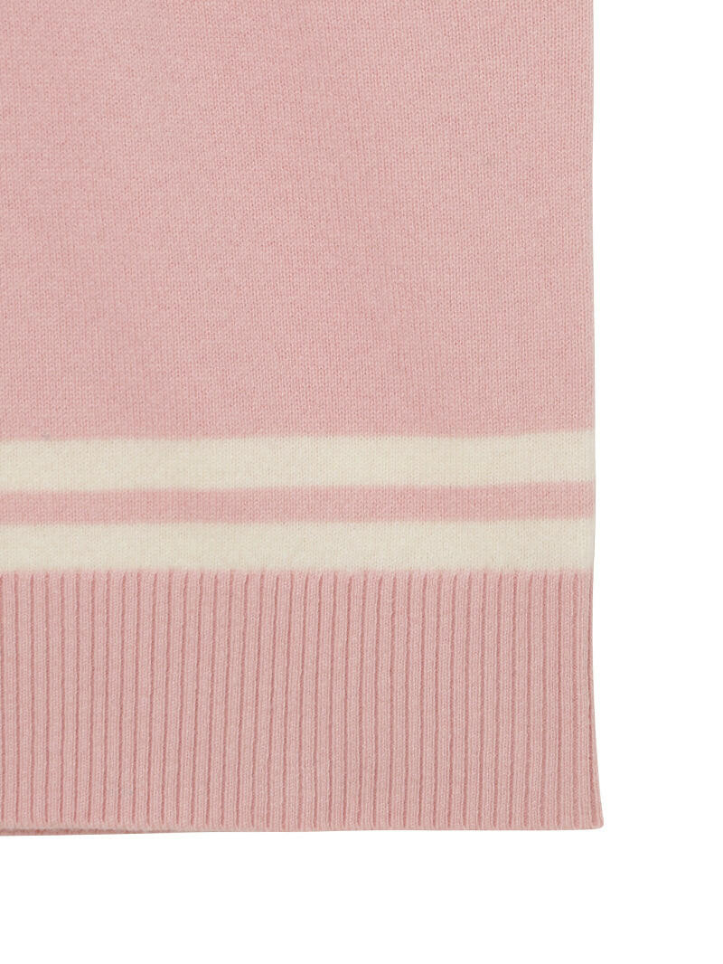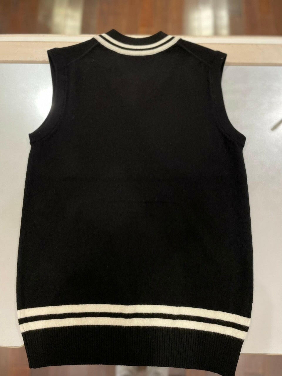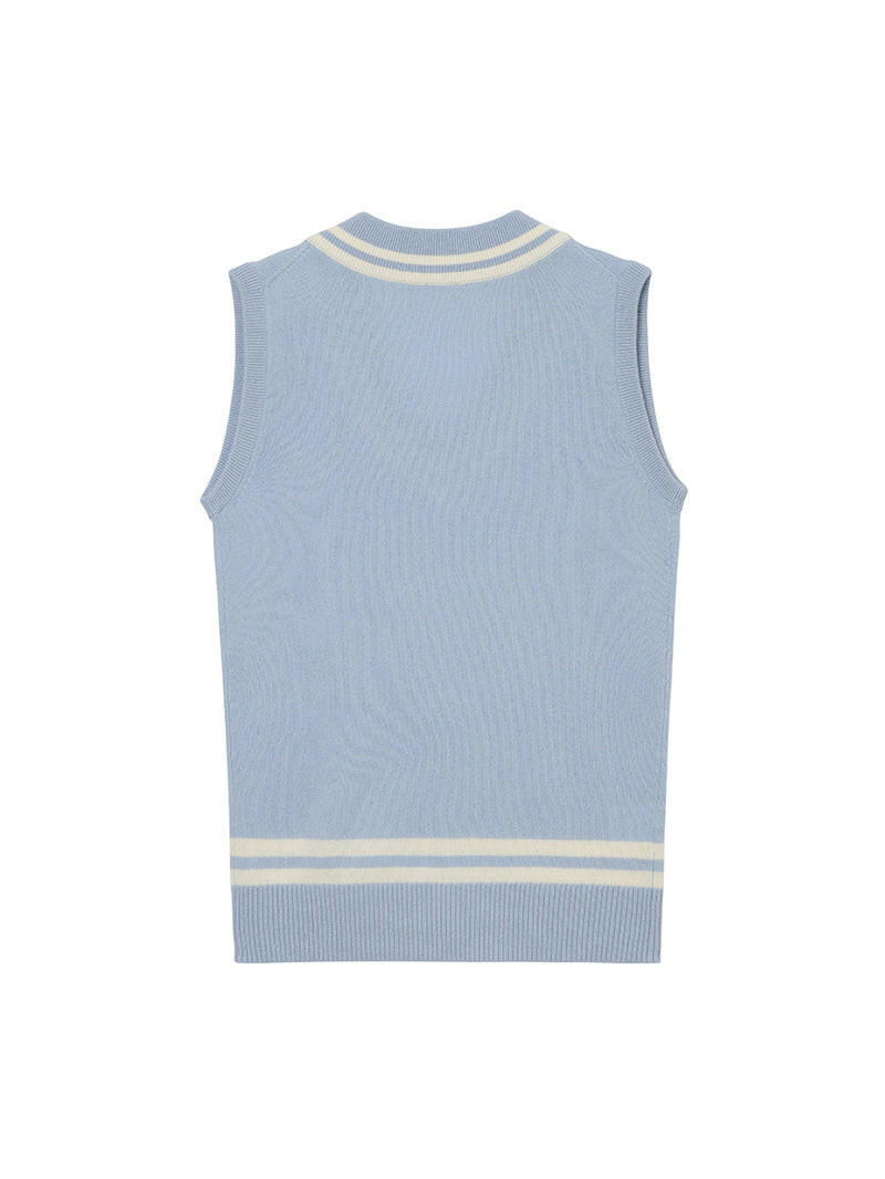 LPFGのウィメンズVネックベスト。上質なウールとカシミヤをブレンドしたもの。程よい肉厚感で保温性も抜群。ネック部分と、裾部分のバイカラーでの配色がポイント。