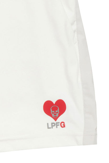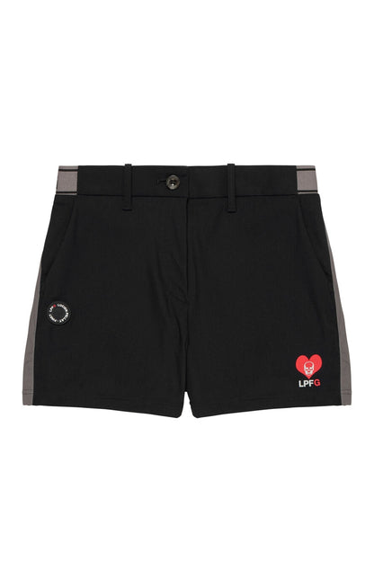 LPFGのウィメンズショートパンツ。滑らかな肌触りと高いストレッチ性を併せ持つアクティブなジャージー素材で、快適な着心地。LPFGのアイコンとなるロゴ、ハートスカル、サークルロゴxスカルがジャガード、ワッペンやプリントで表現されている。