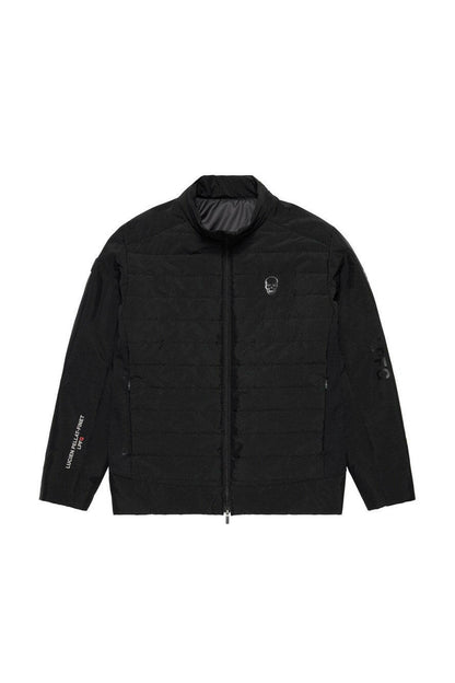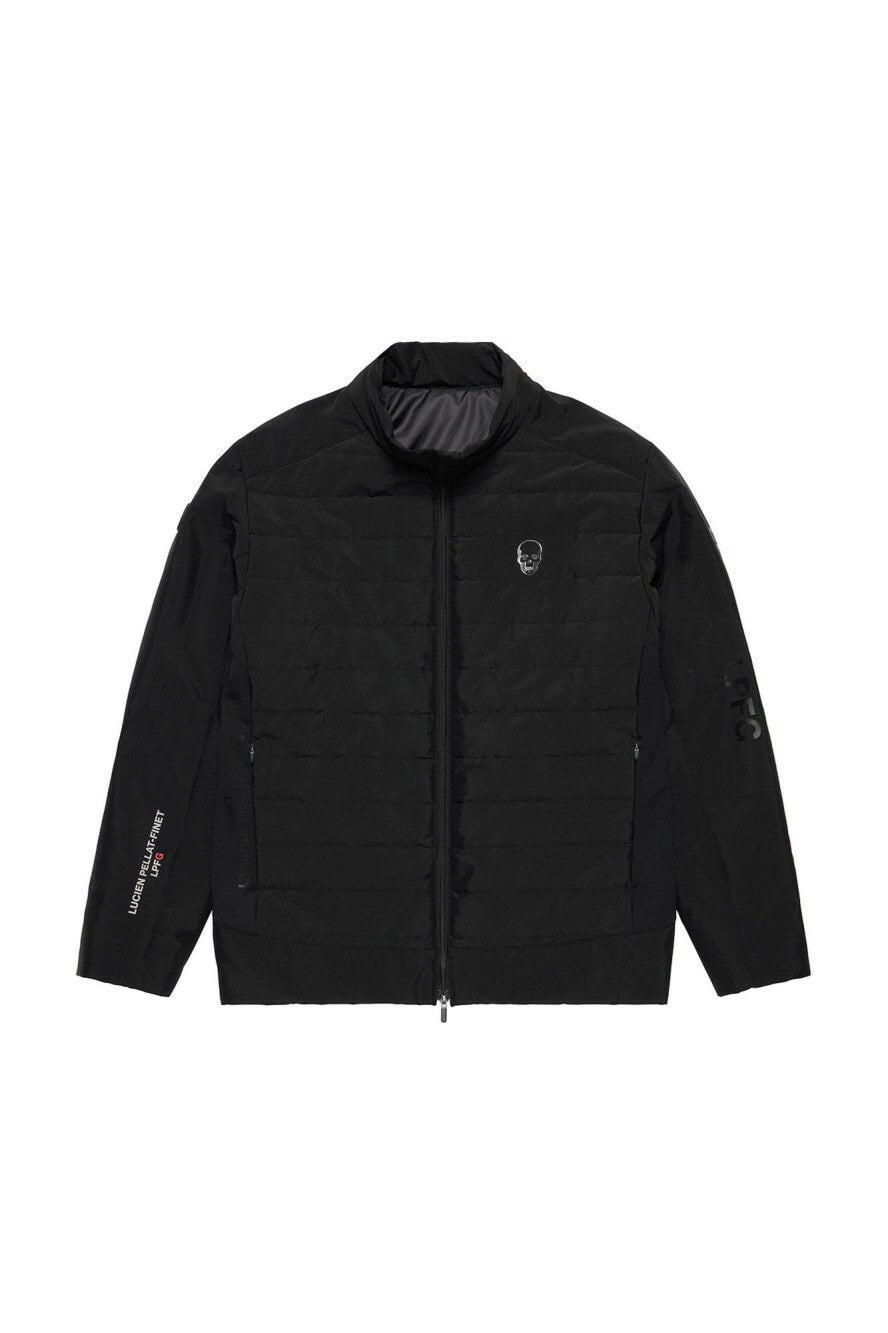 LPFGのメンズ中綿キルティングジャケット。主素材はタフでドライなタッチと耐久撥水性を持つストレッチ素材。ストレッチ性と着用快適性を兼ね備える。脇にはストレッチ性の高いダンボールニットを別布使い。LPFGロゴ、スカル、サークルロゴxスカル等、LPFGのアイコンとなるモチーフがワッペンやプリントで随所に表現されている。