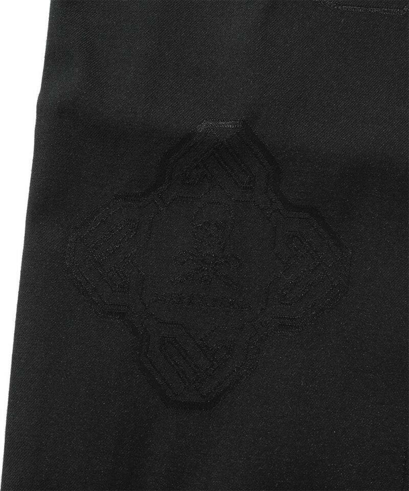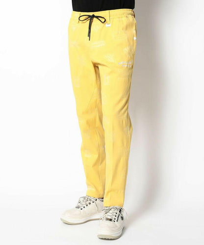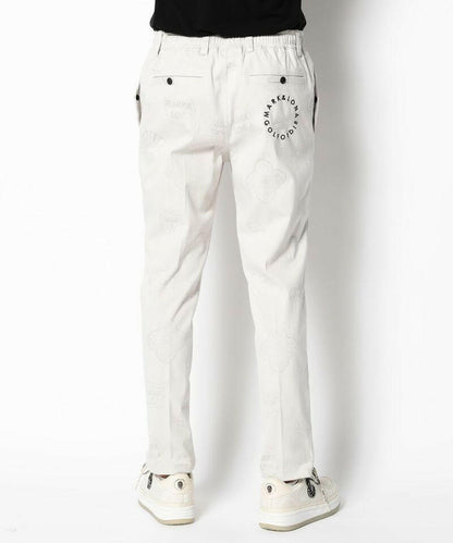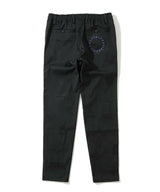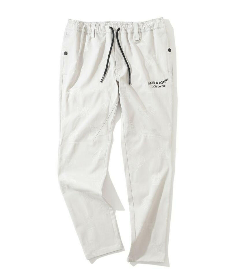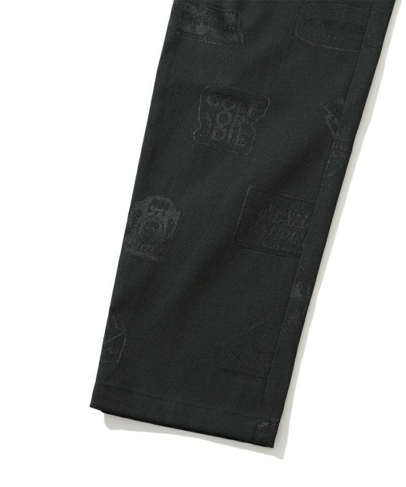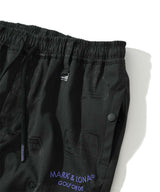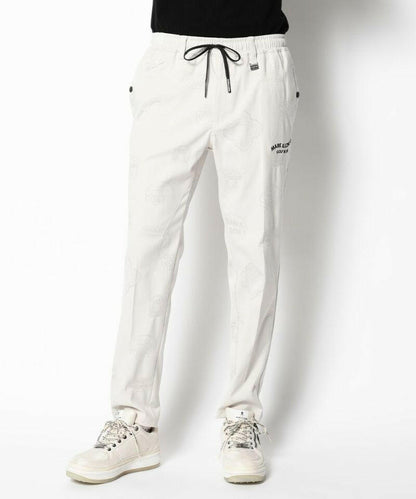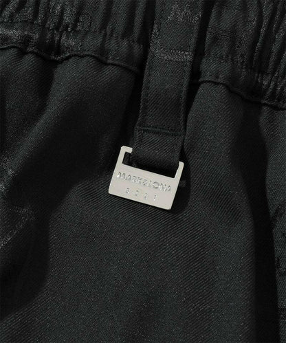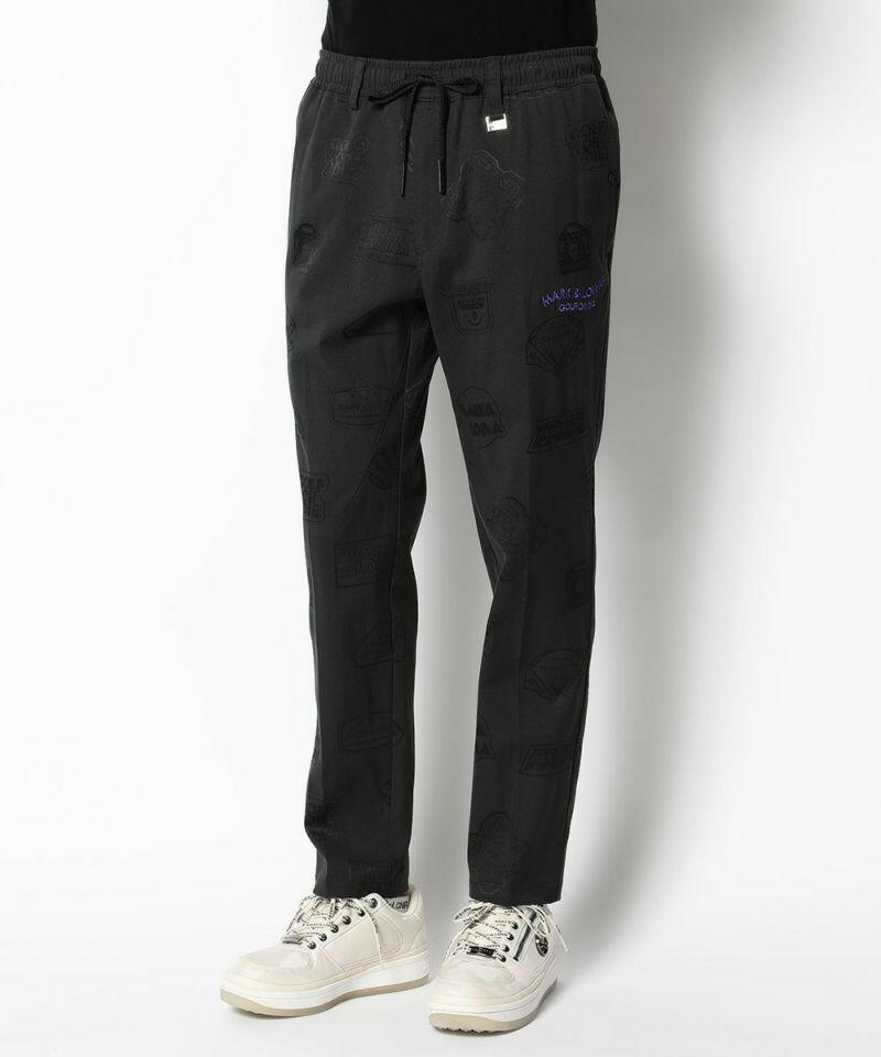 シグネチャーロゴをちりばめたオリジナルワッペンをジャカードで表現し、ワントーンでスポーティなデザインに仕上げたイージーパンツ。左モモにウェーブロゴの刺繍、右ヒップにサークルレタリングロゴの刺繍、ベルトループにロゴ刻印入りミニチャーム、ウエストにロゴプリント入りシリコンディップコード、フロントにロゴが刻印されたラバータッチのプランサーボタンを配しました。