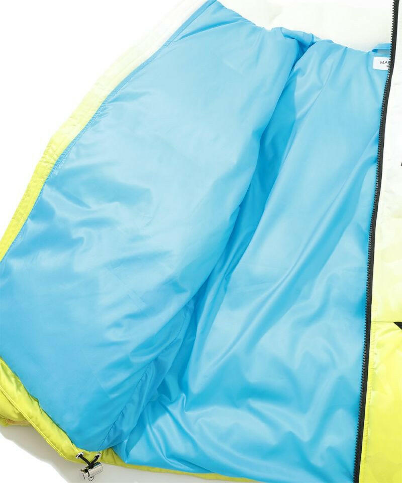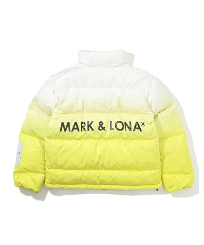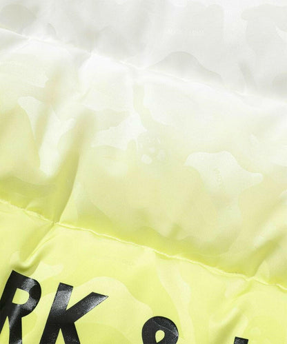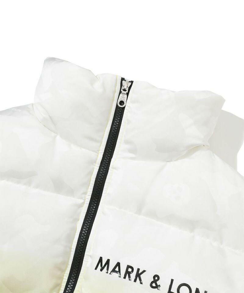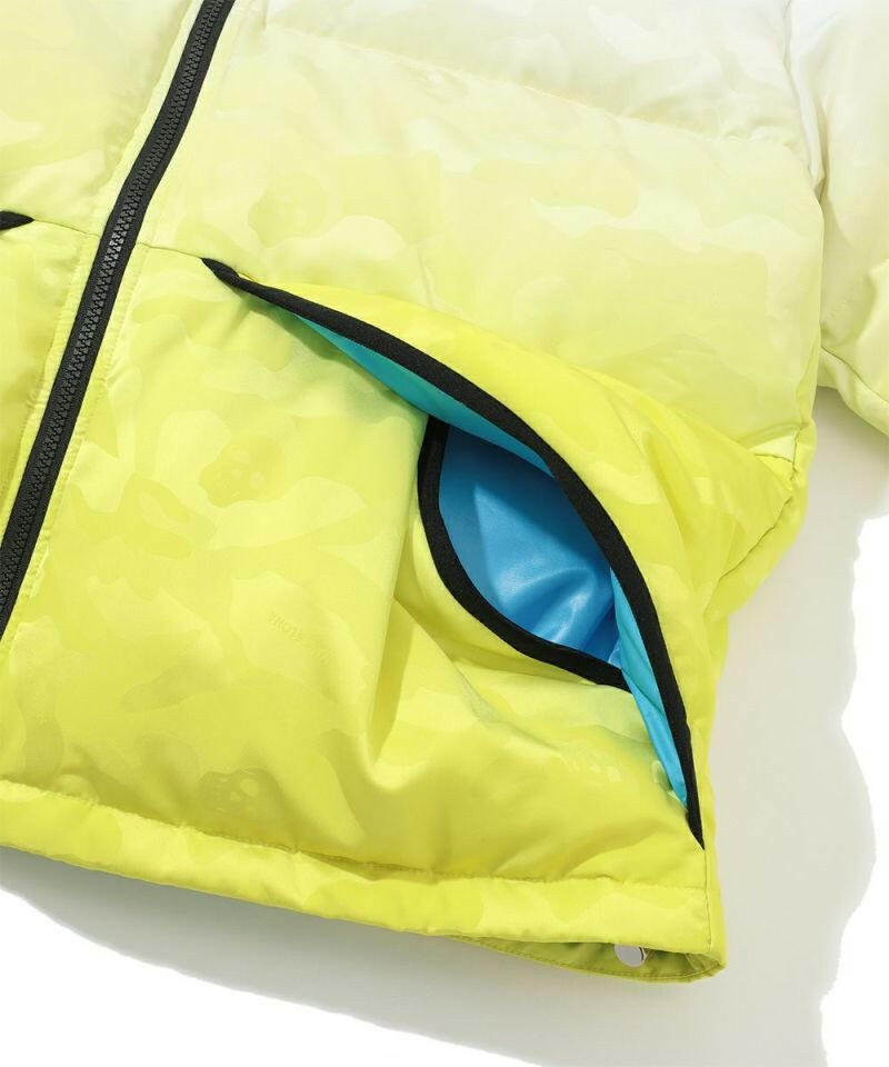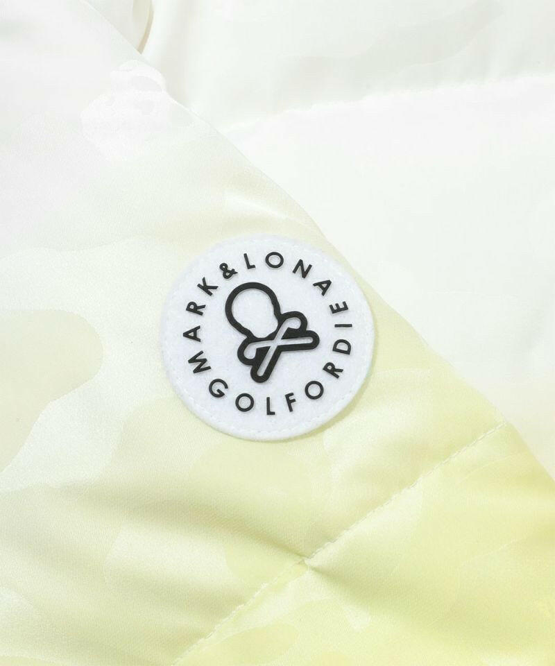 シンプルなグラデーションカラーに対して、鮮やかな裏地のカラーが映えるビッグボリュームダウンジャケット。MARK & LONAのシグネチャーパターンであるスカル×カモフラ柄ジャカード素材を全面にデザイン。左袖にデュアルスカルロゴをツイル目の中にジャカードで表現した織りネーム、右袖にブランクスカルサークルロゴのシリコンワッペン、左胸と背中にブランドロゴのプリントを配しました。防寒着としての着用を目的としたビッグサイズなシルエットながら、非常に軽量で動きやすいため、フレキシブルなプレーや着脱が可能です。