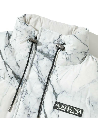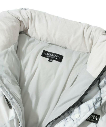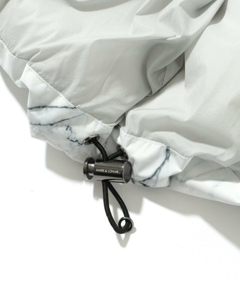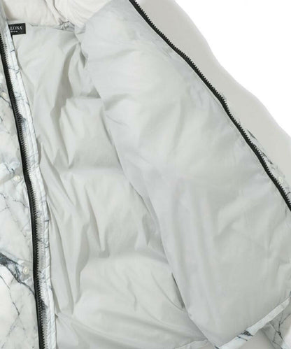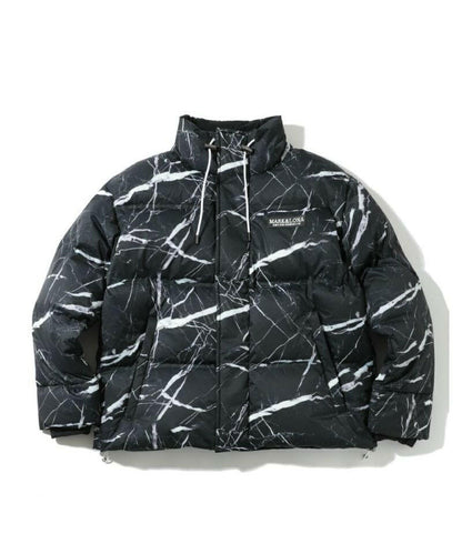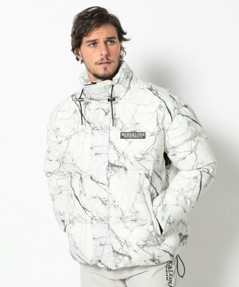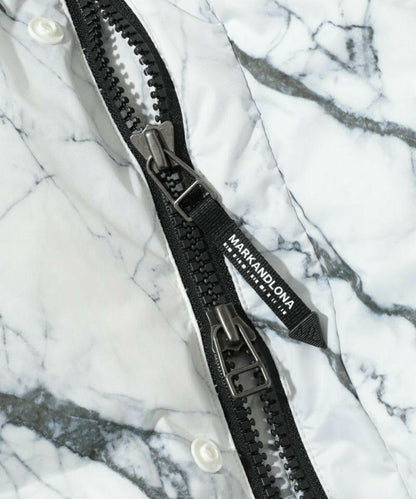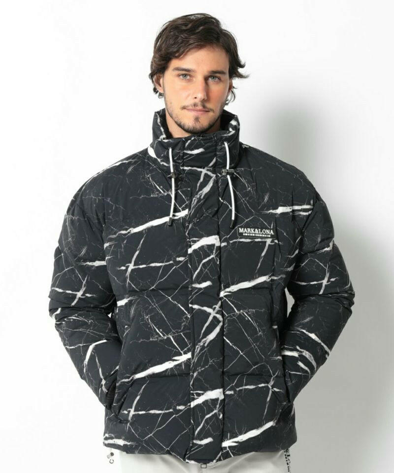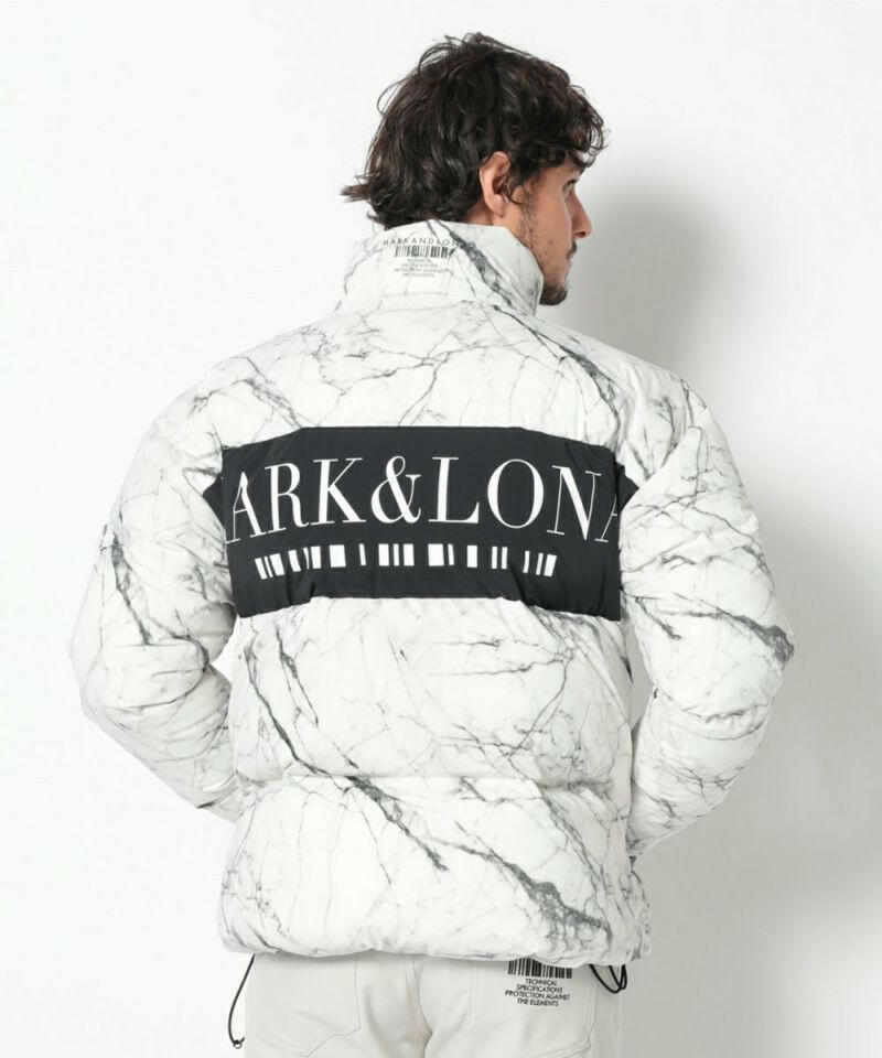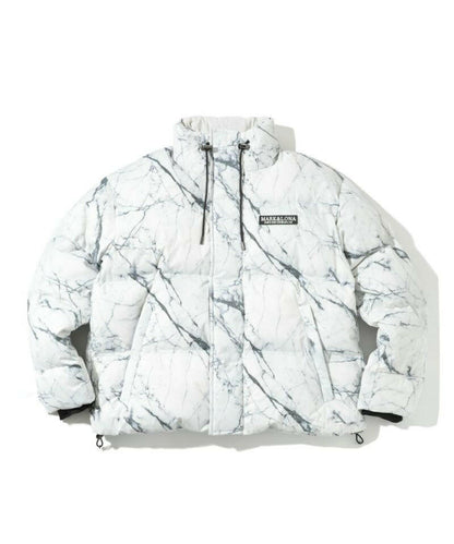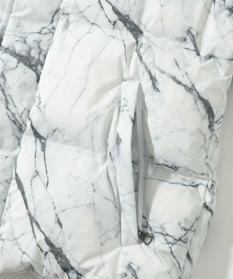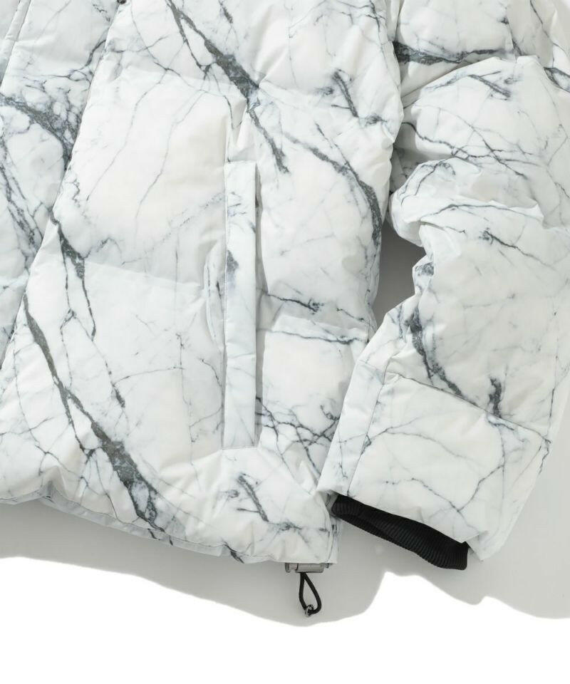 保温性と軽量性を実現しつつ、縫い目を極力排除したシームレスなビッグボリュームダウンジャケット。CODEラインの最もシンボリックな大理石柄をダイナミックにプリントしました。左胸にCODEのシグネチャーロゴを立体プリントした合皮ワッペン、背中にCODEのシグネチャーBIGロゴのツヤプリント、襟にCODEのテキストロゴをプリントしました。各所アイレットにはロゴが刻印されています。防寒着としての着用を目的としたビッグサイズなシルエットながら、非常に軽量で動きやすいため、フレキシブルなプレーや着脱が可能。袖口は2層構造になっており、内側は手首にぴったりとフィットして風の侵入を防ぐリブ構造になっています。襟と裾のアジャスト機能を活用することで、さらに防風効果を高めます。
