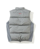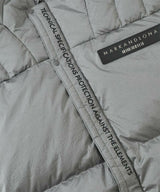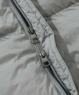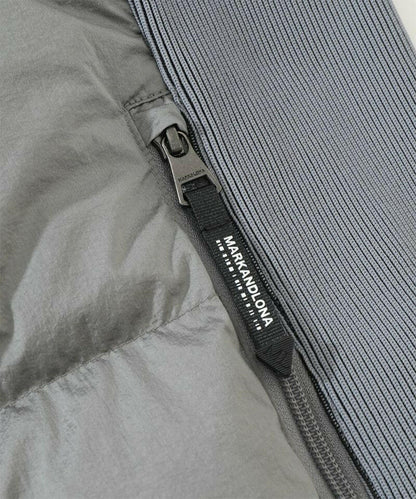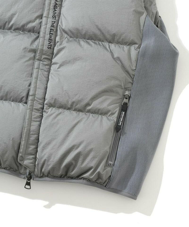 黒色の原着糸を織り込むことで、独特な深みのある色を表現したナイロンタフタ素材を採用。中空状のナイロン糸を織り込むことでより軽くなり、さらに空気を溜めこむので保温性にも長けた素材です。ほどよいストレッチ性をもたせ、デザインのアクセントにもなるよう脇に編立リブを採用。リブが広がると配色カラーがちらりと覗き見えるディテールも特徴です。