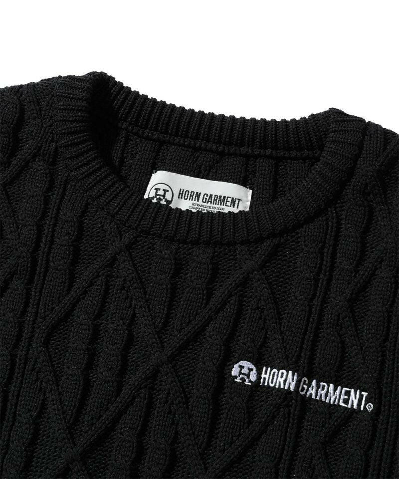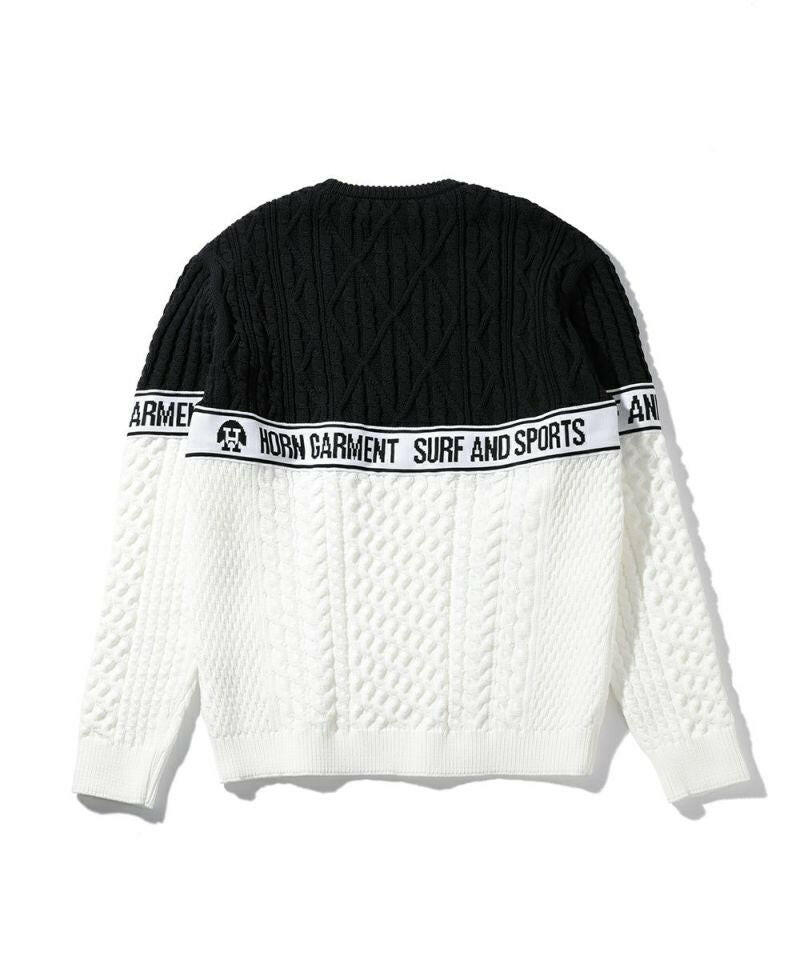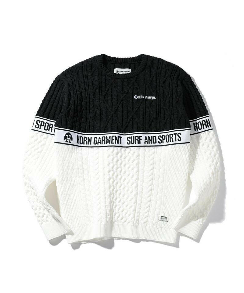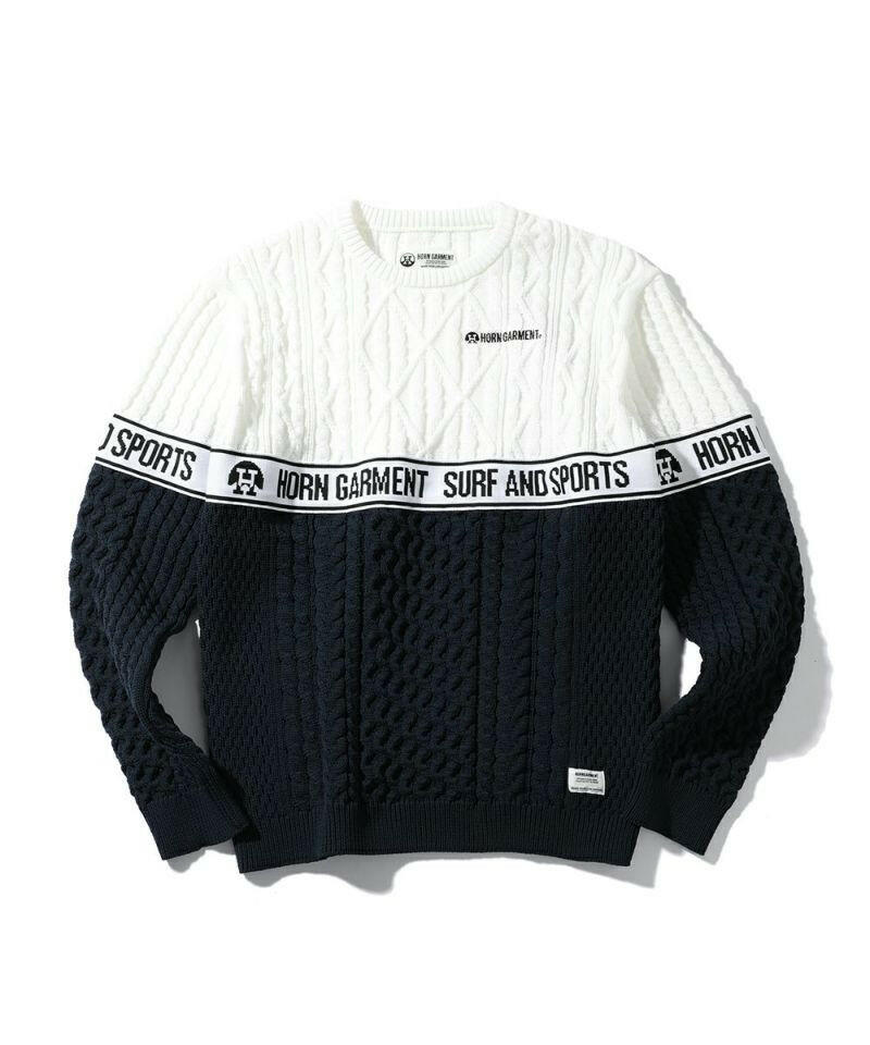 2トーン、2パターンのコンビネーションデザインが印象的なケーブルニット。左胸にブランドロゴ刺繍、左裾にブランドネームをあしらっています。