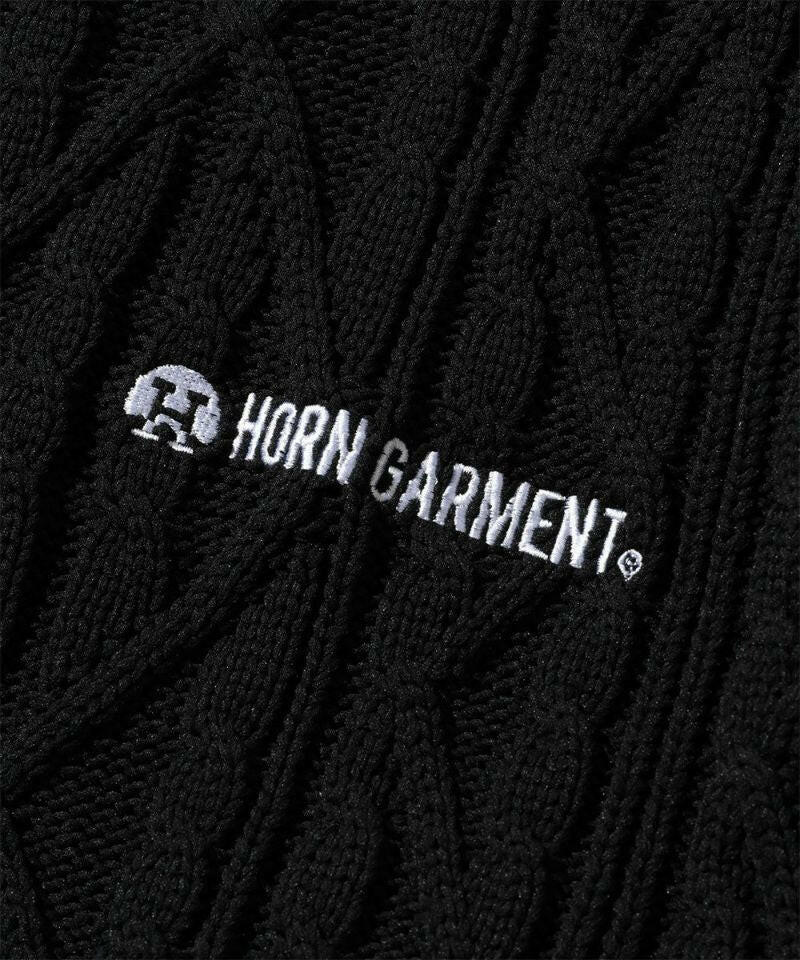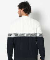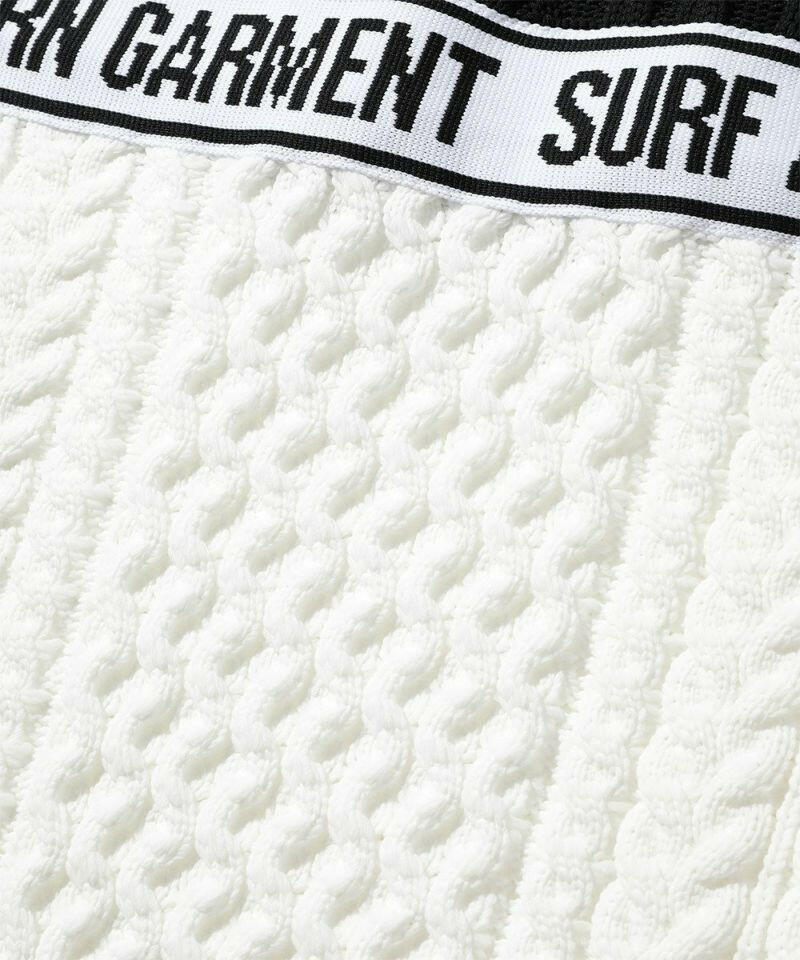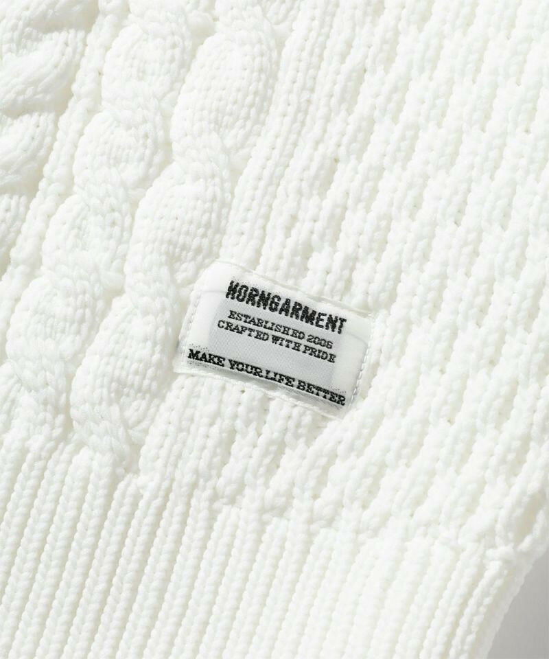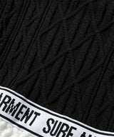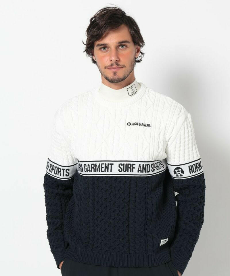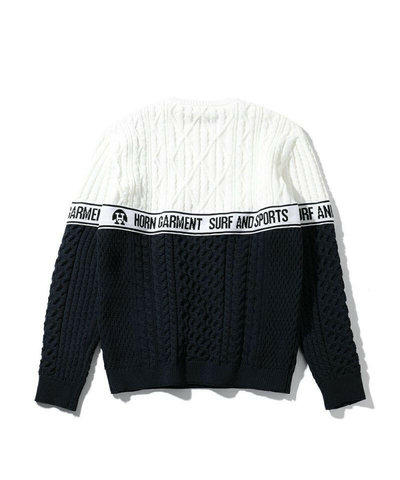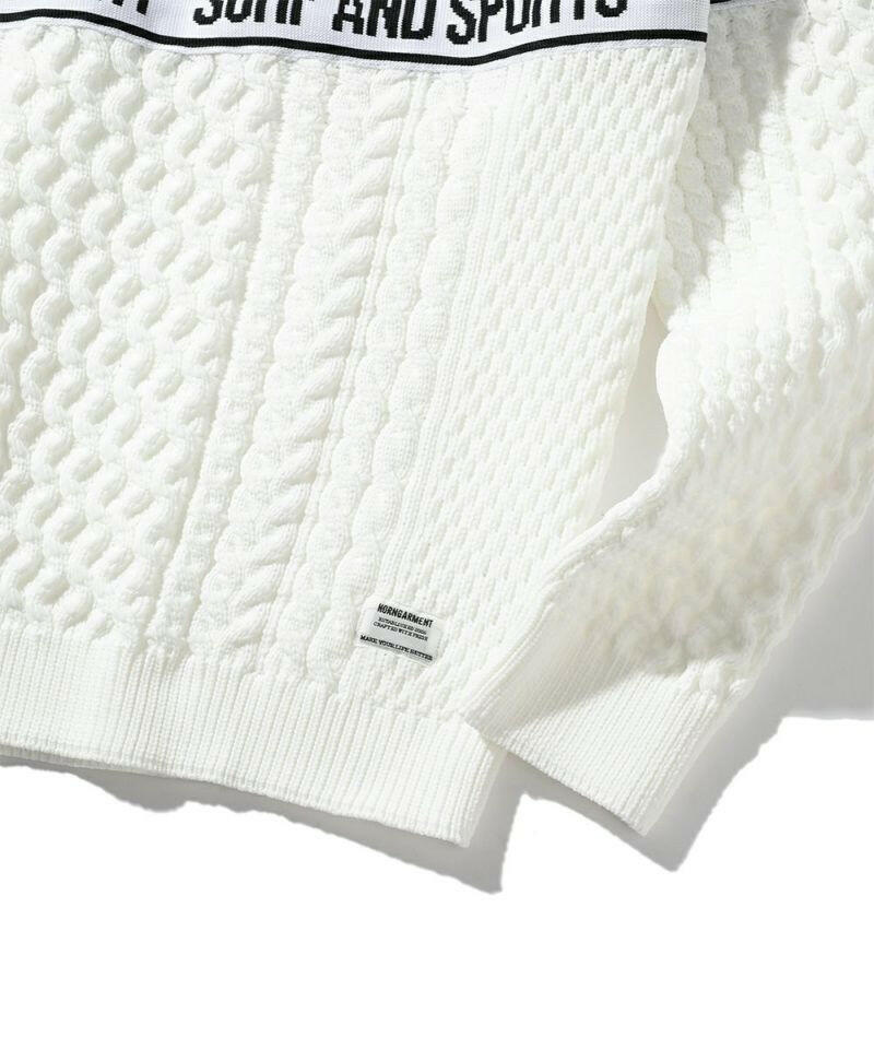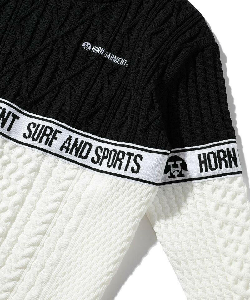 軽量かつ柔軟性に優れたポリエステル糸を使用し、上下で異なるケーブルパターンと配色デザインで構成。本体は5ゲージのケーブル編み、“SURF AND SPORTS HORN GARMENT”のロゴが入ったジャカードテープは16ゲージで表現しました。