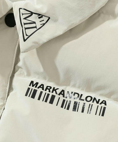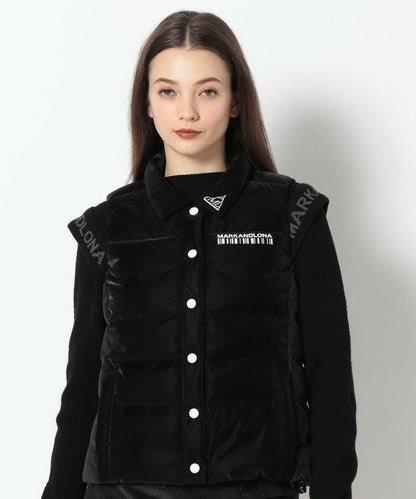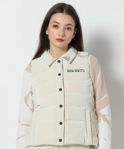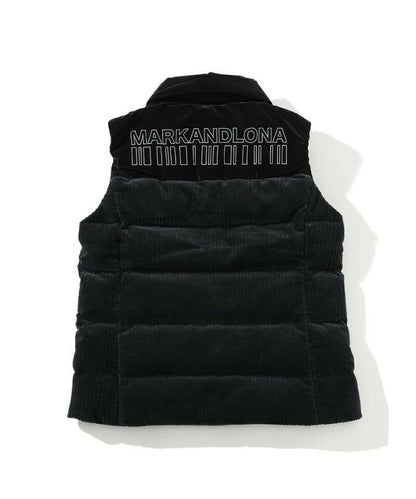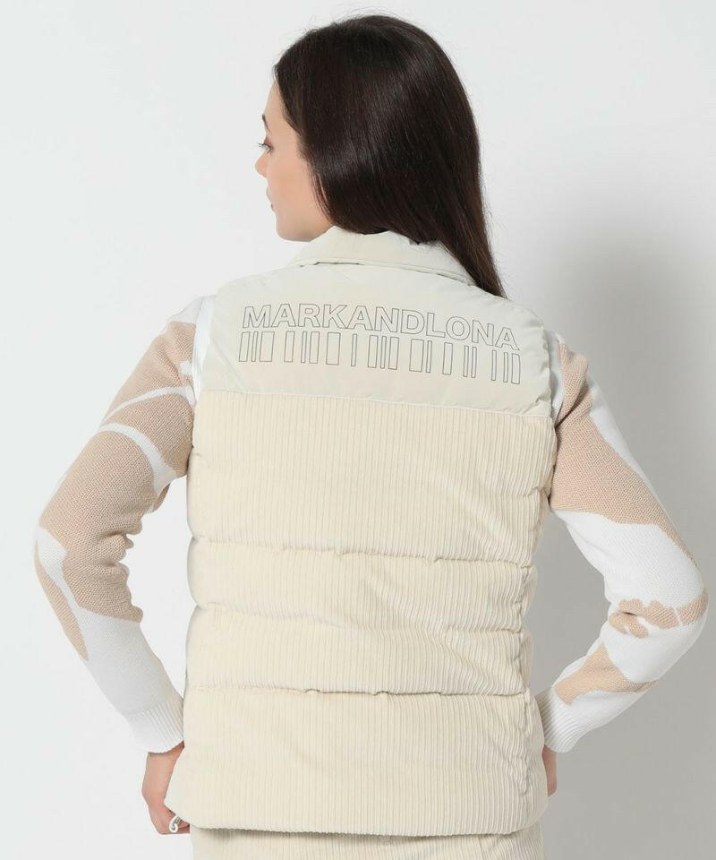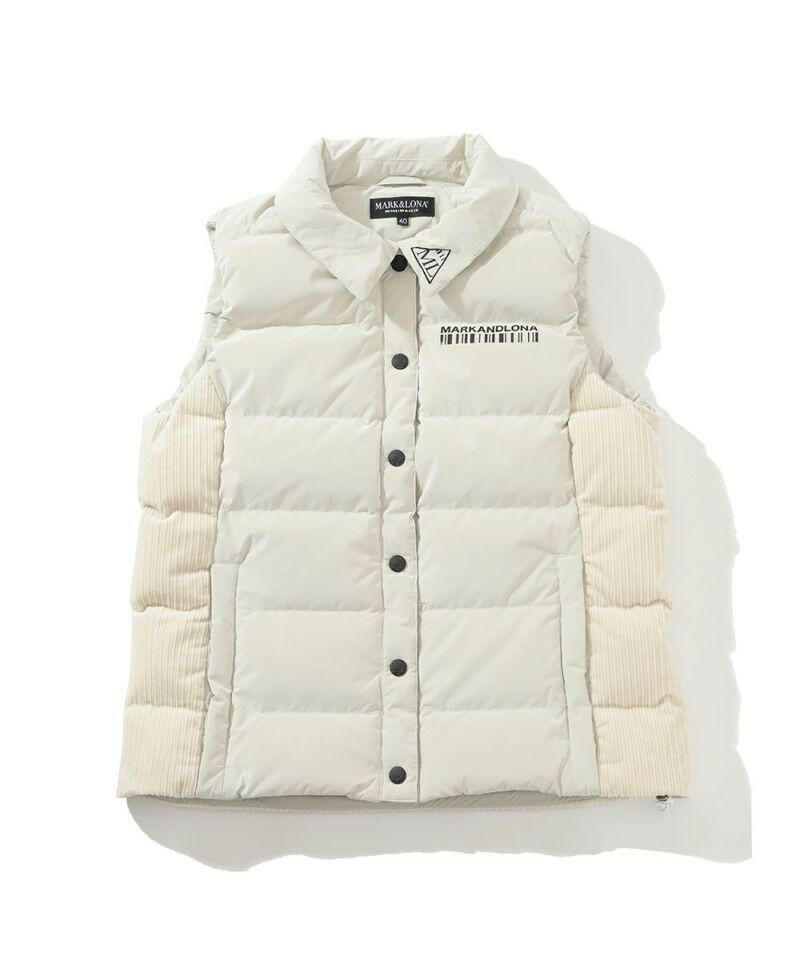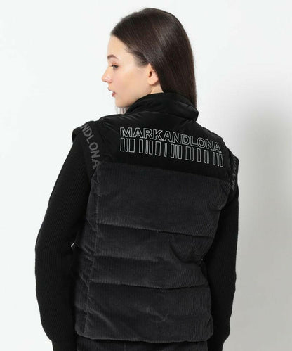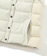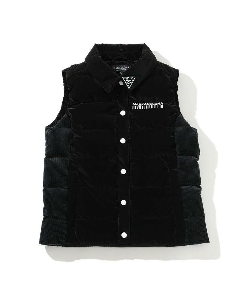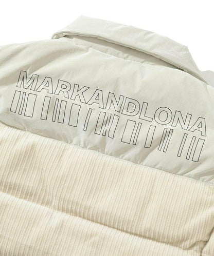 コーデュロイと優美な光沢をもつ異素材を掛け合わせたシャツ襟付きダウンベスト。左胸にCODEのロゴプリント、左襟にCODEトライアングルロゴプリント、後ろヨークにCODEアウトラインロゴプリント、フロントにロゴ刻印入りのラバータッチプランサーボタン、裾のスピンドル口にロゴ刻印入りのアイレットをあしらいました。レギュラーフィットのサイズ感で、裾スピンドルを絞ることで風の侵入を防いで暖かさをキープしつつ、スイング時の余分な裾まわりを体に沿わせることができます。