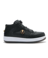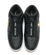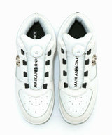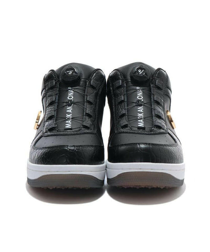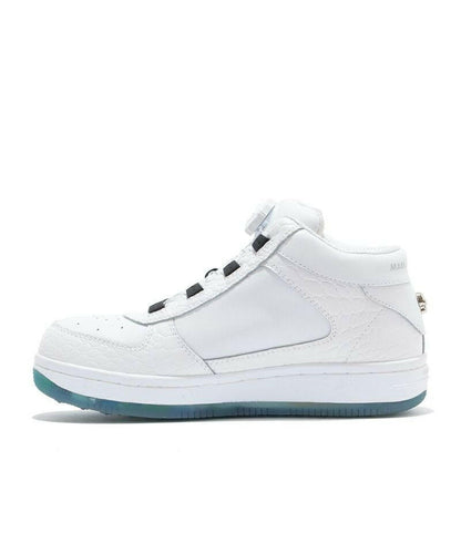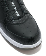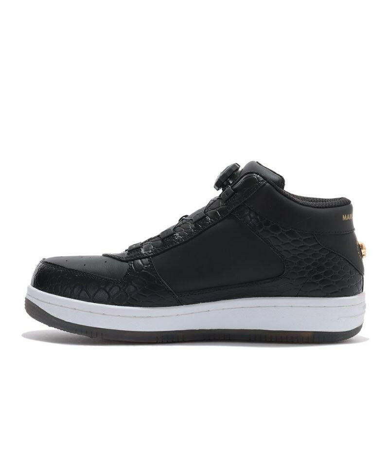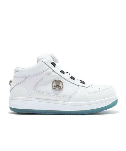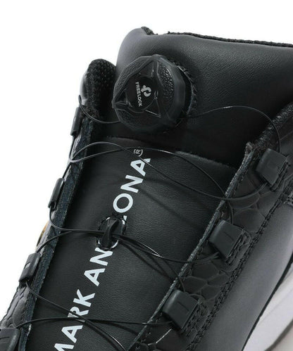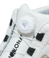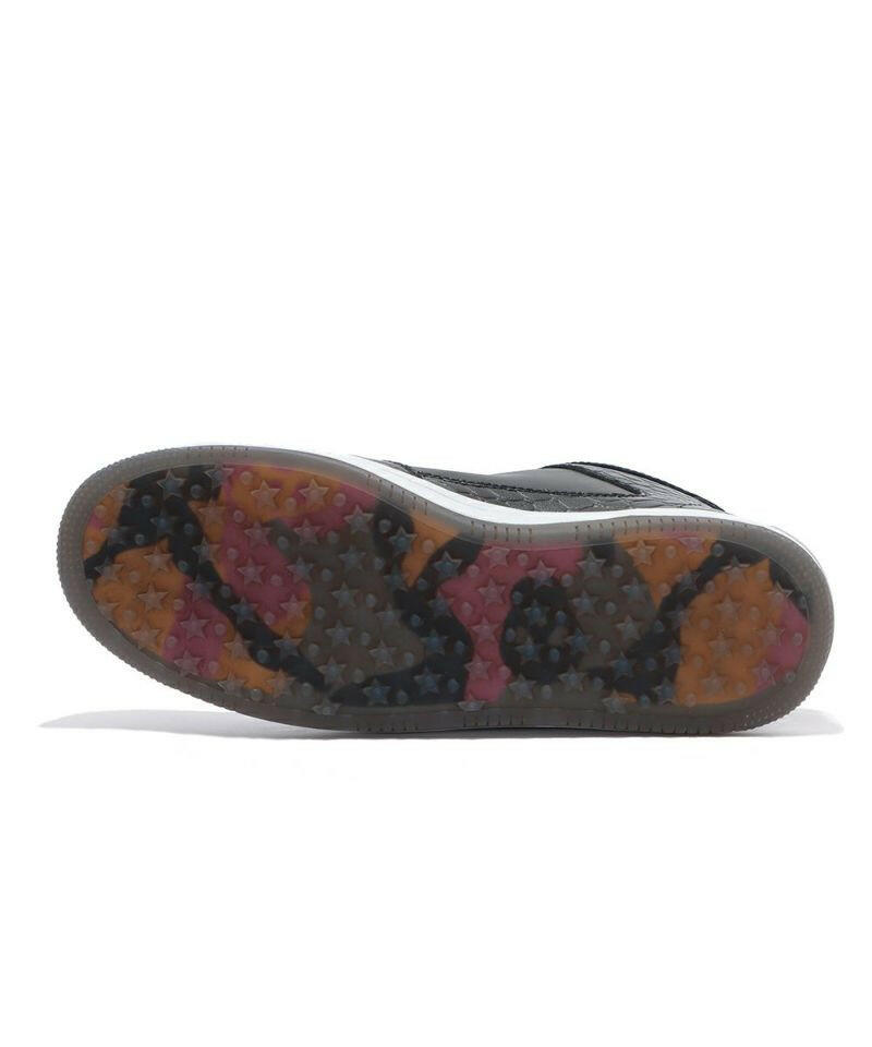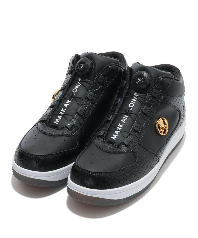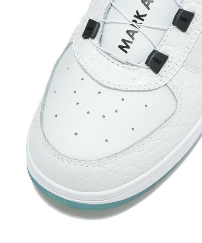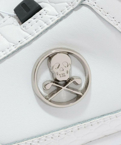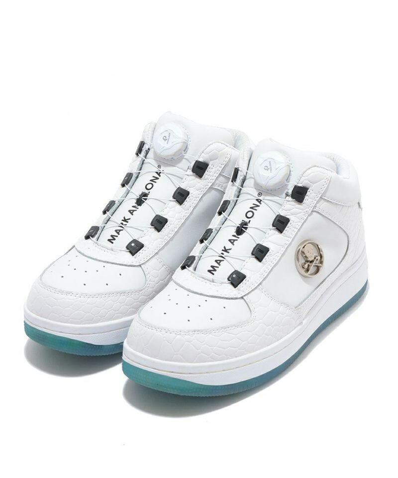 MARK & LONAらしいデザイン性の高さと機能性を兼ね備えた、ミドルカットタイプのスパイクレススニーカー。アッパー素材にマットスムースな牛革、セミグロスのクロコダイル型押し牛革を使用。サイドには鏡面仕上げのサークルスカルメタルバッジ、バックにはスカルスタッズを配し、シンプルな機能美によって高級感と存在感のある仕上がりになっています。ソールにはオリジナルのクリアアウトソールを採用。さまざまな凹凸をつけた星型スパイクがしっかりと芝を捉え、あらゆるコンディションのゴルフコースで機能的にプレイを助けます。そのクリアソールから透けて見えるのは、MARK & LONAを代表するスカルカモフラージュ。シンプルなアッパーとコントラストのあるポップな配色が、ショットの後や歩く際に見え隠れします。また、ミッドソールにもボックスロゴ入りです。