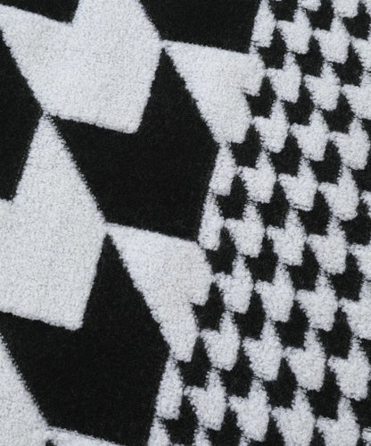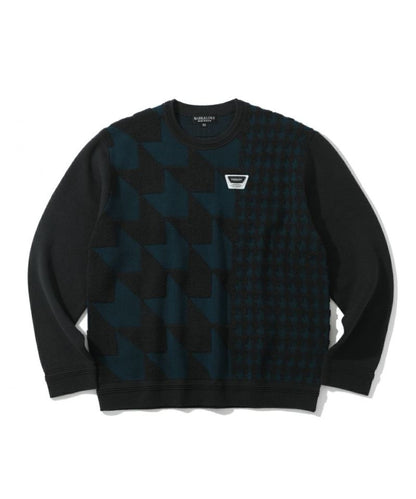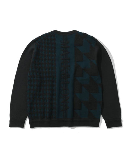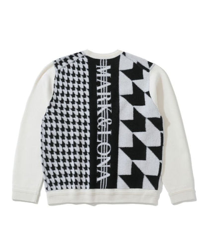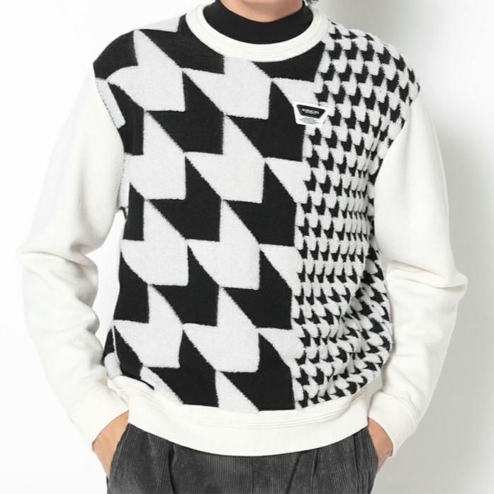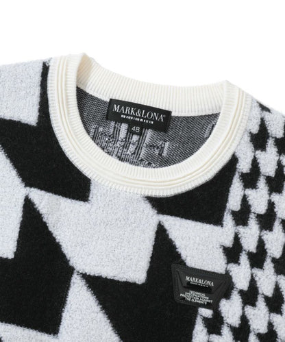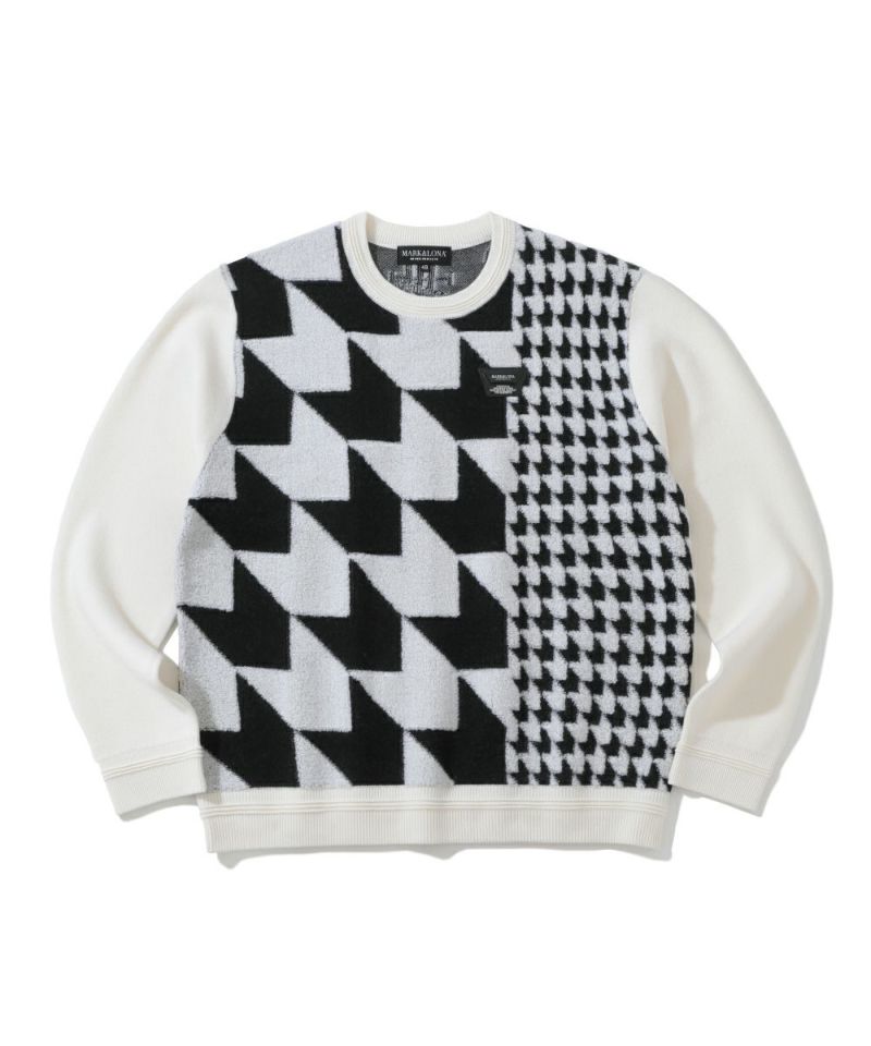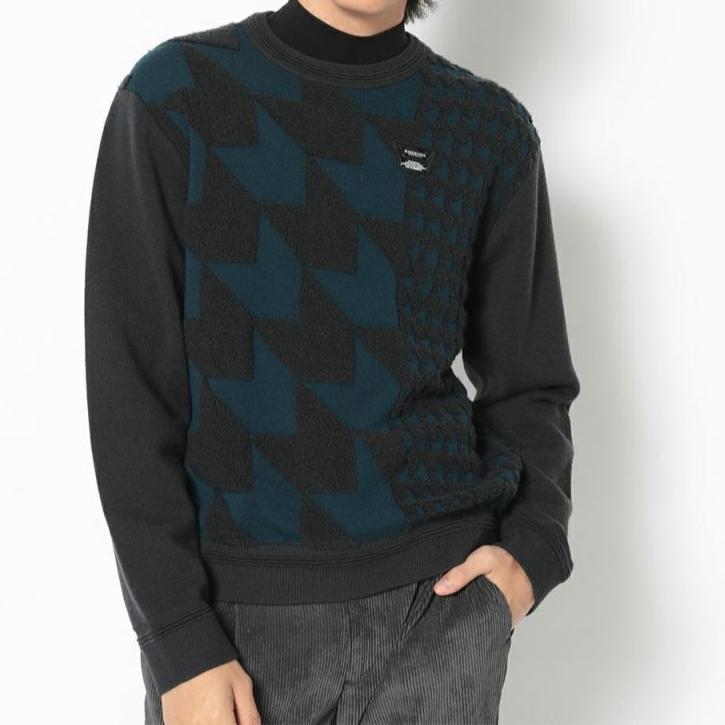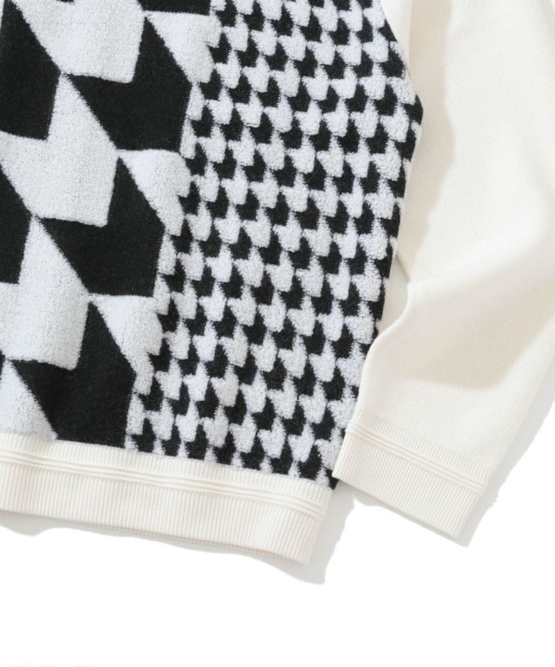 大小のハウンズトゥースチェックパターンが印象的なロングスリーブニット。身幅に少しゆとりをもたせたレギュラーフィットシルエット。パイル状の特殊な編み方でオリジナルのハウンズトゥースをジャカードで表現。素材はオーストラリアのヴィクトリア州で育てられた子羊の繊維が細く長い高品質のラムウール。抜群のやわらかさと温かさで快適な冬のラウンドをサポートします。