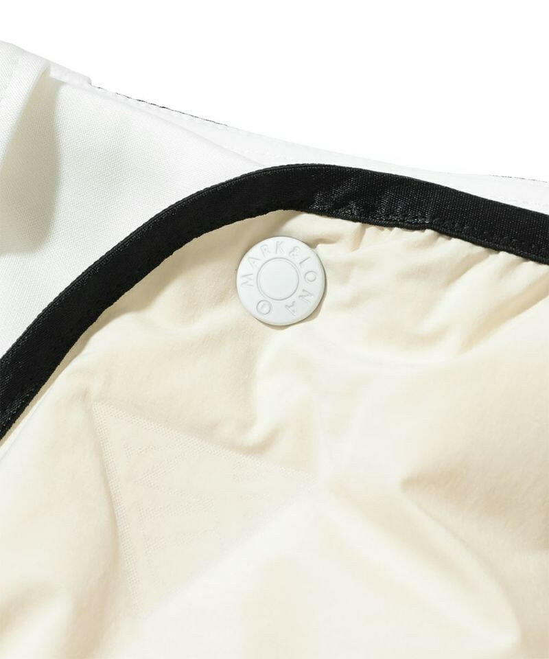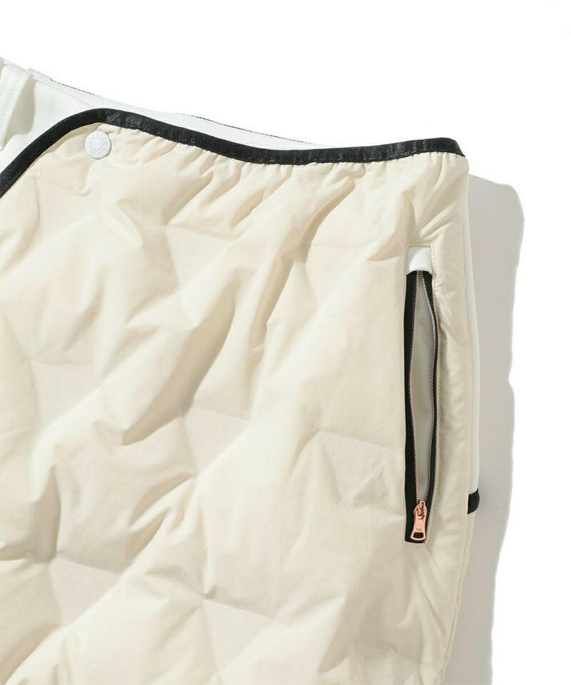 真冬の厳しい環境下にも対応する最先端のダウンファブリックを使用した軽量ラップ風タイトスカート。適度なストレッチ性と高い保温効果により、今までにない穿き心地が感じられます。右前裾にCODEトライアングルロゴのプリント、後ろベルトにCODEシグネチャーロゴをジャカード表現した編み立てリブ、フロントにロゴが刻印されたラバータッチのプランサーボタン、右後ろベルトループにCODEオリジナルロゴ入り三角カンをあしらいました。レギンスなどの防寒アイテムとの重ね穿きを想定したややゆとりのあるタイトスカートシルエットです。女性の冷えやすいヒップ部分も、ダウン素材で温かく包みこみます。 本体スカートを別布に切り替えることにより、スッキリとしたシルエットを実現。OFFはリブとパイピングのカラーを配色に、BLKは身頃と同色を使用し、イメージの異なる色展開にしています。同素材を使用したアウター(MCW-3D-AD56)とのセットアップデザインです。