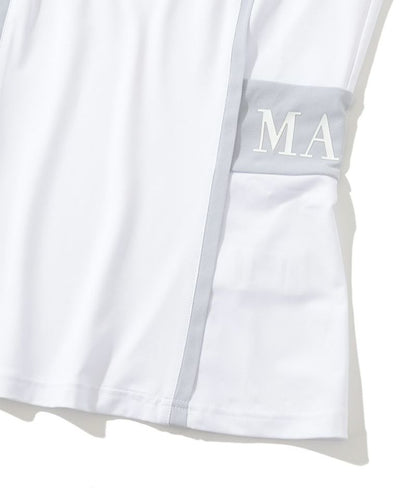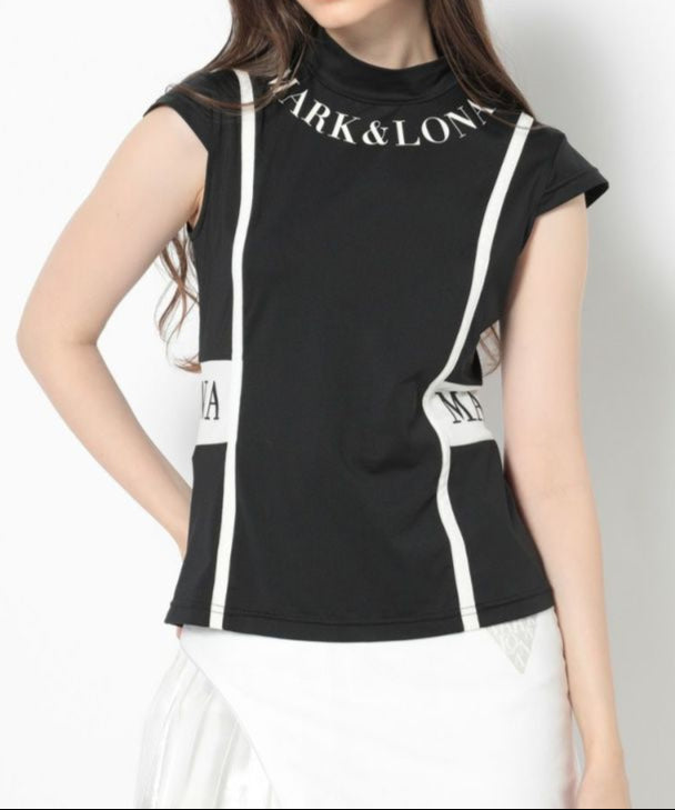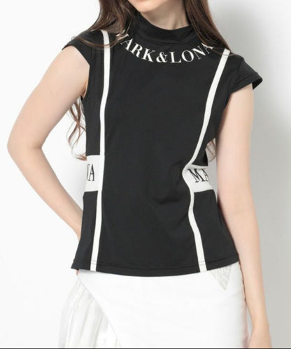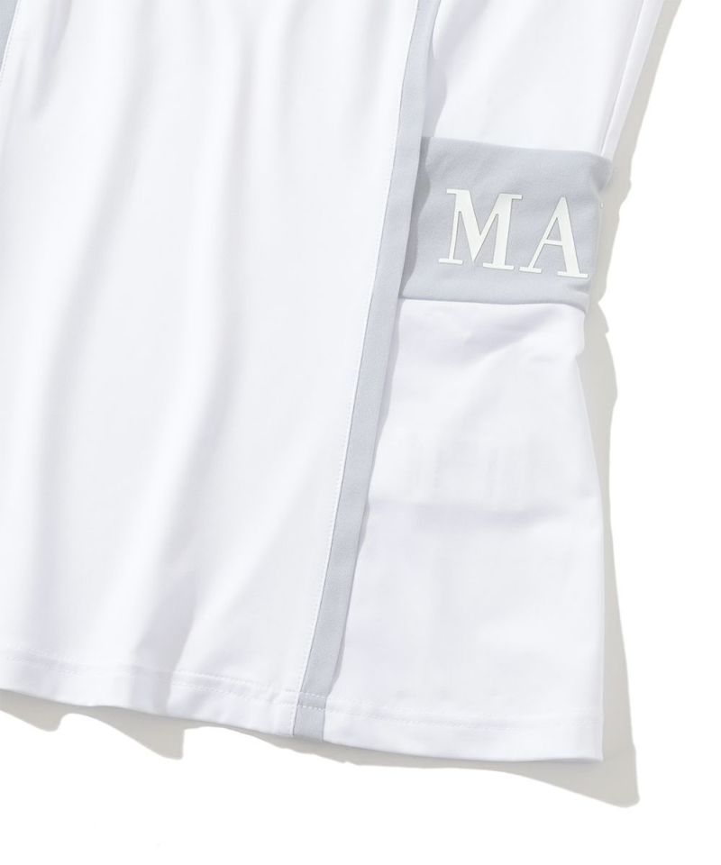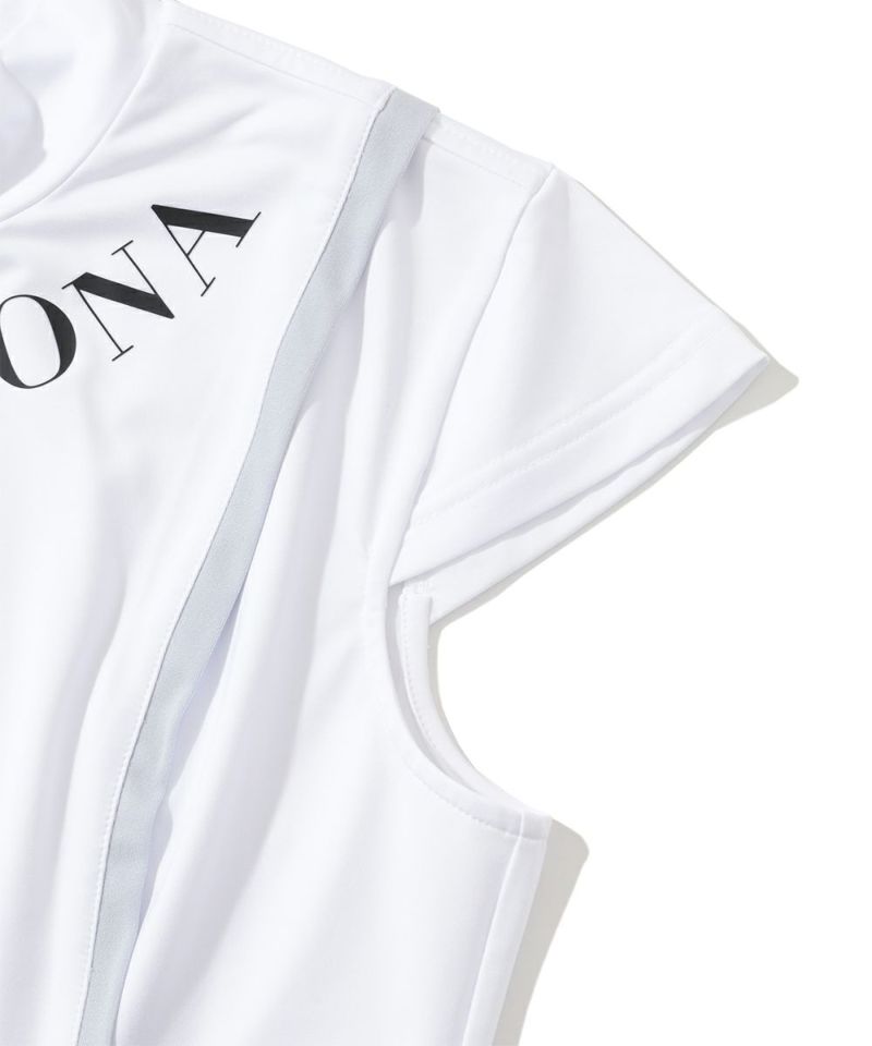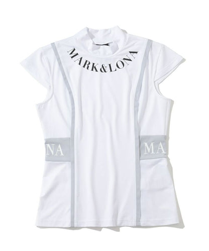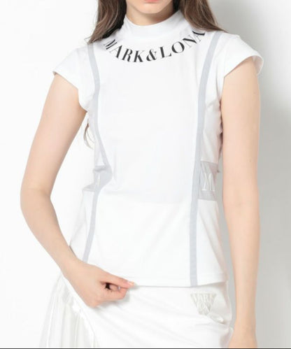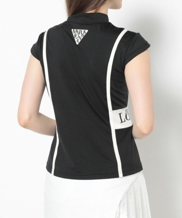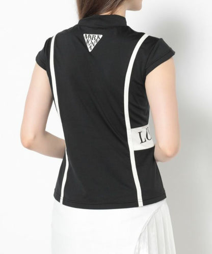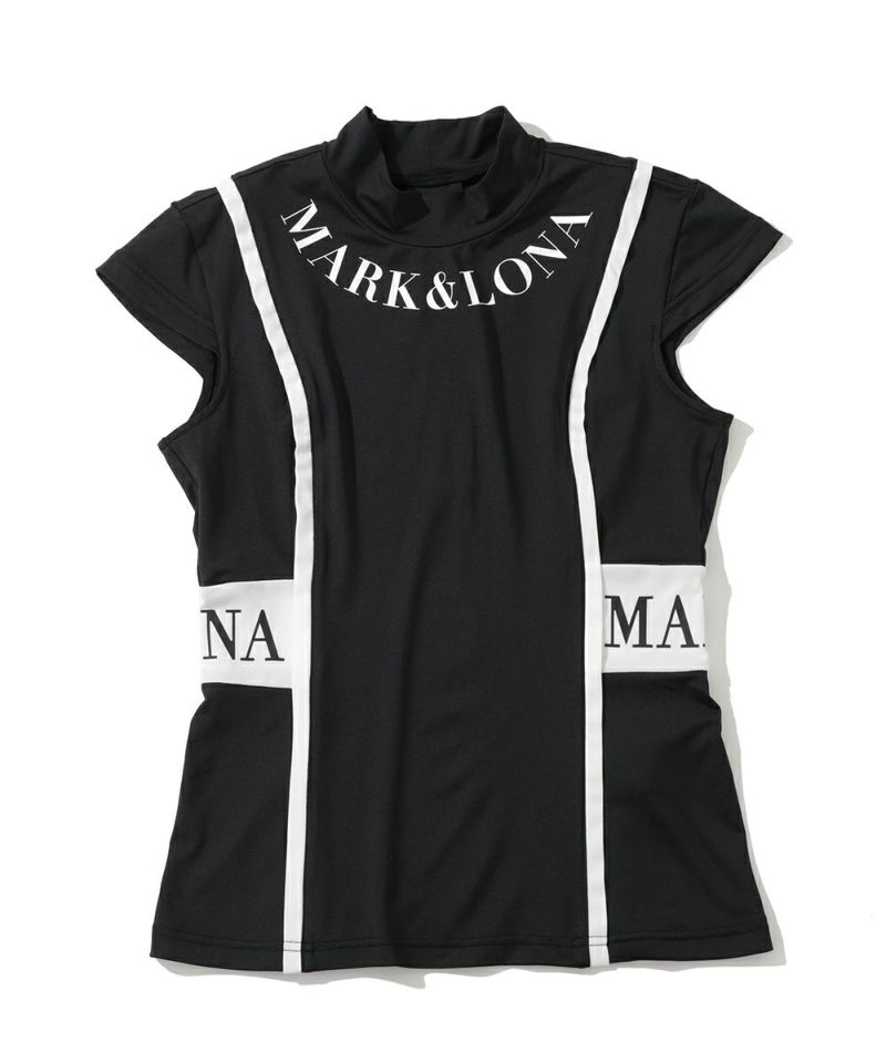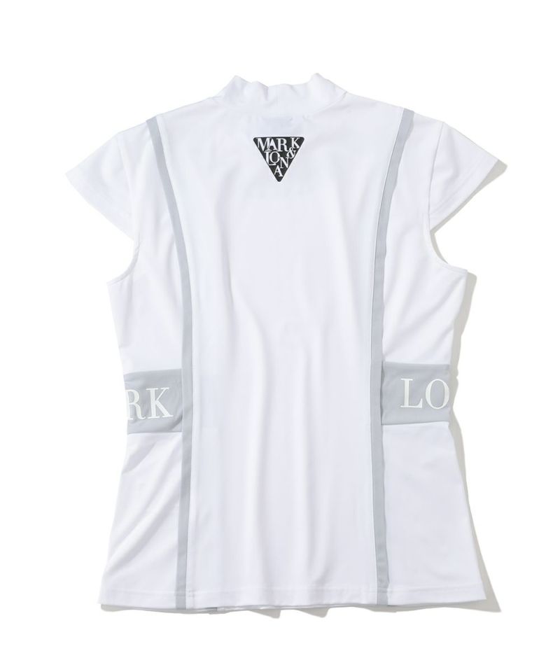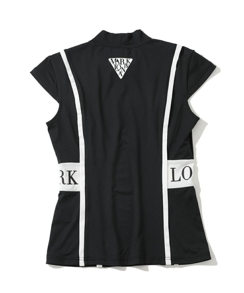 切り替えた配色のパイピングが特徴的なキャップスリーブのモックネックTシャツ。ドライタッチが特徴のポリウレタン高混率のポリエステルを使用。ロゴプリントが入った両サイドの配色切り替えディティールがポイント。またフロントとバックに施した切り替えのパイピングで細見え効果に。身体の自然なラインに沿ったレギュラーフィットシルエット。スッキリとスタイリッシュにコーディネート可能なアイテムです。