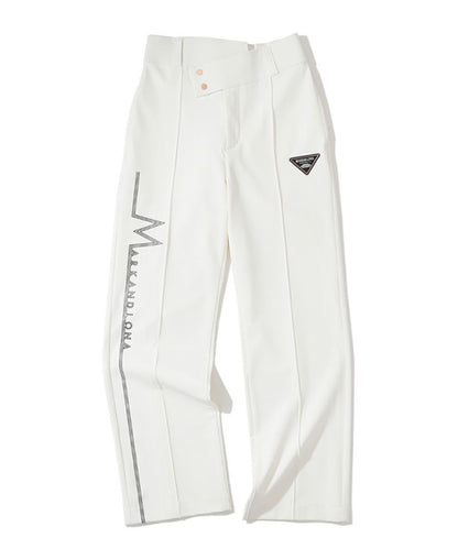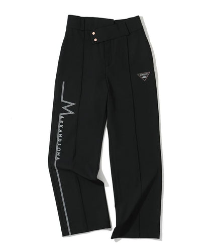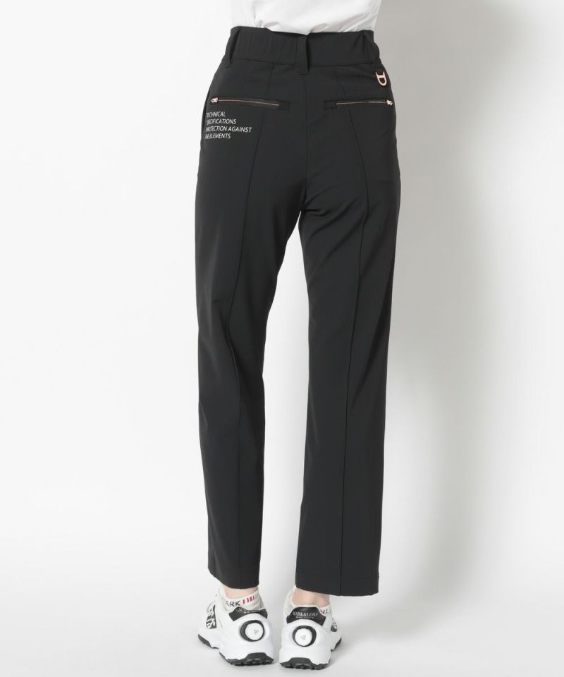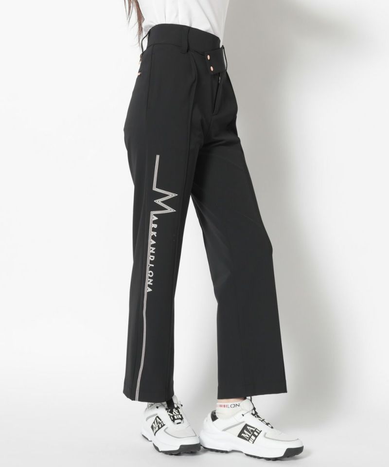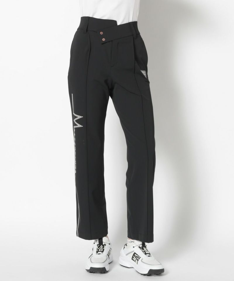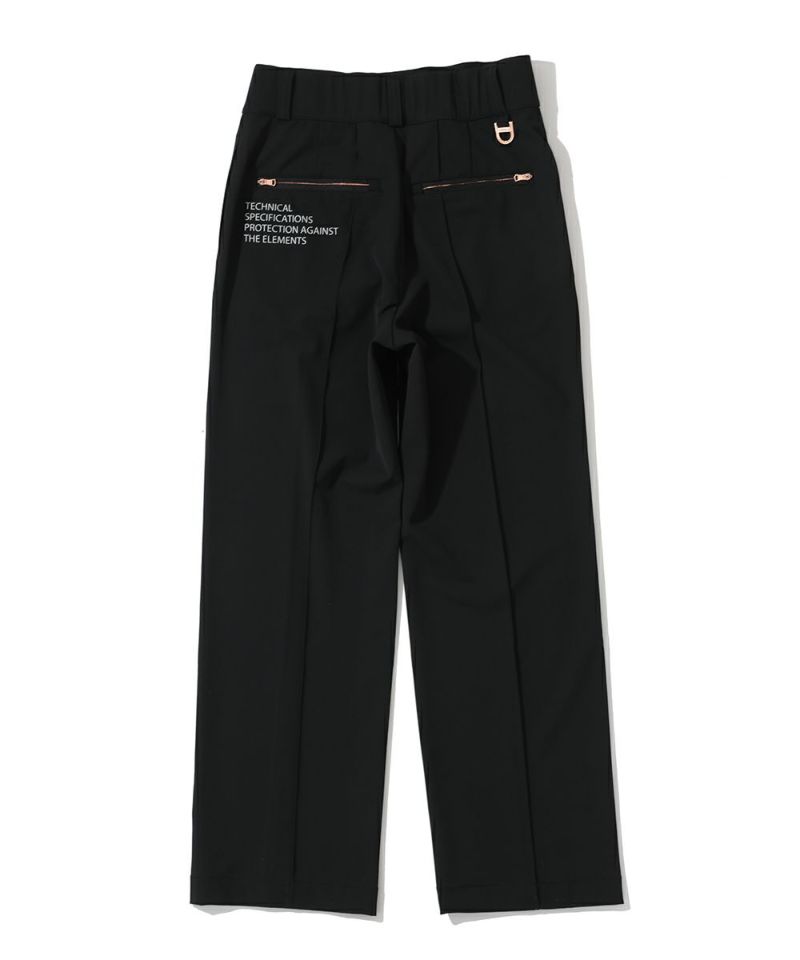 ストレートラインのシルエットが魅力のロングパンツ。ストレッチが効いたドレープ感のあるポリエステル素材を使用。ワンプリーツにフロントのピンタックできれいなシルエットに。またオーセンティックなストレートパンツにウエストのアシンメトリーデザインを取り入れCODEらしいモードなアイテムです。