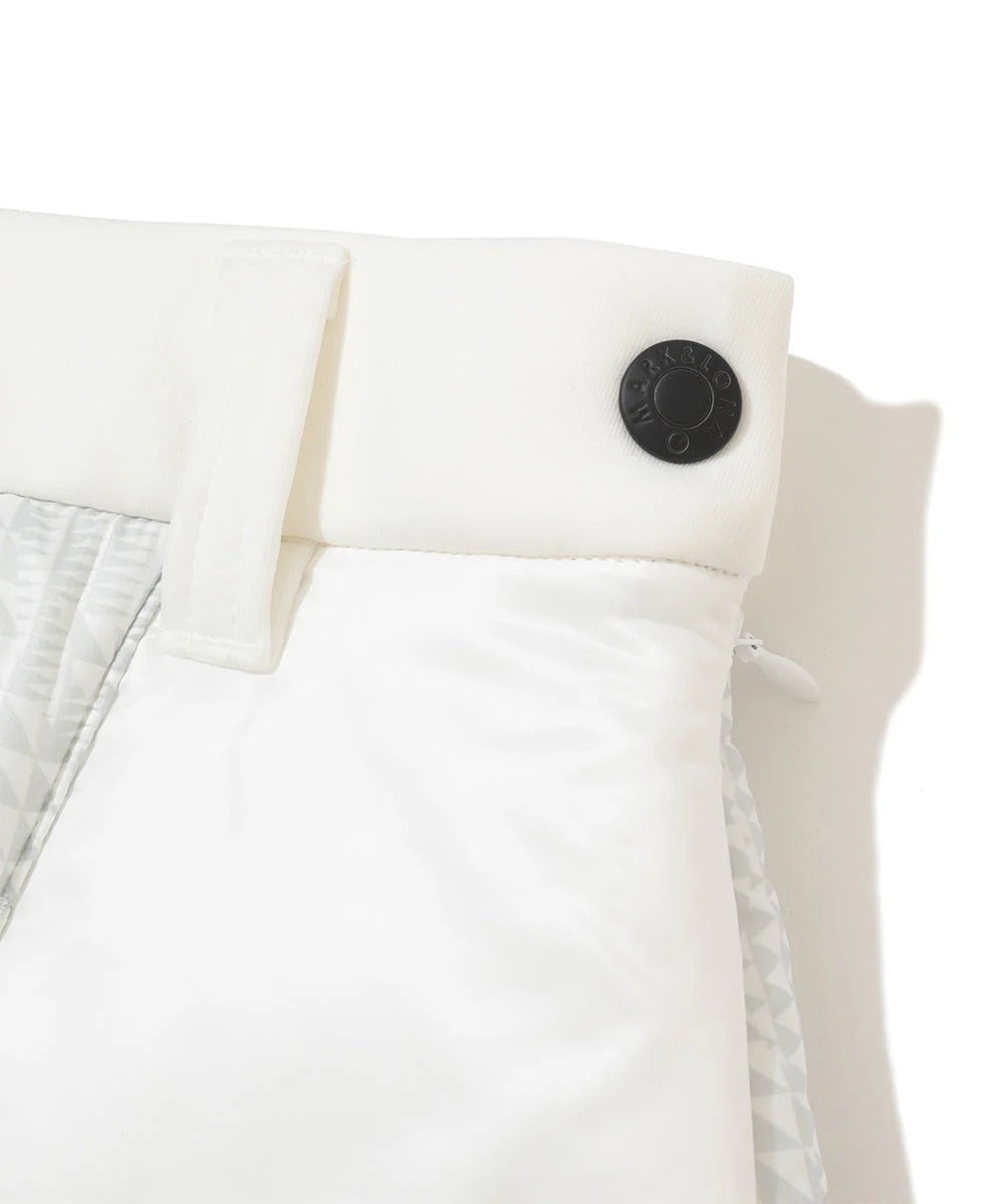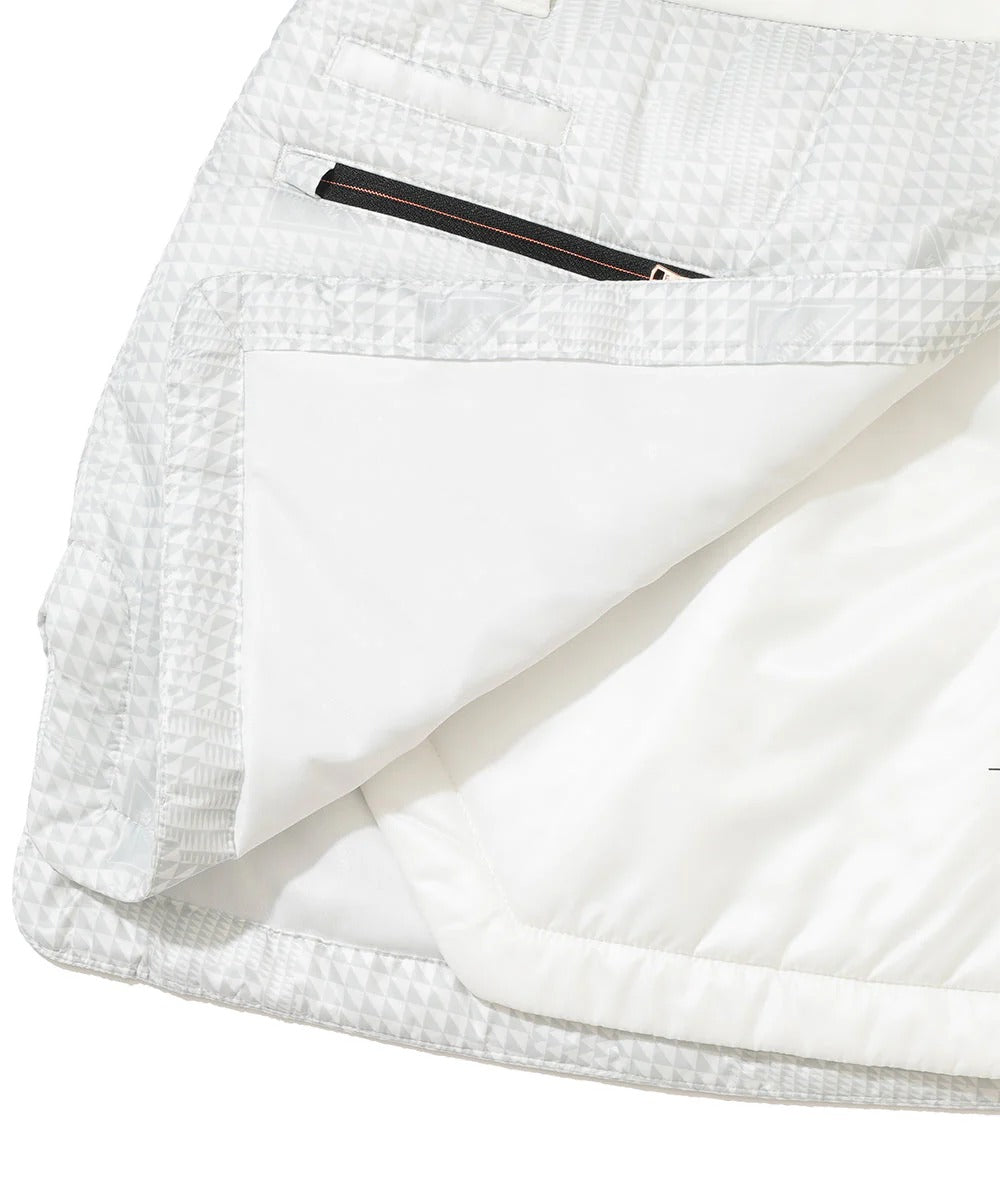 アシンメトリーデザインのダウンスカート。オリジナルのグレンチェックパターンは、ブランドのアイコニックなトライアングルモチーフを巧みに組み込んだこだわりの表現。
