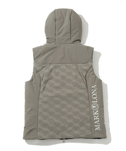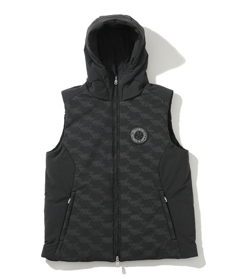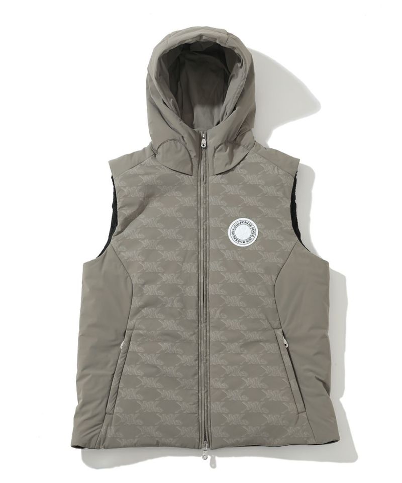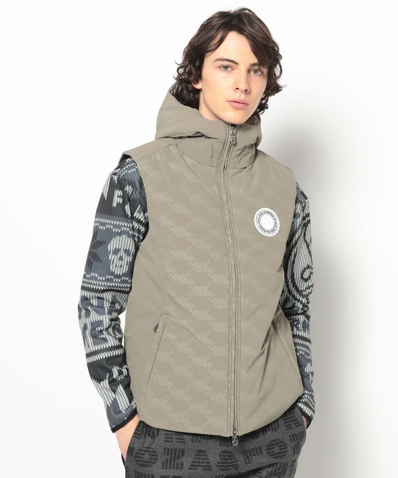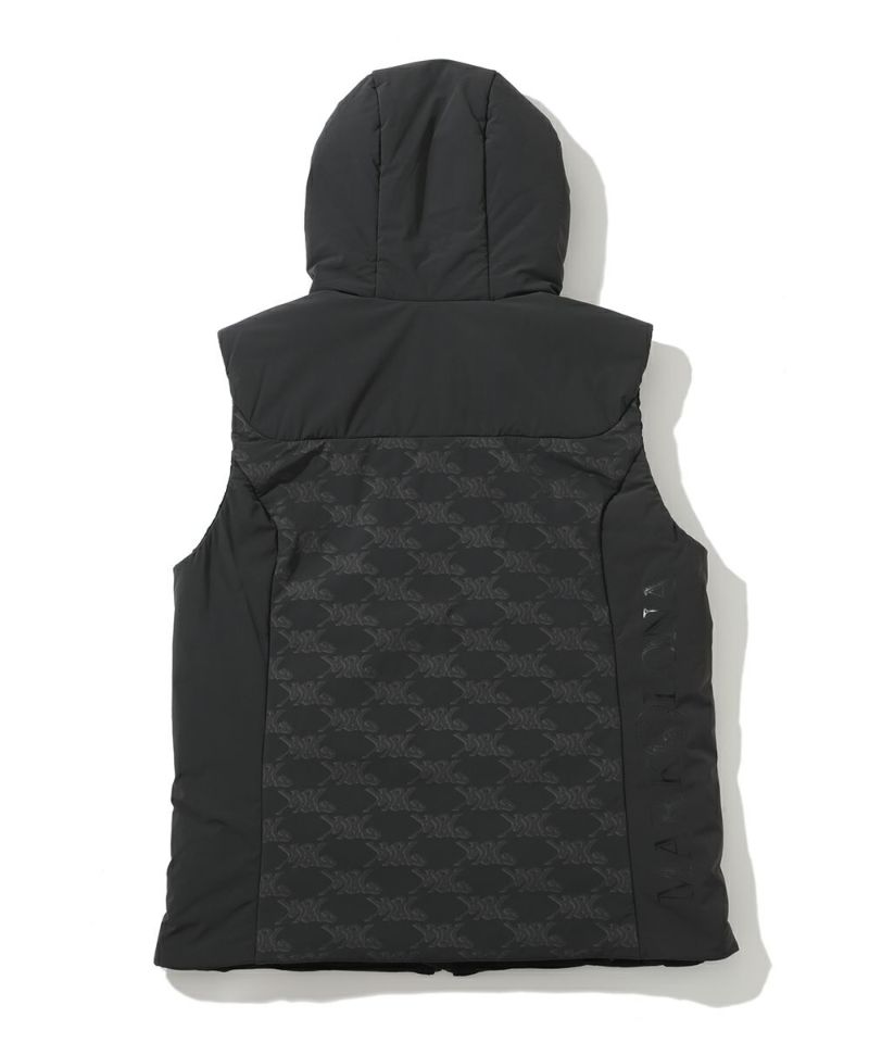 モノグラムパターンをグラフィックに表現し全面プリントした中綿ベスト。スイングに必要なゆとりをキープしながらウエストを程よく絞ったややタイトフィットでシャープなシルエット。裾とフードは風の侵入を防ぎフィット感を高めるアジャスター仕様。表面は撥水性にも優れ、全方向への高いストレッチ性を持ったリサイクルナイロンのタフタ素材を使用。中綿には人工ダウンと呼ばれる高い保温性と耐久性を兼ね備えた【Primaloft®プリマロフト】を使用し寒い日でも暖かさをキープします。ポケット内に装備したアジャスターは片手でコードを引き調整が可能な仕様です。
