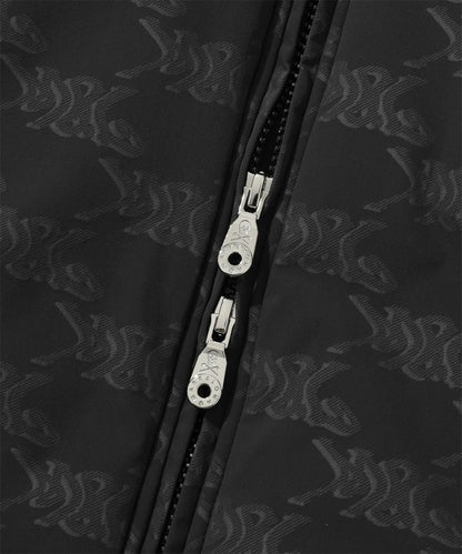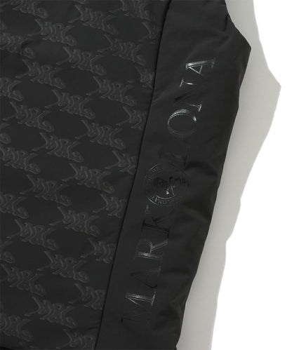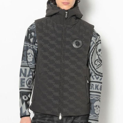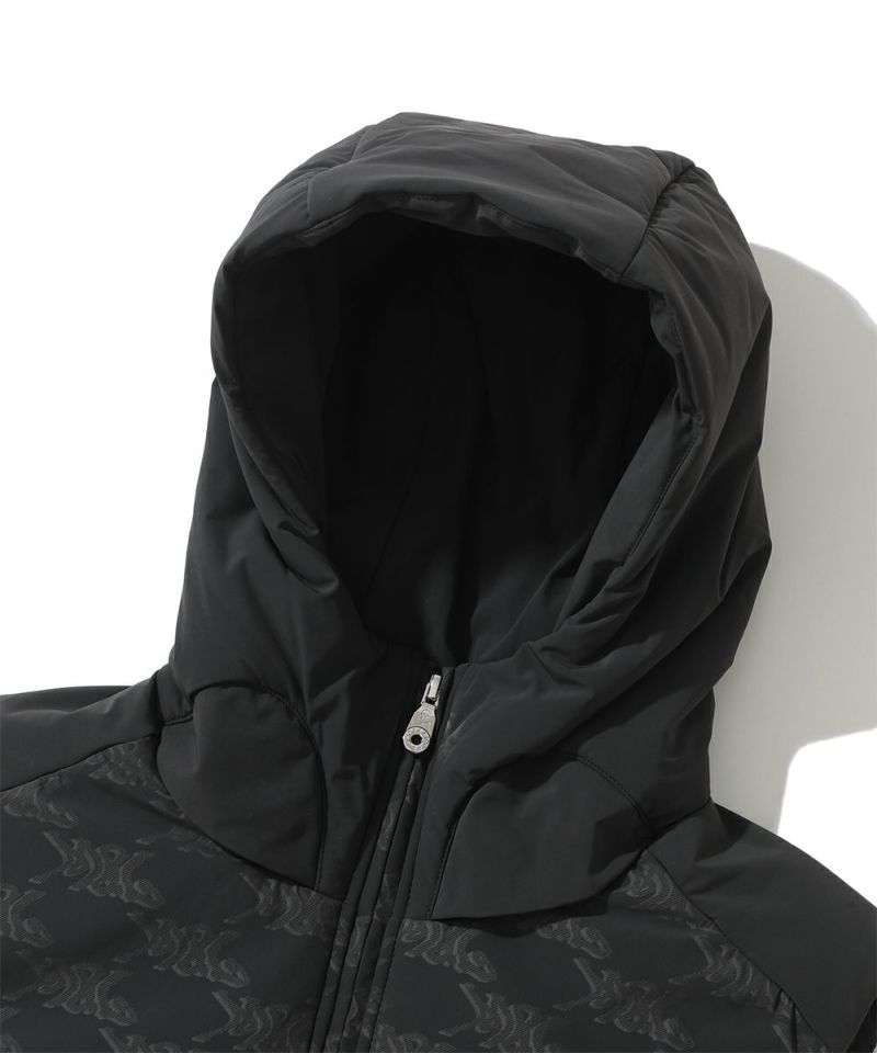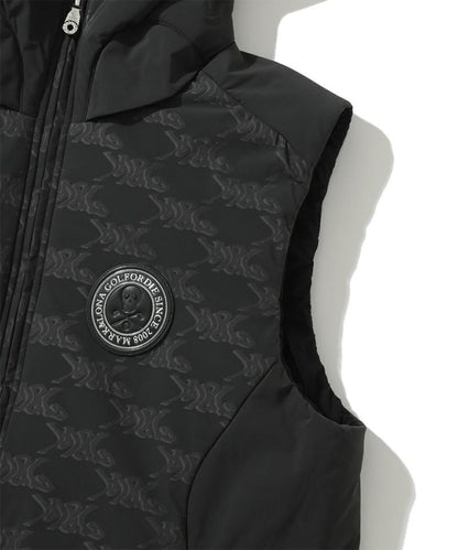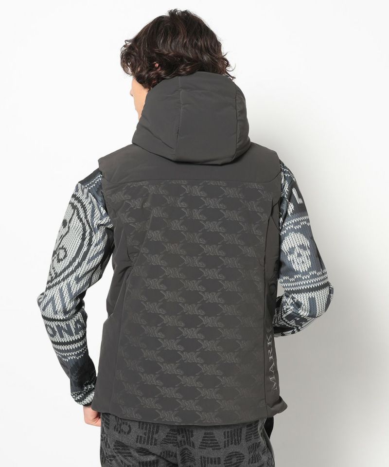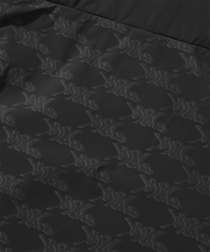 モノグラムパターンをグラフィックに表現し全面プリントした中綿ベスト。スイングに必要なゆとりをキープしながらウエストを程よく絞ったややタイトフィットでシャープなシルエット。裾とフードは風の侵入を防ぎフィット感を高めるアジャスター仕様。表面は撥水性にも優れ、全方向への高いストレッチ性を持ったリサイクルナイロンのタフタ素材を使用。中綿には人工ダウンと呼ばれる高い保温性と耐久性を兼ね備えた【Primaloft®プリマロフト】を使用し寒い日でも暖かさをキープします。ポケット内に装備したアジャスターは片手でコードを引き調整が可能な仕様です。