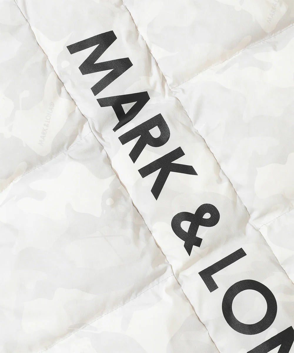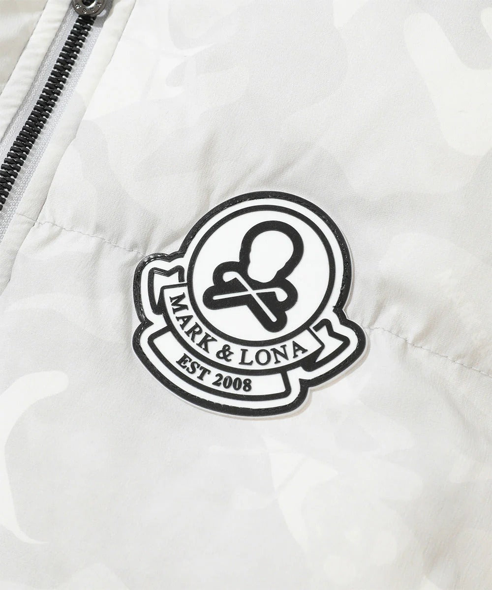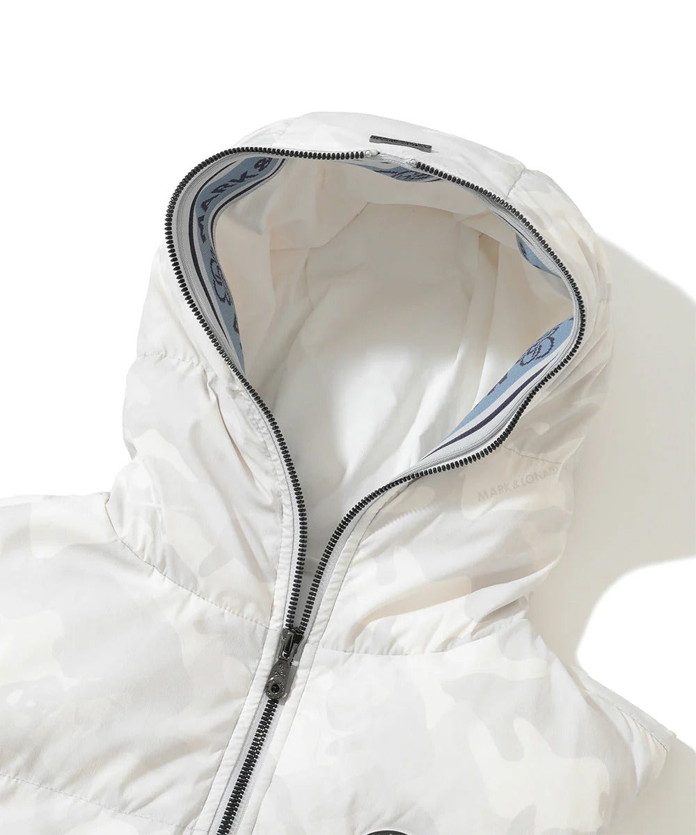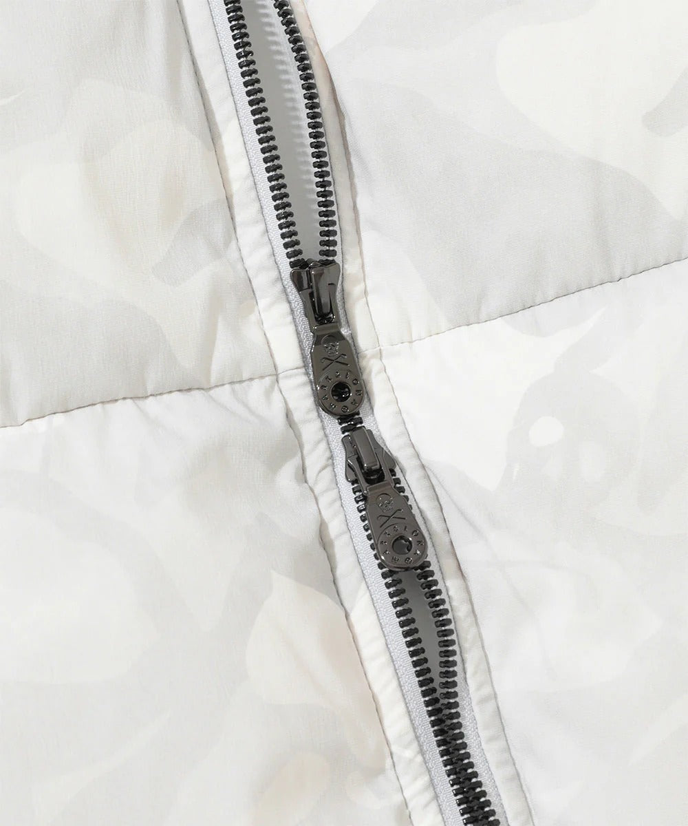 オリジナルカモフラージュパターンのフーデットダウンベスト。