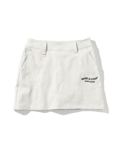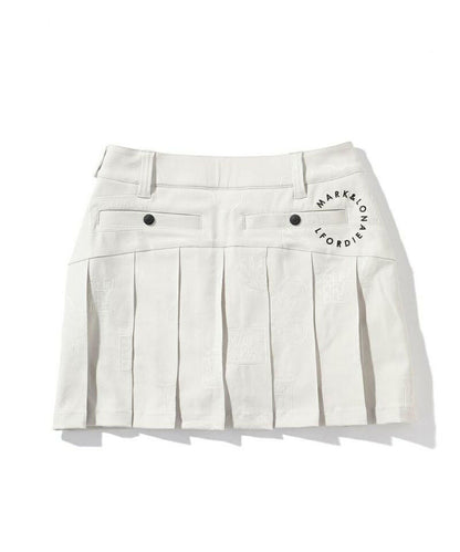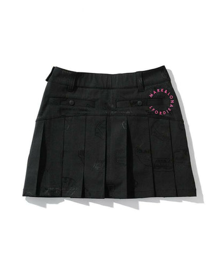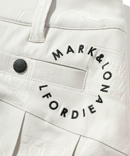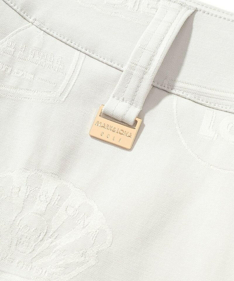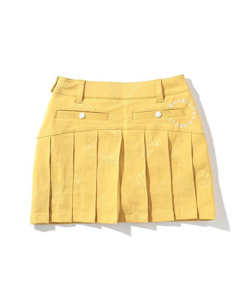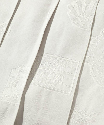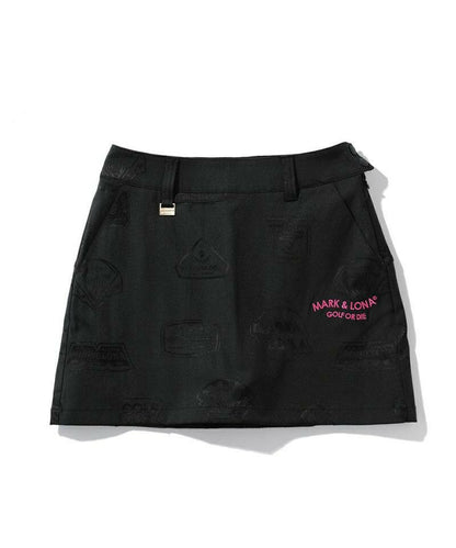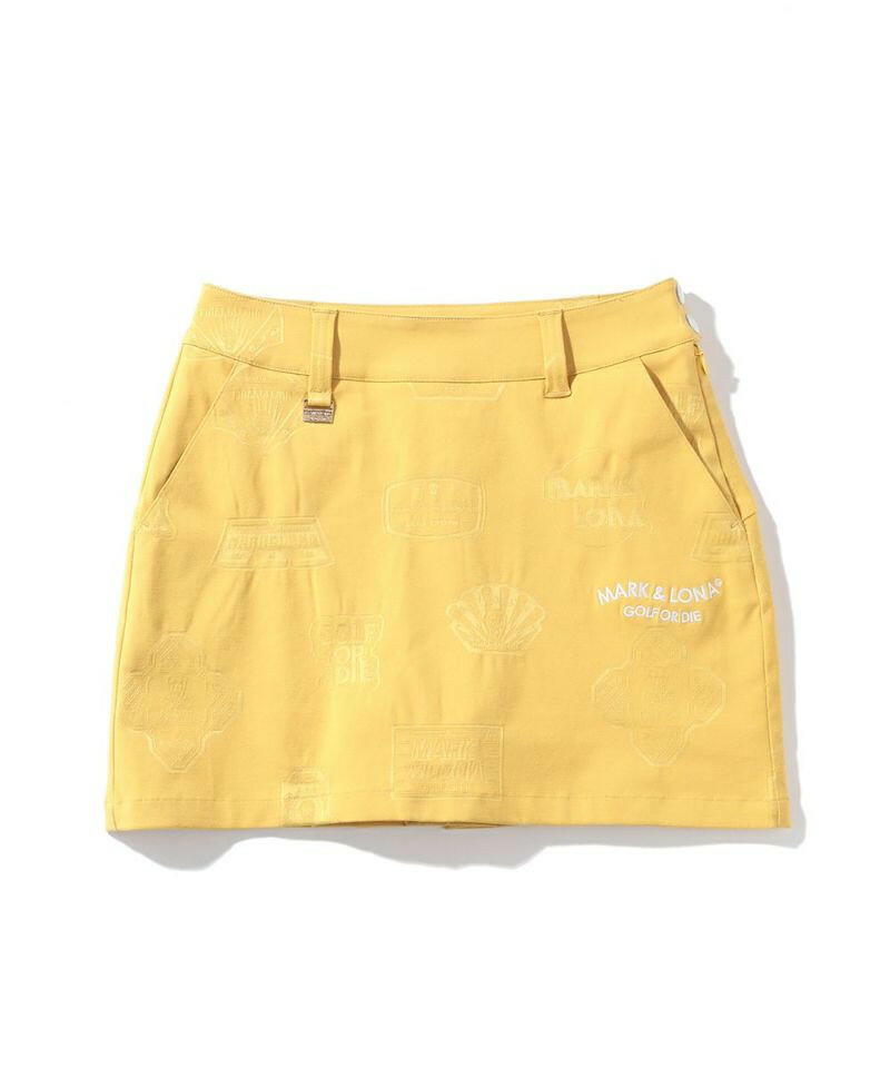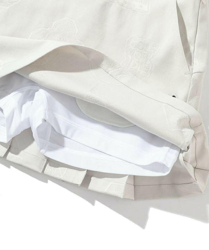 シグネチャーロゴをちりばめたオリジナルワッペンをジャカードで表現し、ワントーンでスポーティなデザインに仕上げたトラペーズスカート。ヒップ側のみプリーツを施し、かわいらしい後ろ姿と足さばきのよさを両立した実用性の高いアイテムに仕上げました。左前スカートにウェーブロゴの刺繍、右後ろポケットにまたがってサークルレタリングロゴの刺繍、ベルトループにロゴ刻印入りミニチャーム、左脇にロゴが刻印されたラバータッチのプランサーボタンを配しました。